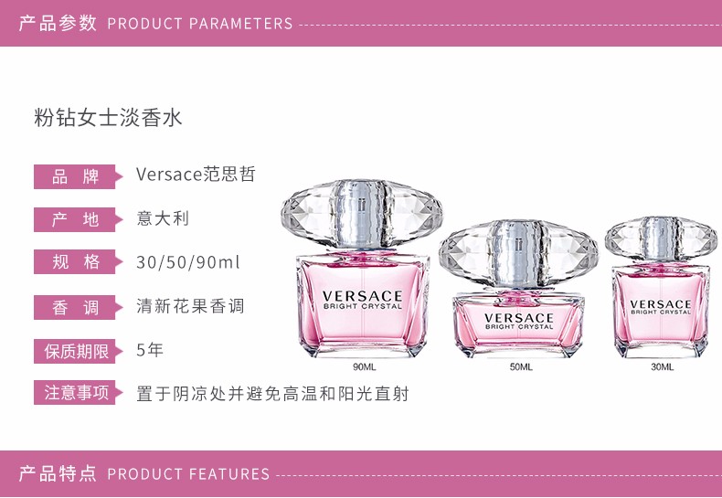 商品名称:Versace/范思哲 粉钻女士淡香水 30ml/50ml/90ml