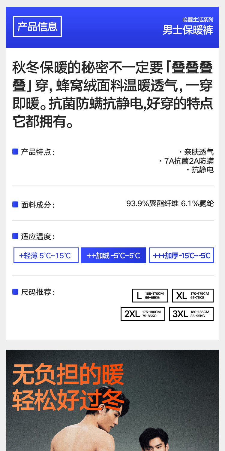 商品名称:【阳离子聚暖 高腰加绒】男士保暖裤男秋裤单件打底裤秋冬款衬裤 001370