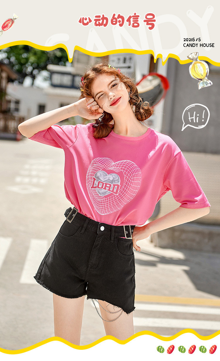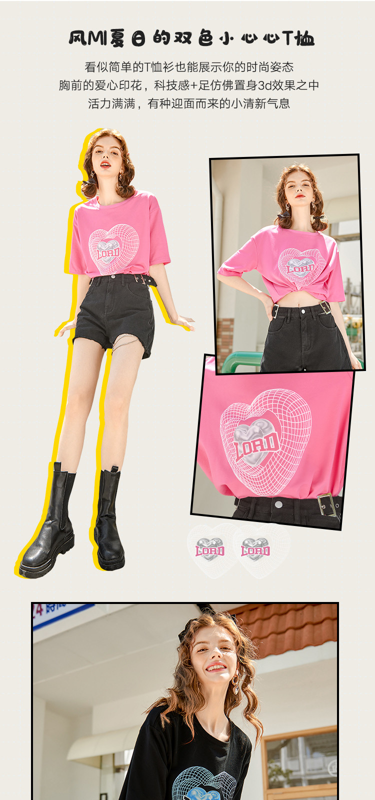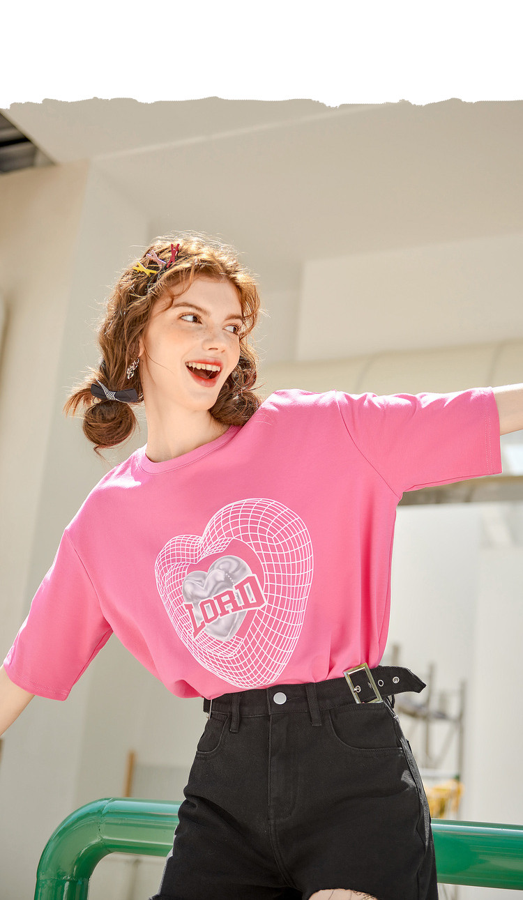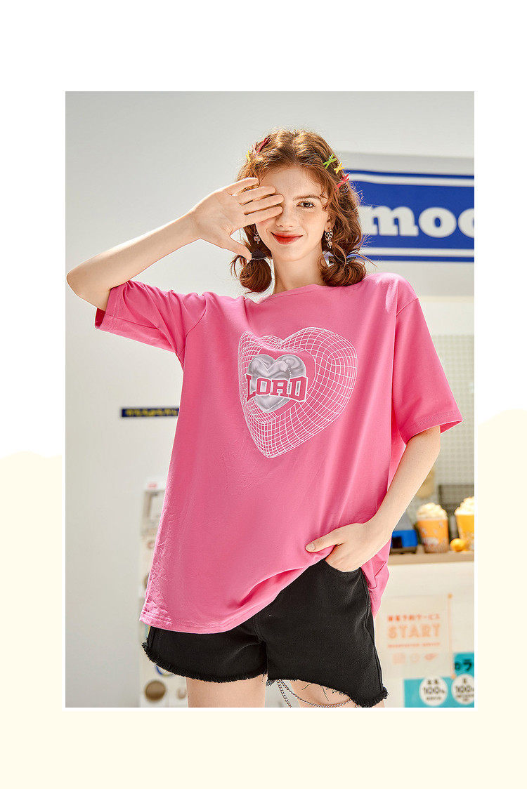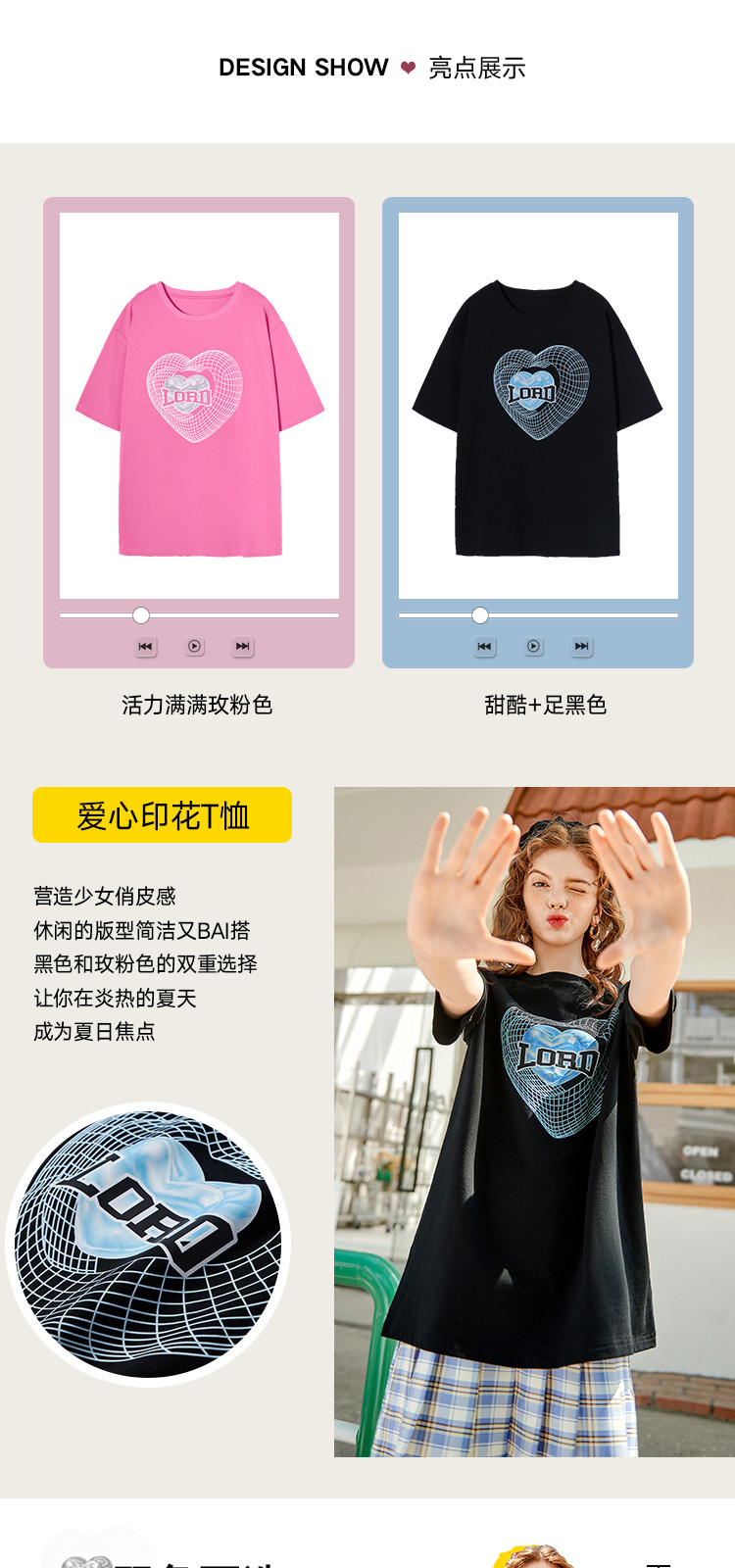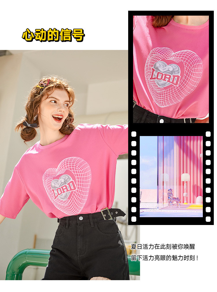 商品名称:夏装国潮粉色爱心短袖女宽松印花半袖上衣T恤潮 008212
