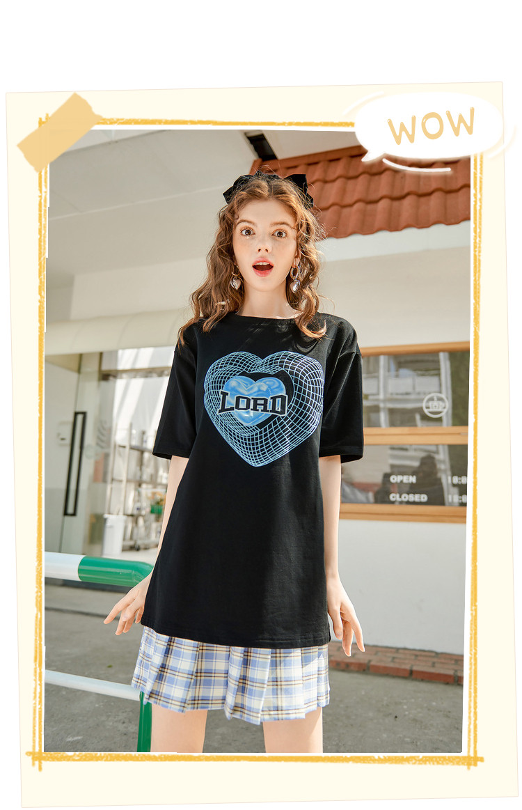 夏装国潮粉色爱心短袖女宽松印花半袖上衣T恤潮 008212