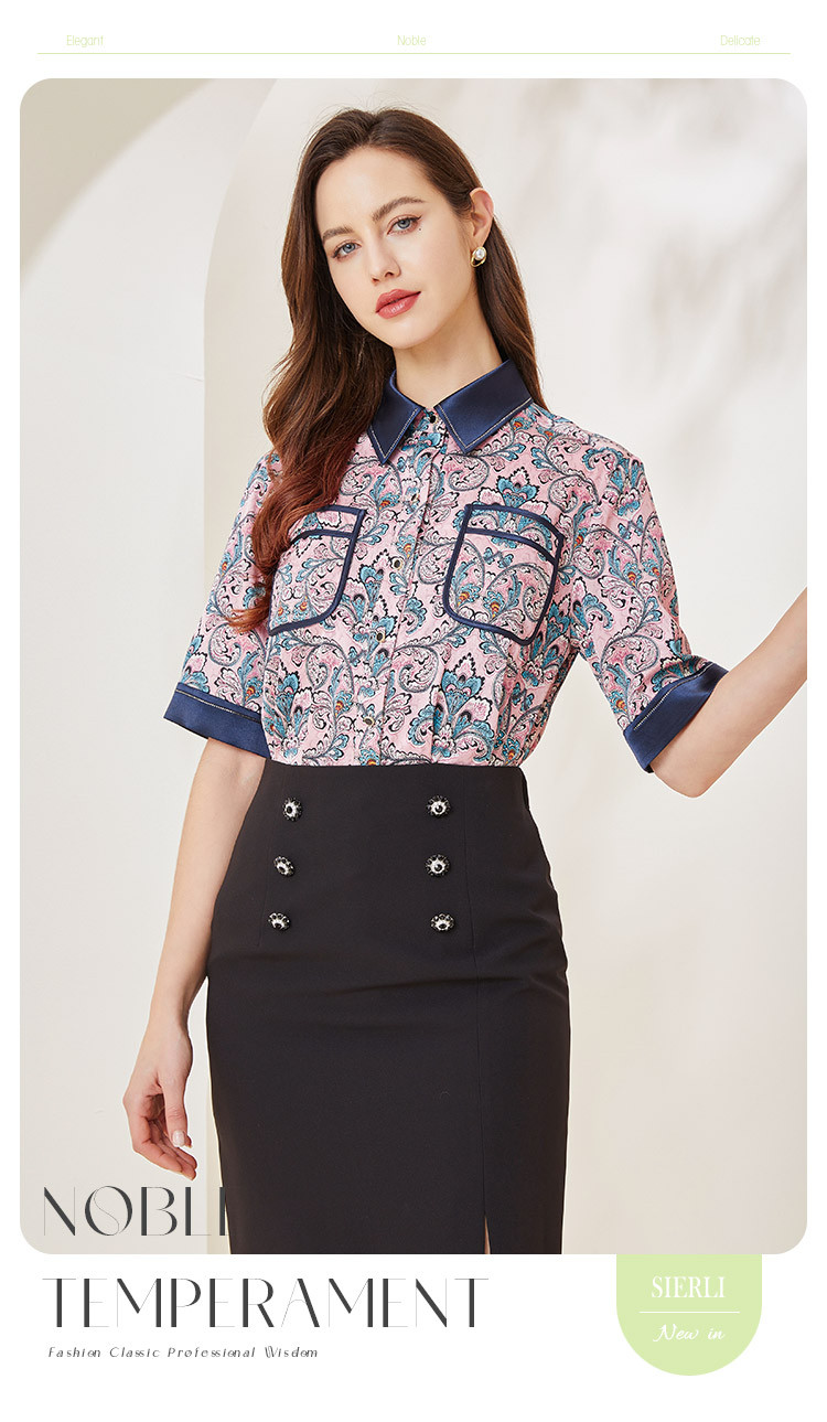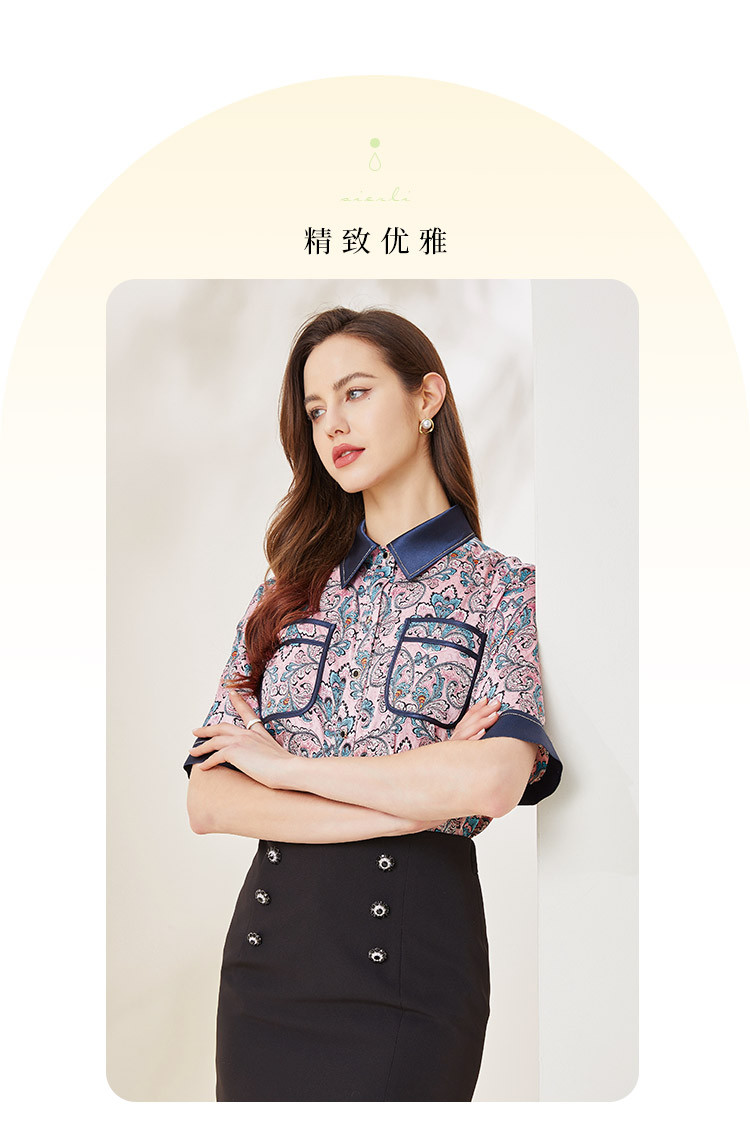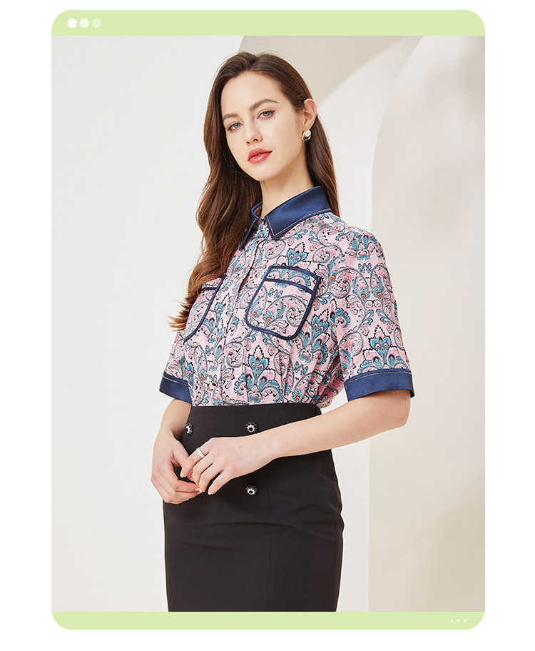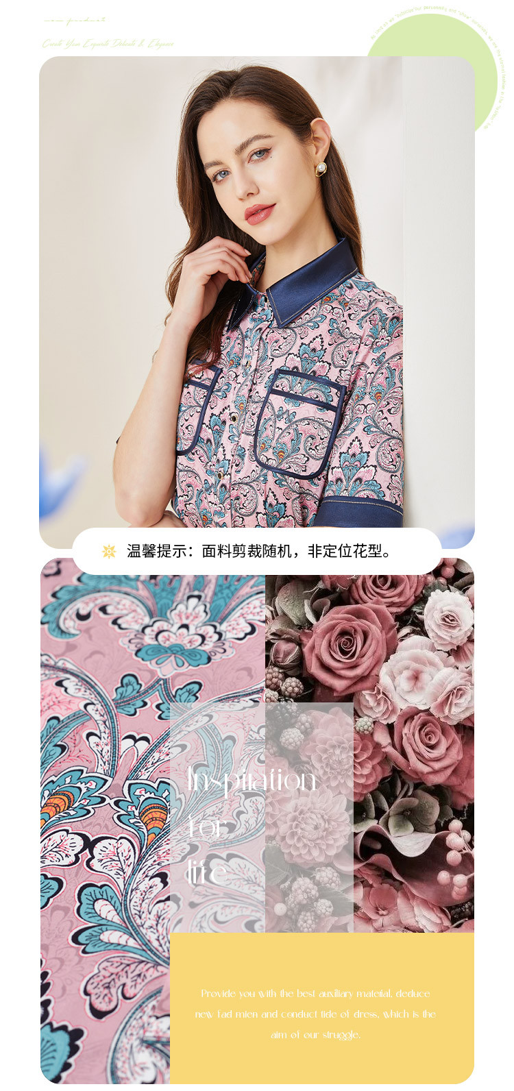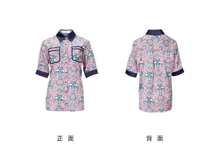 商品名称:商场同款春季复古巴洛克印花撞色滚边贴袋宽松翻领衬衣 475551