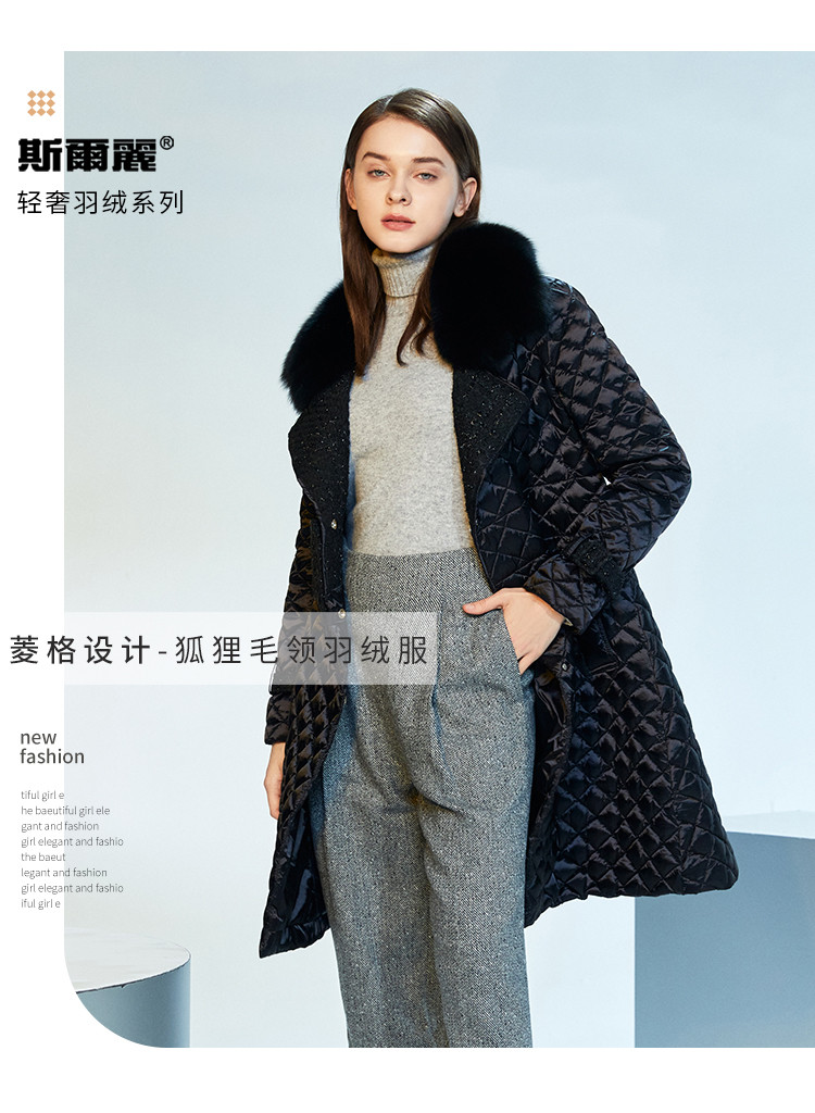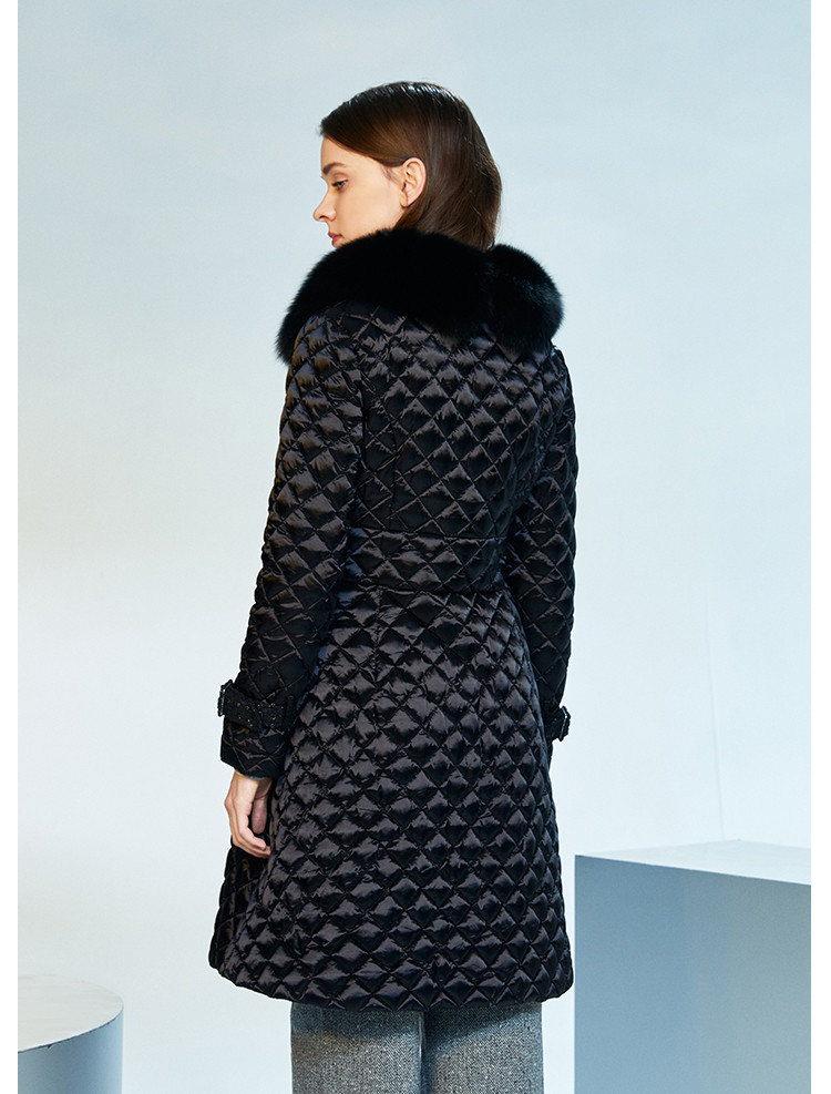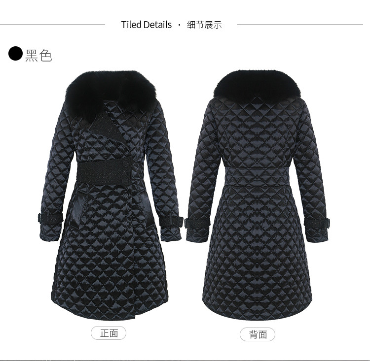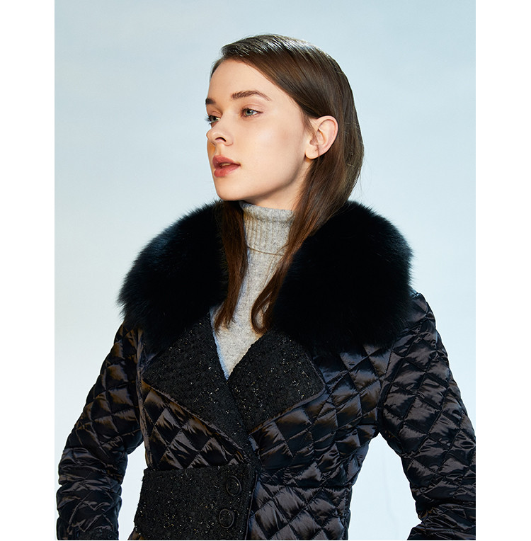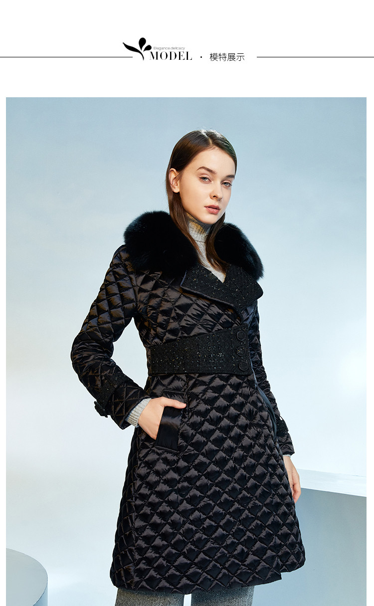 商品名称:小香风狐狸毛领菱形格纹收腰显瘦中长款女士羽绒服 361695