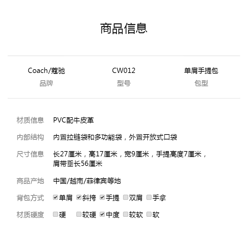商品名称:COACH 奥莱款女士PVC配皮单肩斜挎手提包 CW012IMXAQ