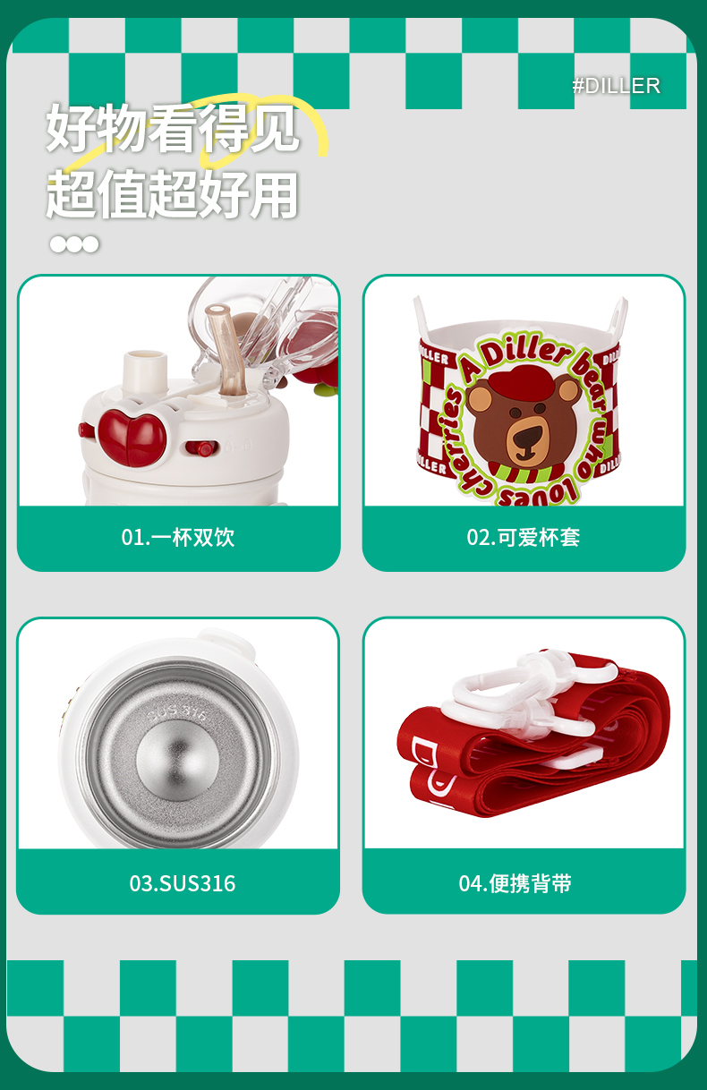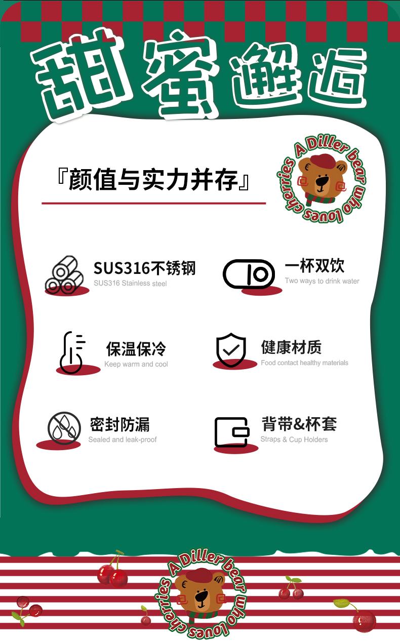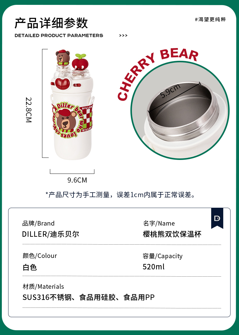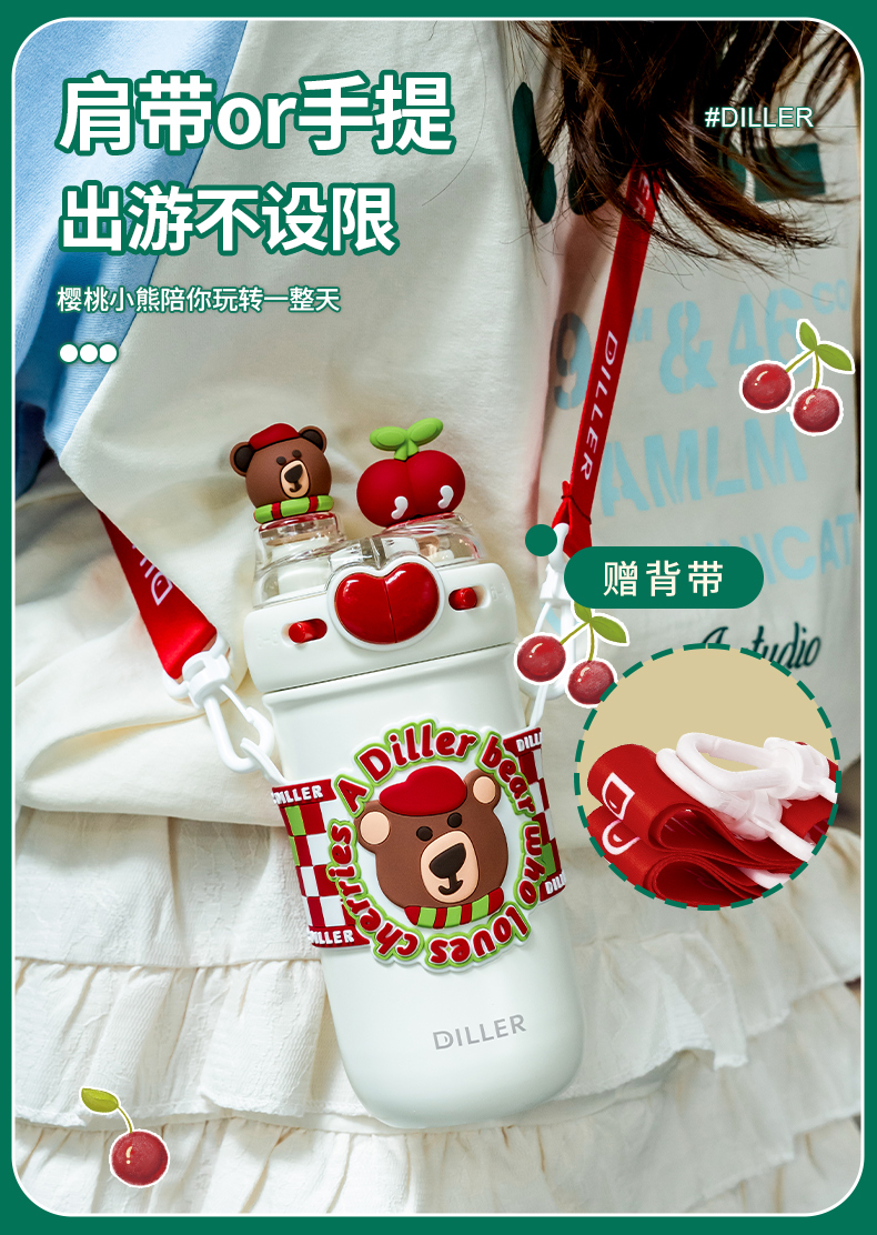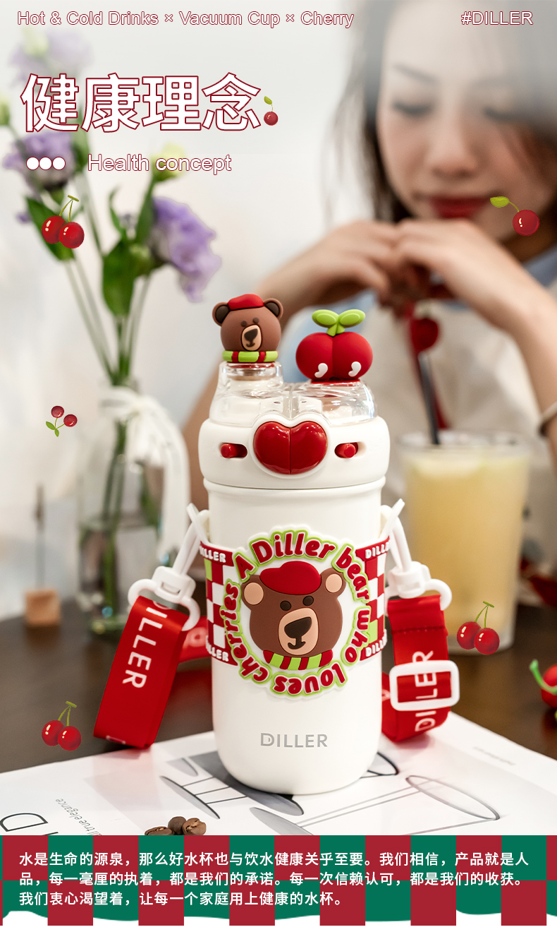 商品名称:迪乐贝尔新品樱桃熊系列保温杯卡通可爱吸管杯直饮杯大容量便携水杯网红爆款双饮杯子