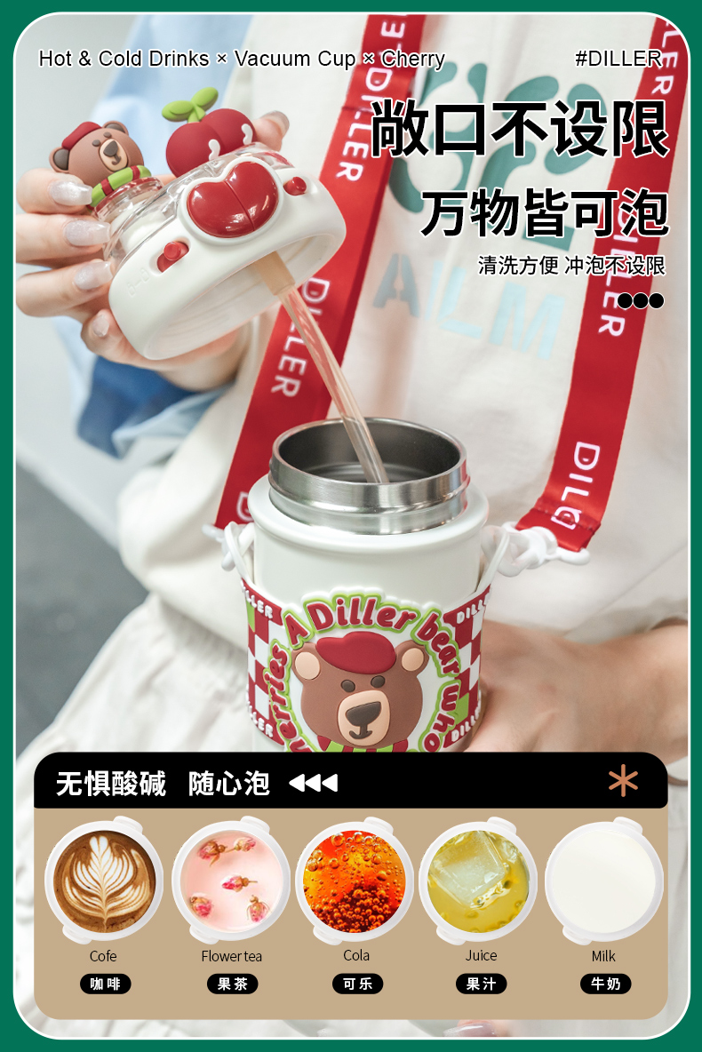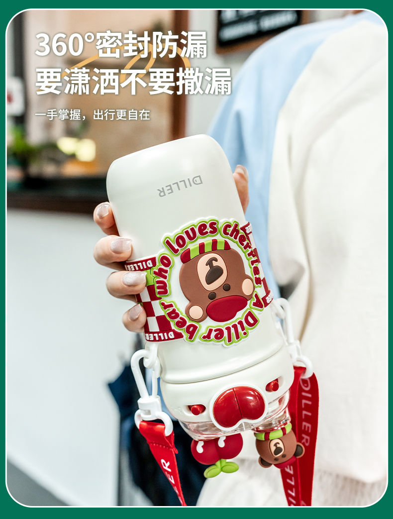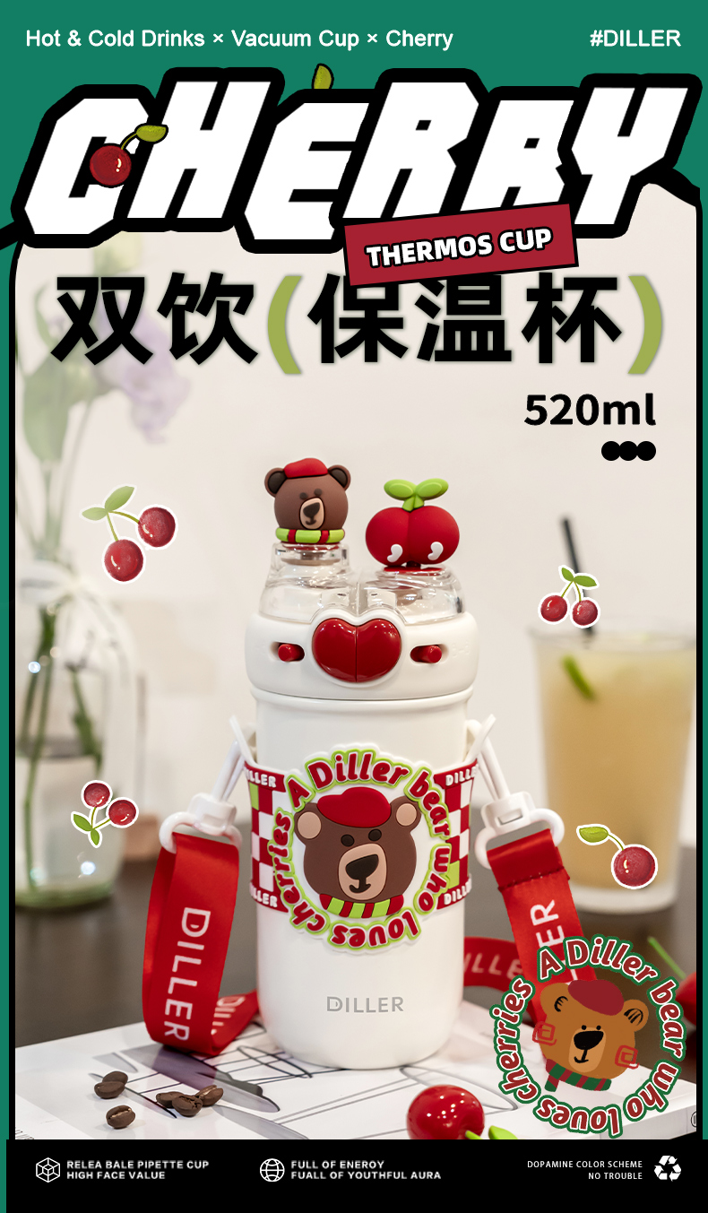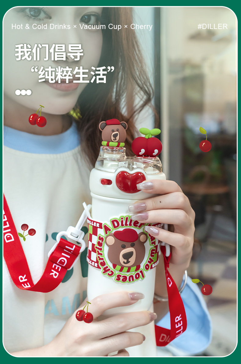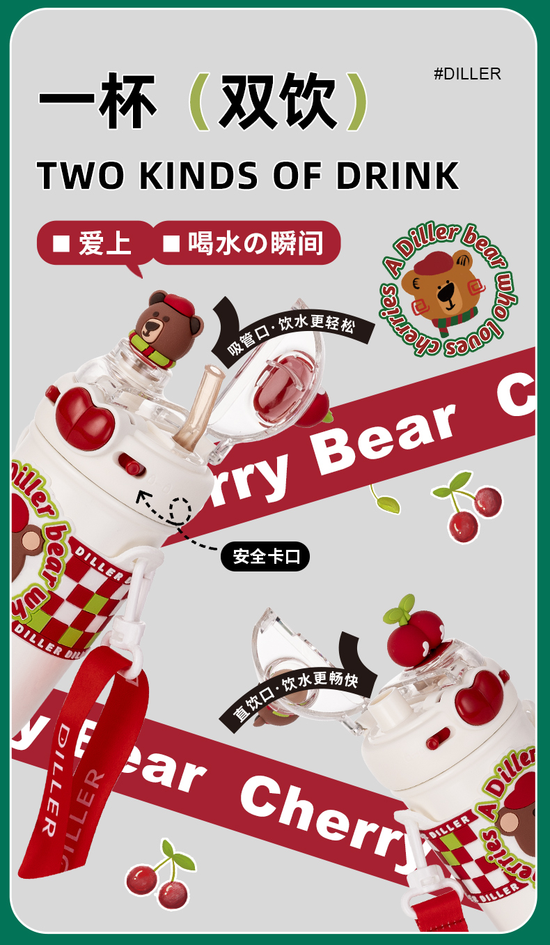 迪乐贝尔新品樱桃熊系列保温杯卡通可爱吸管杯直饮杯大容量便携水杯网红爆款双饮杯子