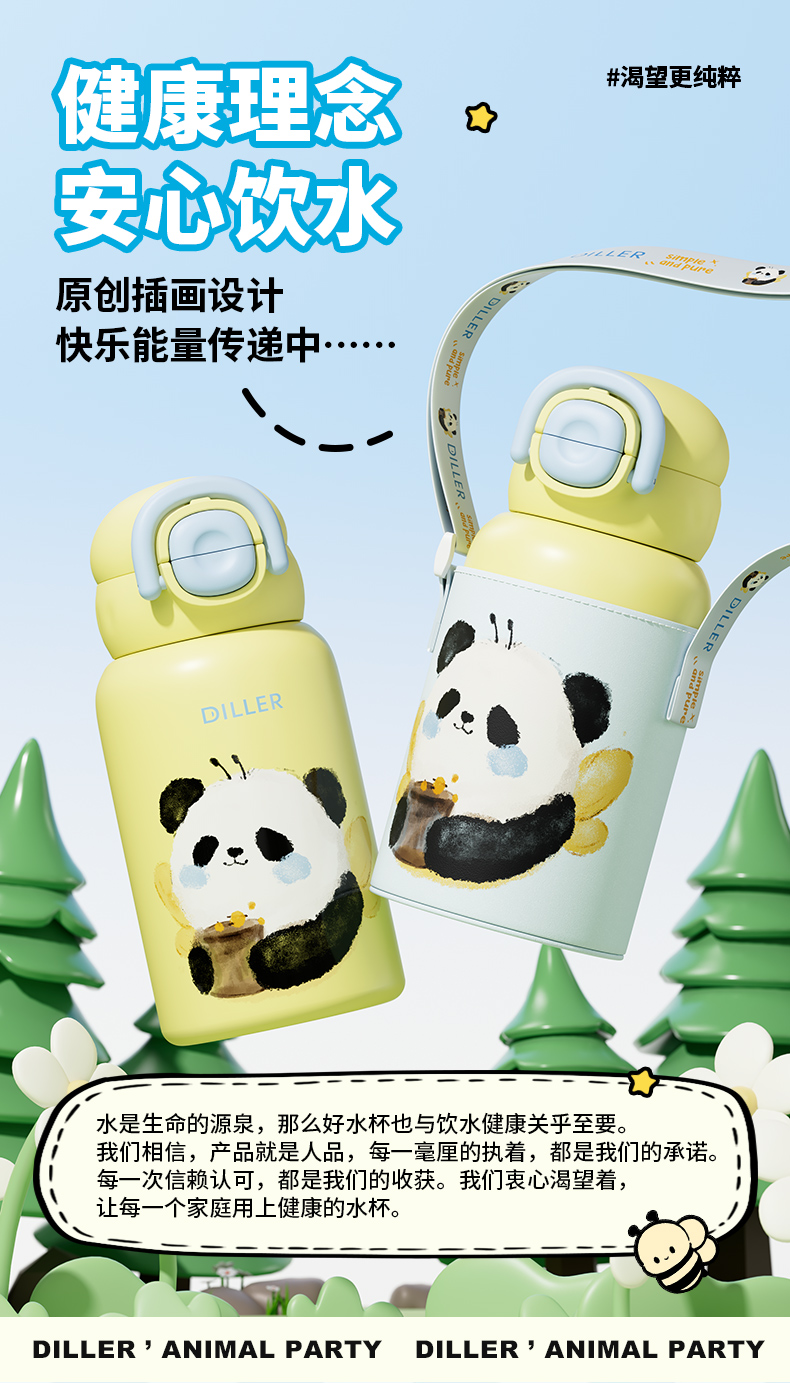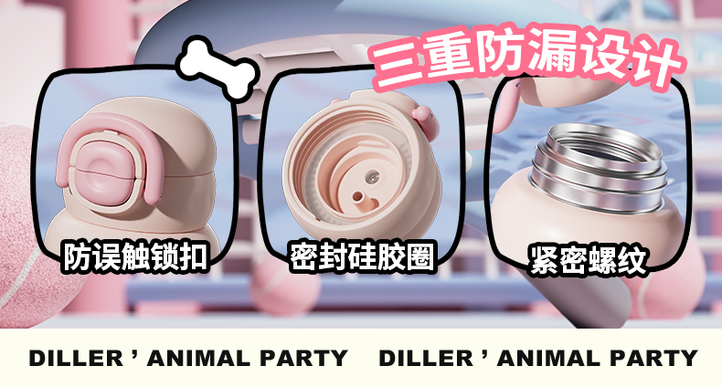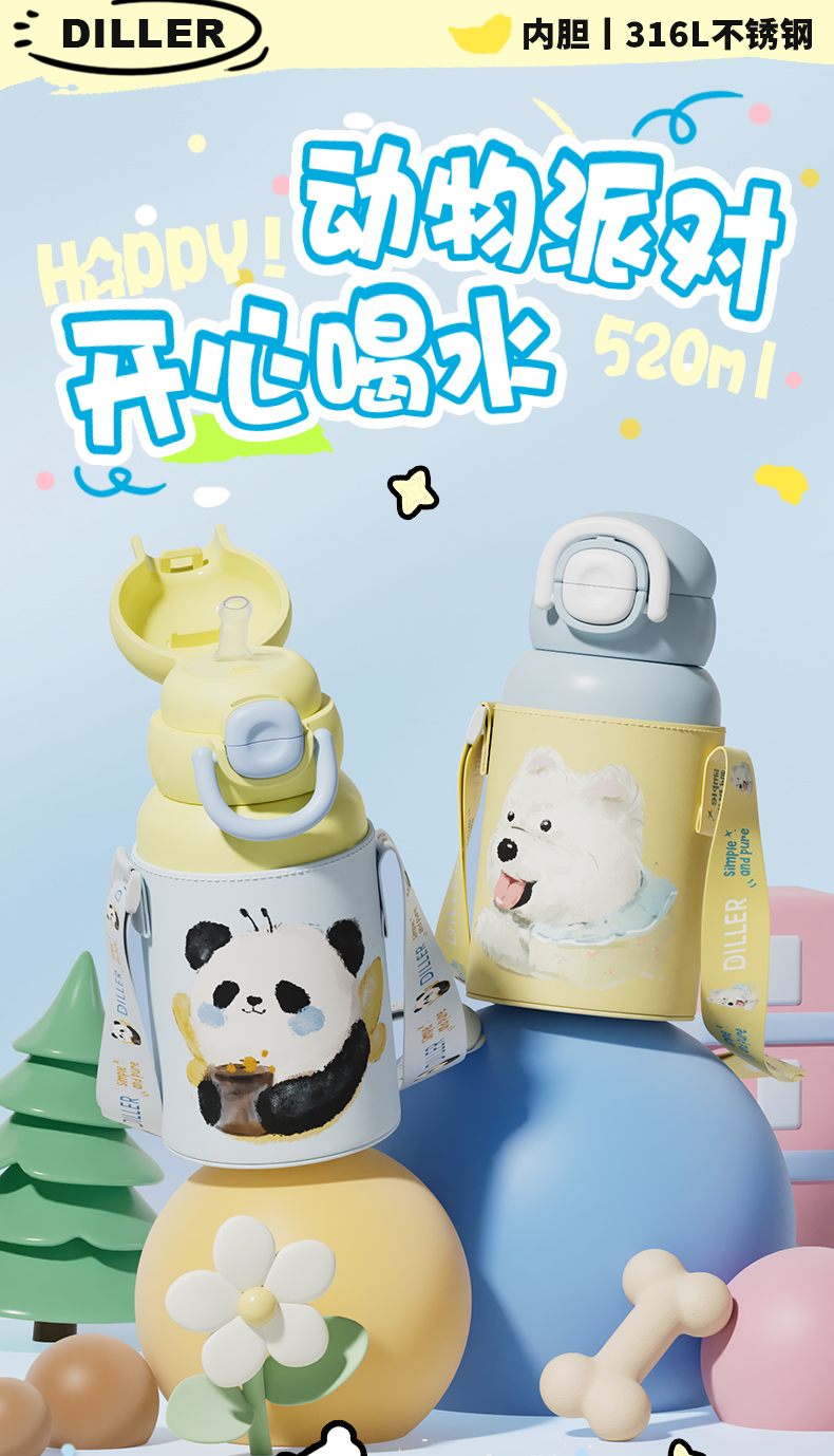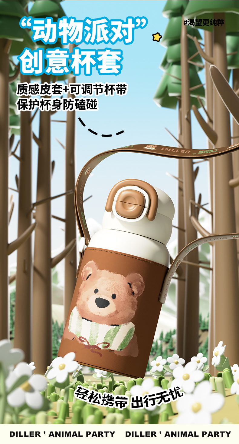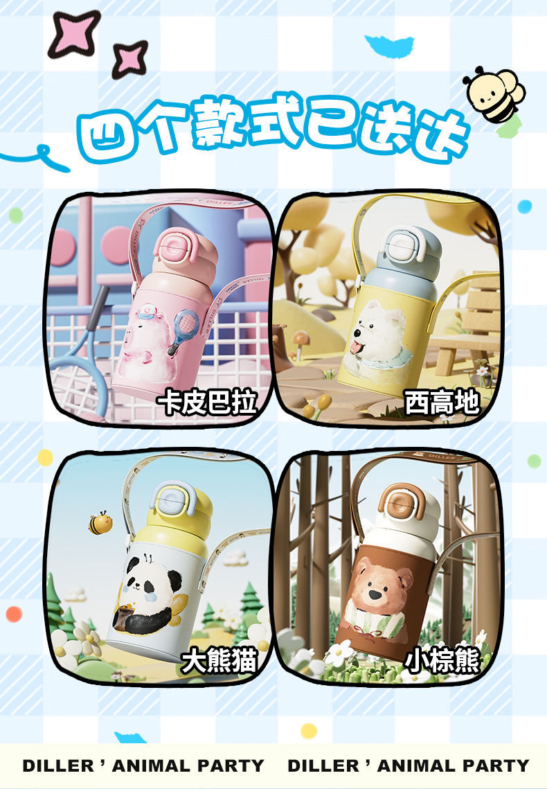 迪乐贝尔新款动物派对带杯套儿童水杯可爱吸管杯两用杯直饮杯上学便携保温杯子水壶