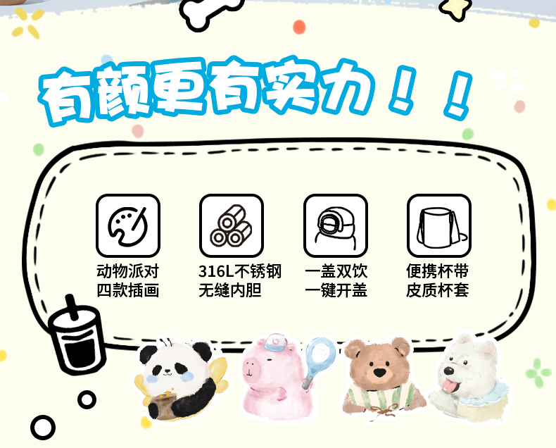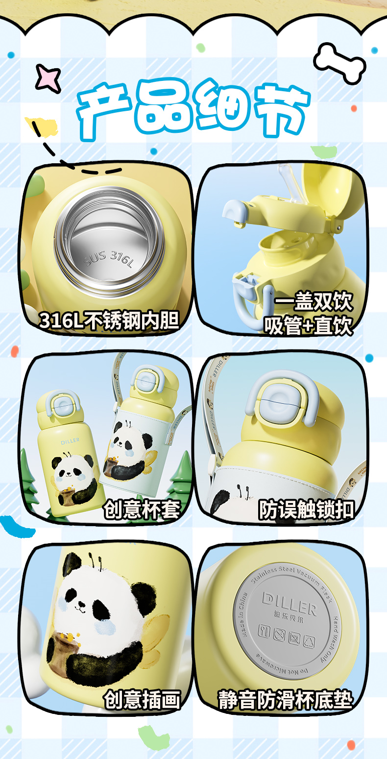 商品名称:迪乐贝尔新款动物派对带杯套儿童水杯可爱吸管杯两用杯直饮杯上学便携保温杯子水壶