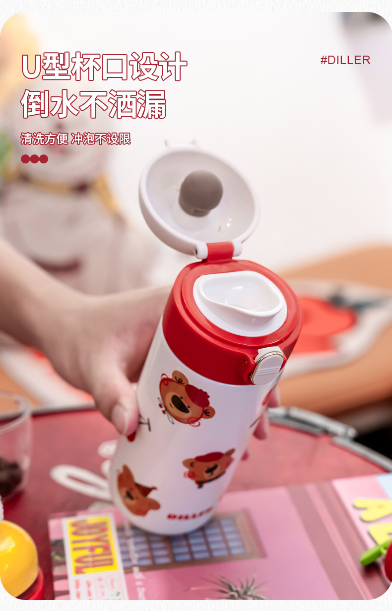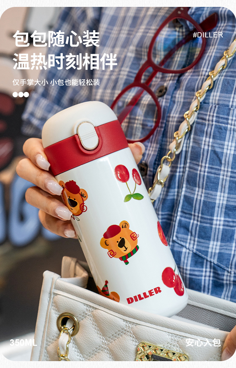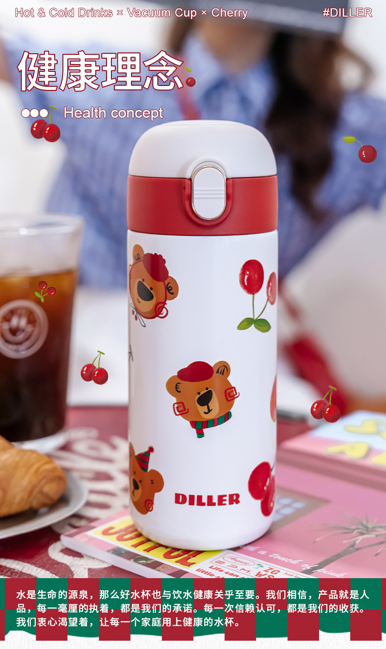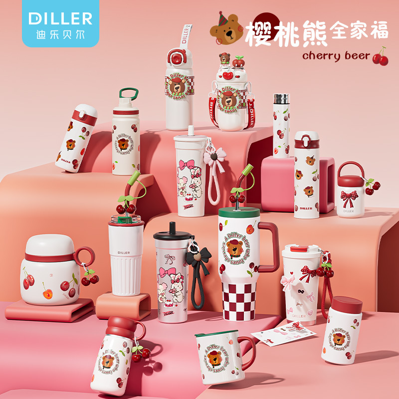 迪乐贝尔新款樱桃小熊系列成人保温杯可爱学生创意便携杯子316不锈钢水杯女士直饮杯