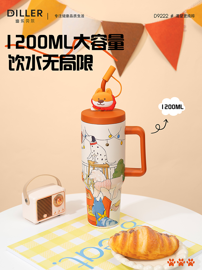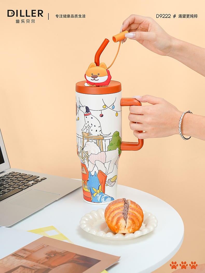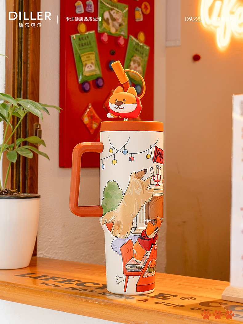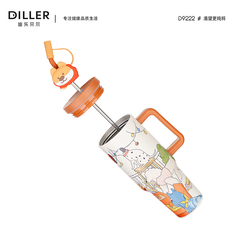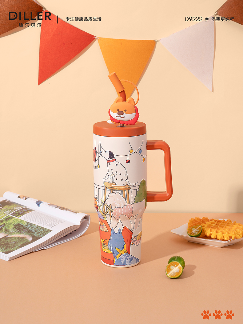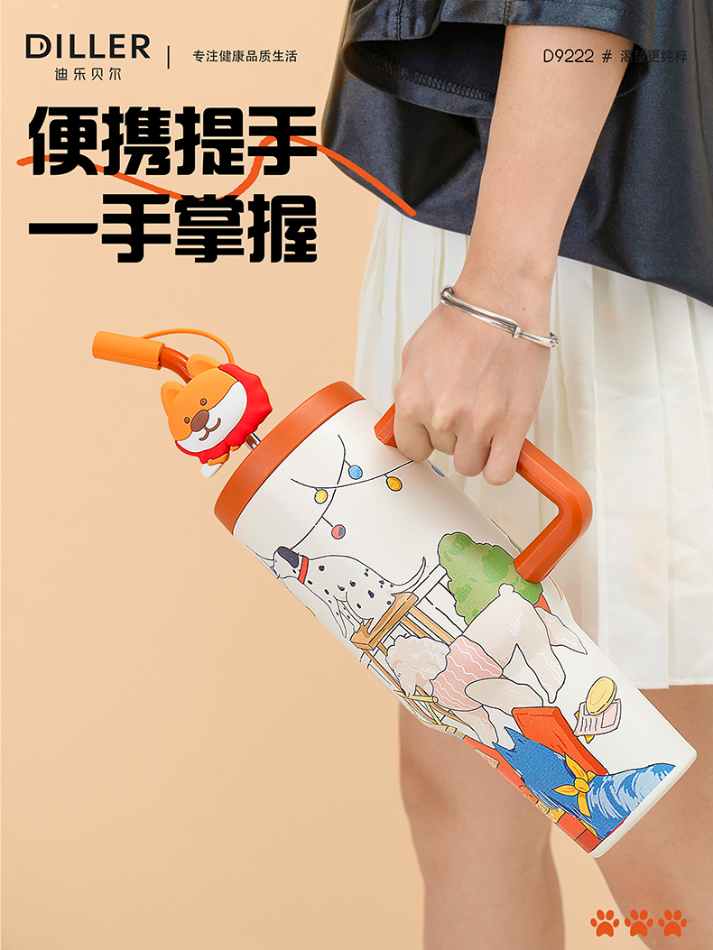 迪乐贝尔新款修狗系列巨无霸吸管杯女士保温杯大容量车载304不锈钢水杯保冷冰霸杯