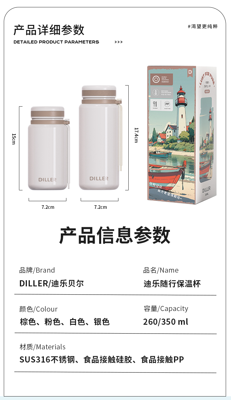商品名称:迪乐贝尔新品带茶隔随行杯保温杯迷你小巧口袋直饮杯成人便携水杯户外学生运动杯260ML