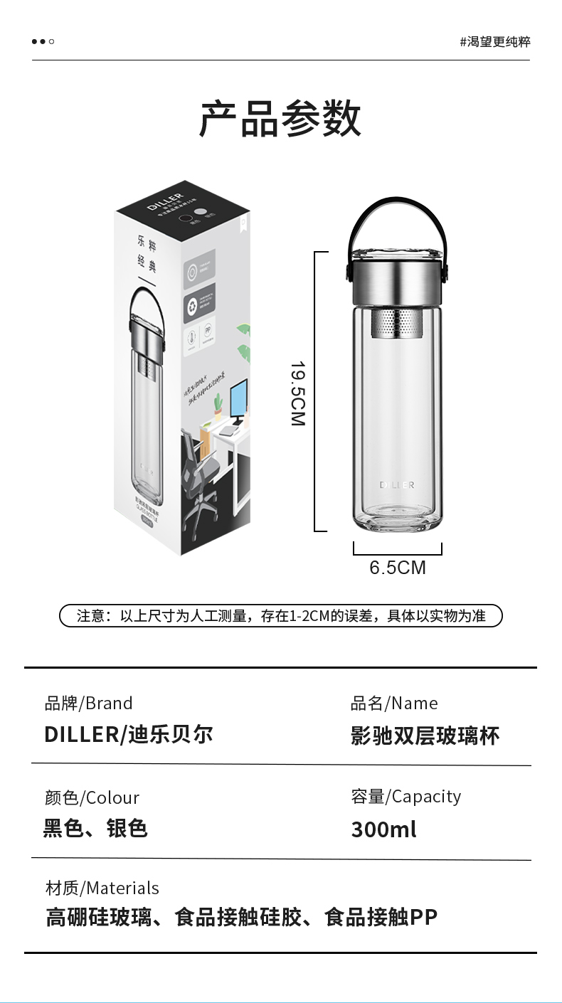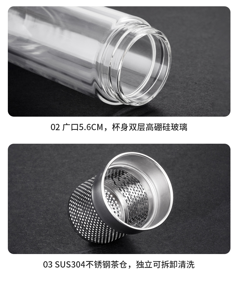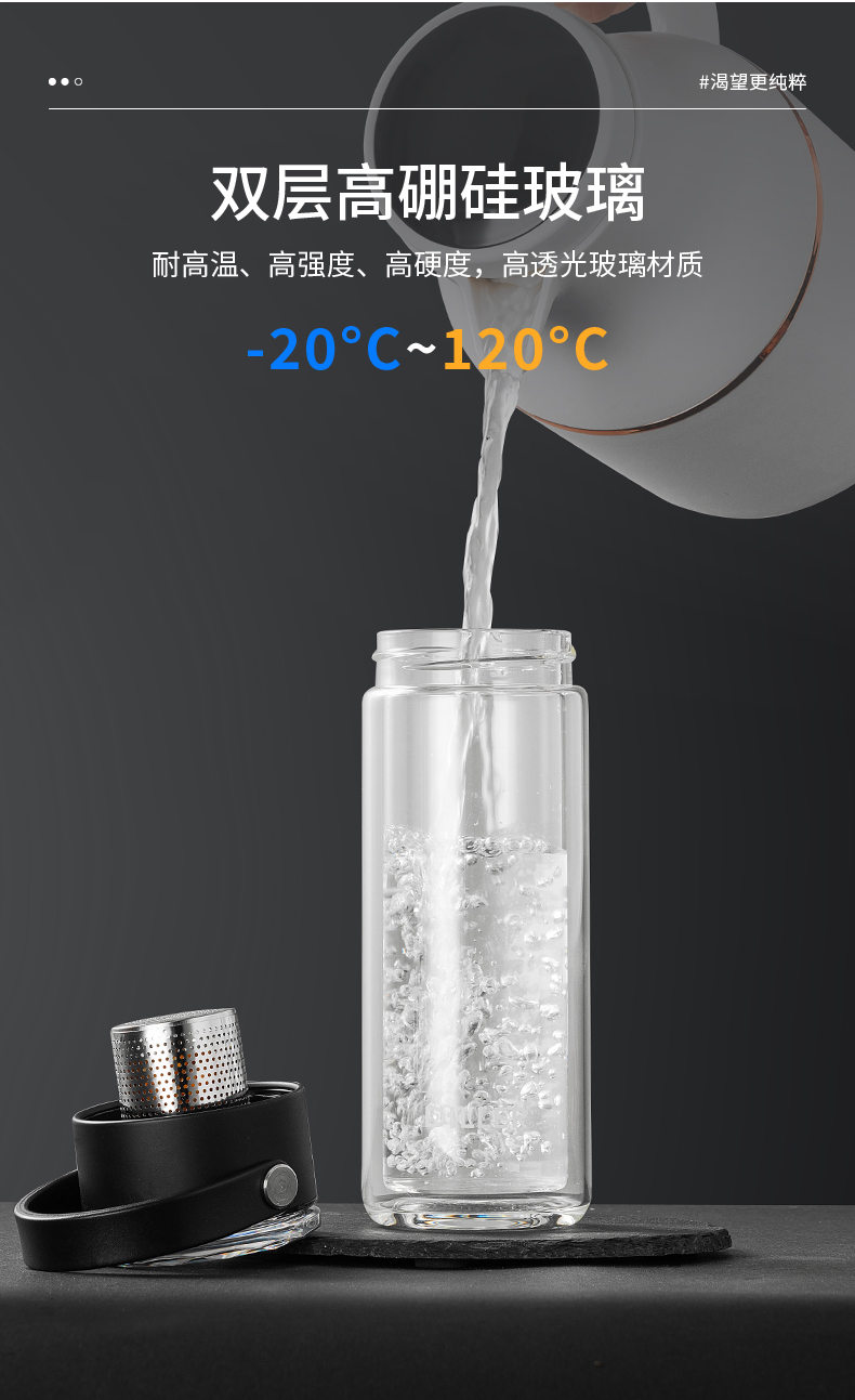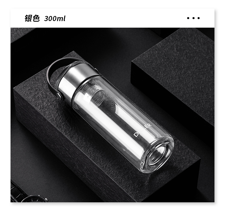 商品名称:迪乐贝尔成人双层玻璃杯茶水分离男士泡茶杯女士花茶杯子商务办公便携水杯300ML