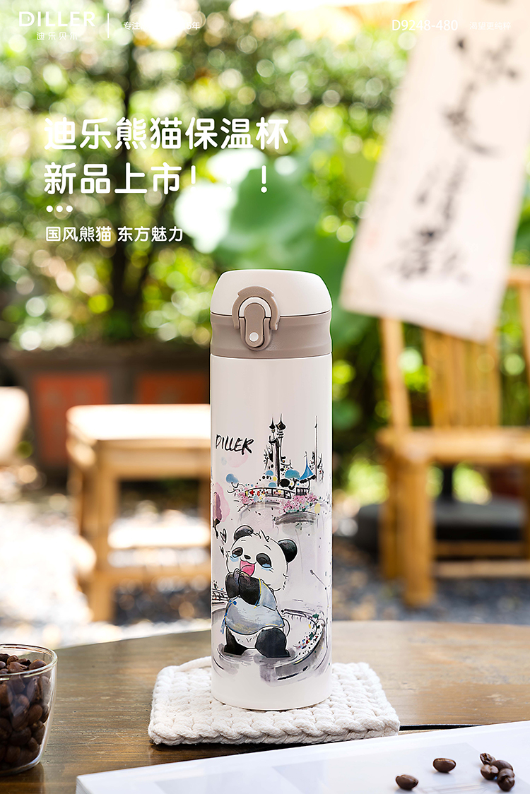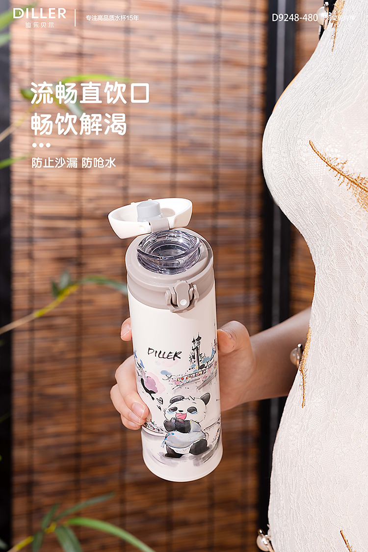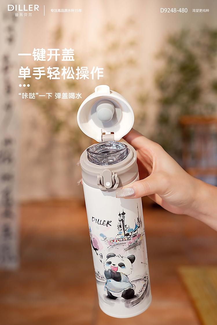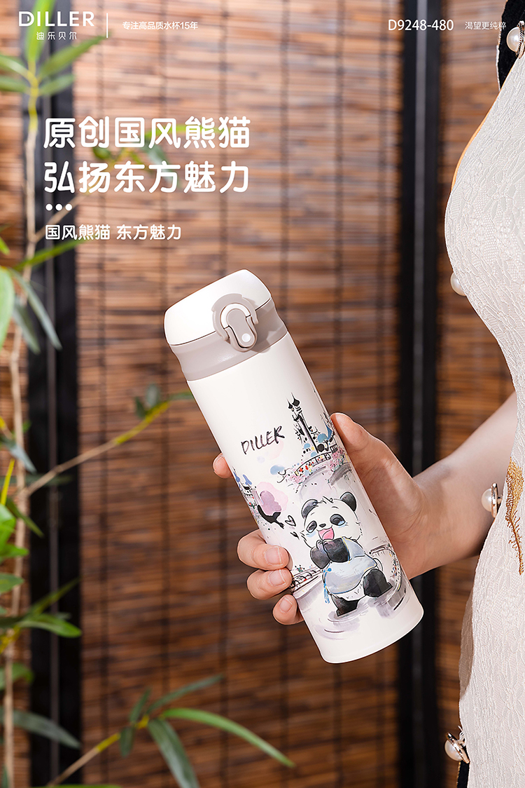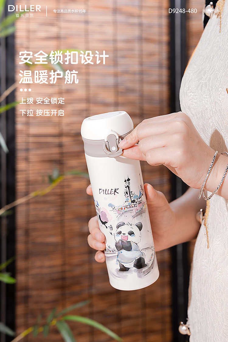 迪乐贝尔新品国风熊猫系列直饮杯成人保温杯一键开盖设计带锁扣儿童上学喝水杯学生杯