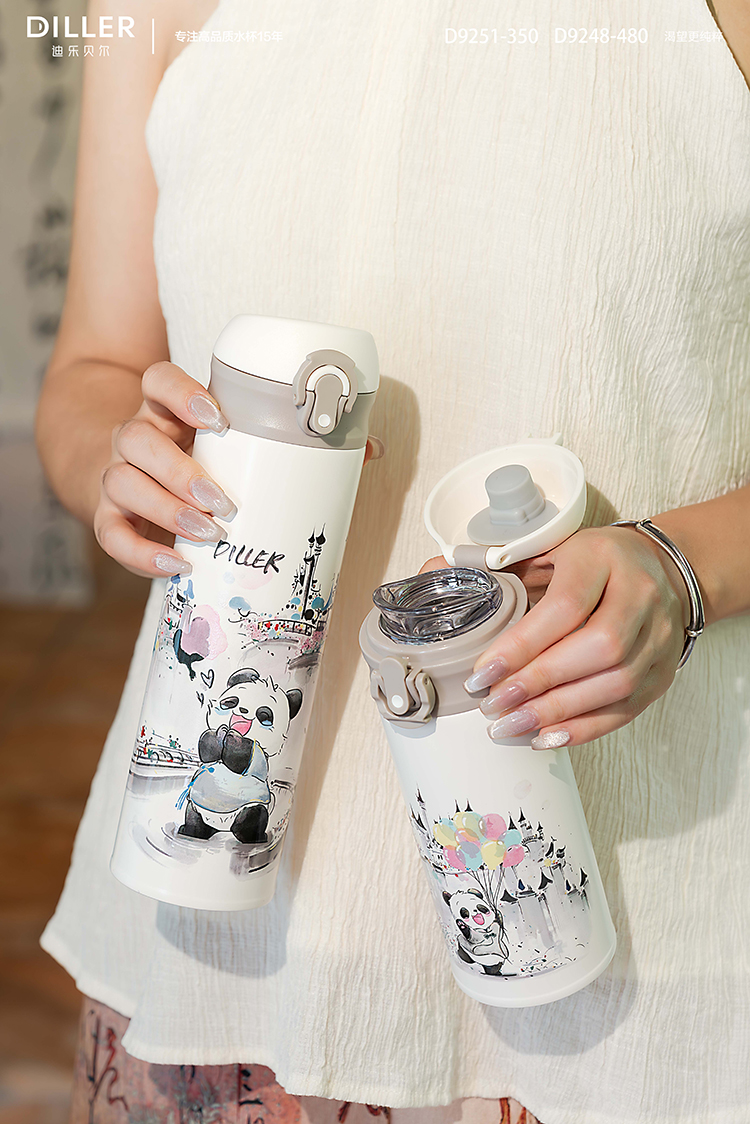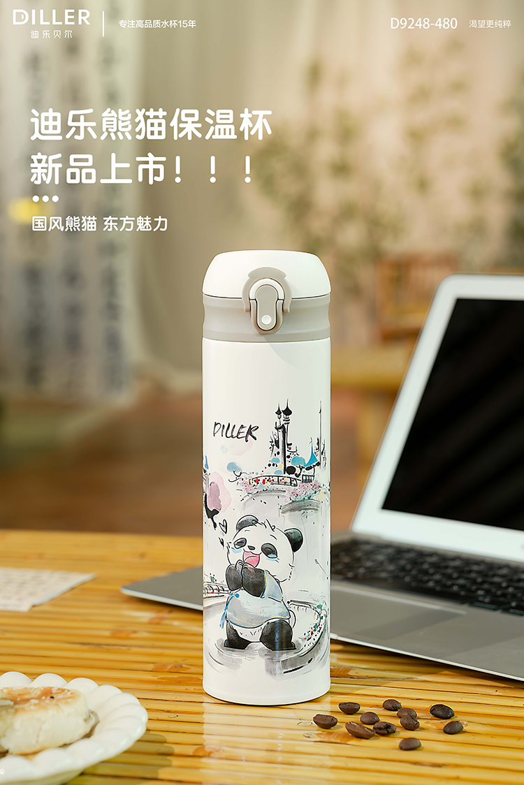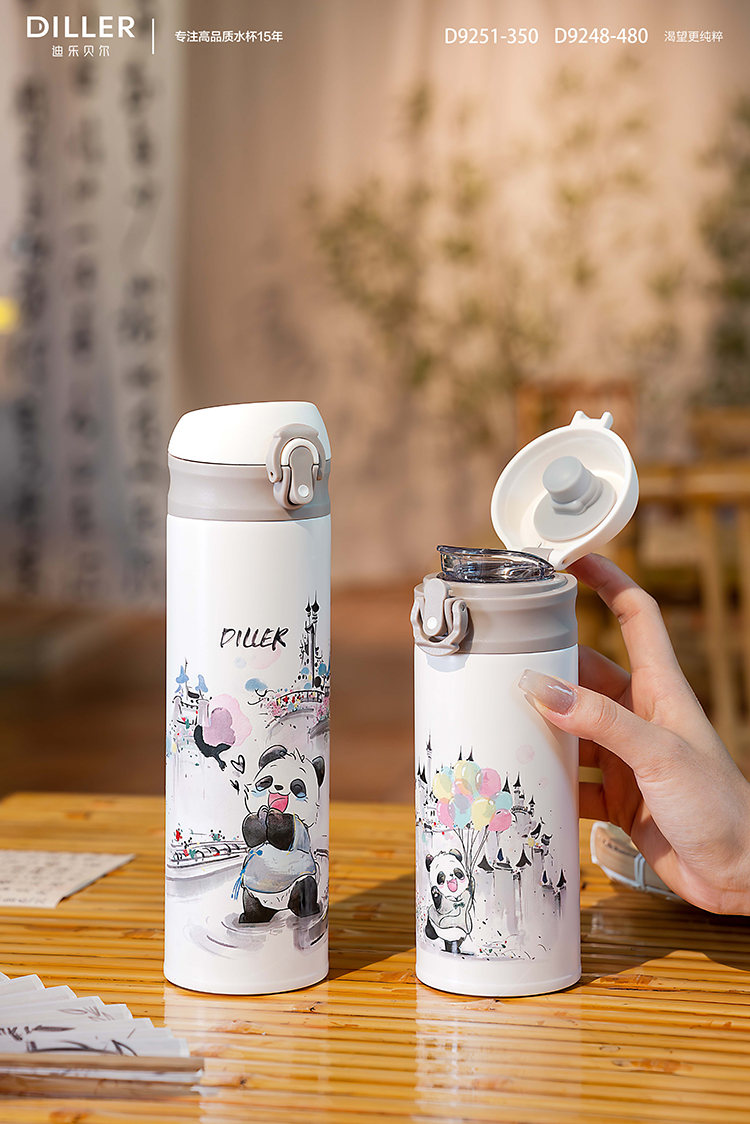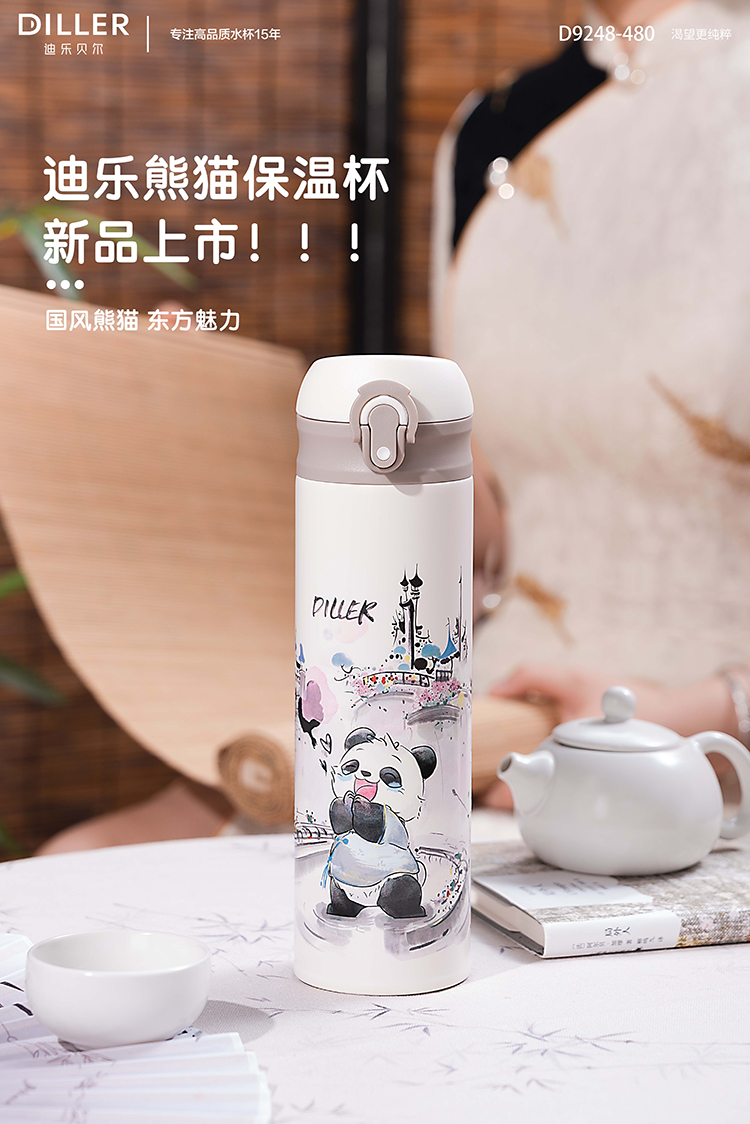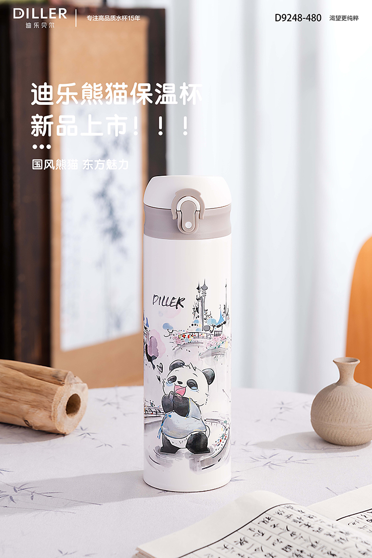 迪乐贝尔新品国风熊猫系列直饮杯成人保温杯一键开盖设计带锁扣儿童上学喝水杯学生杯