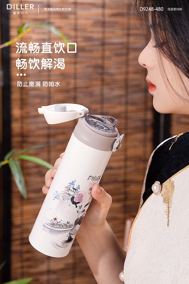 商品名称:迪乐贝尔新品国风熊猫系列直饮杯成人保温杯一键开盖设计带锁扣儿童上学喝水杯学生杯