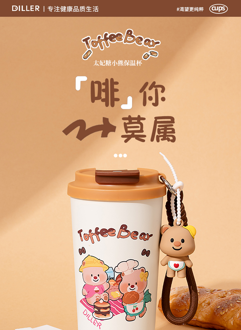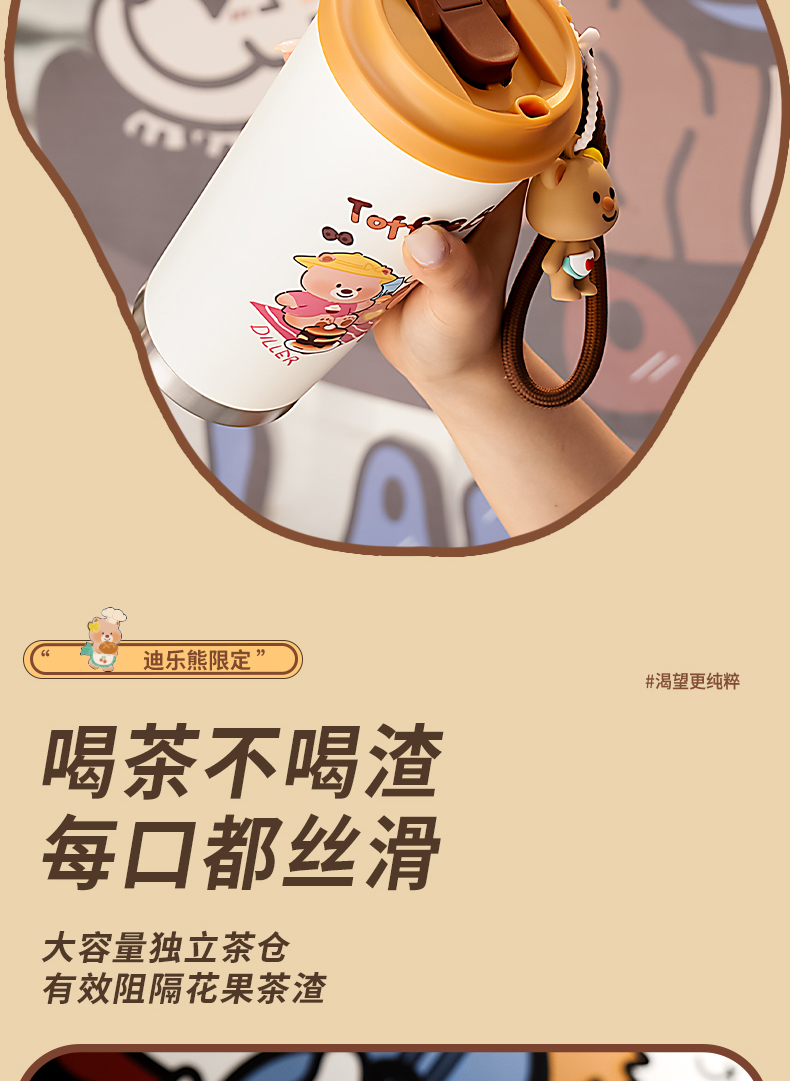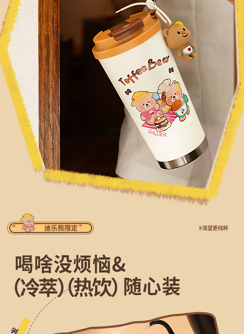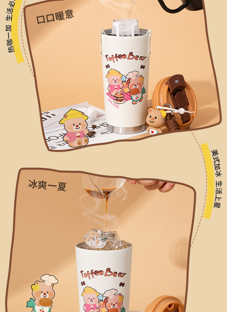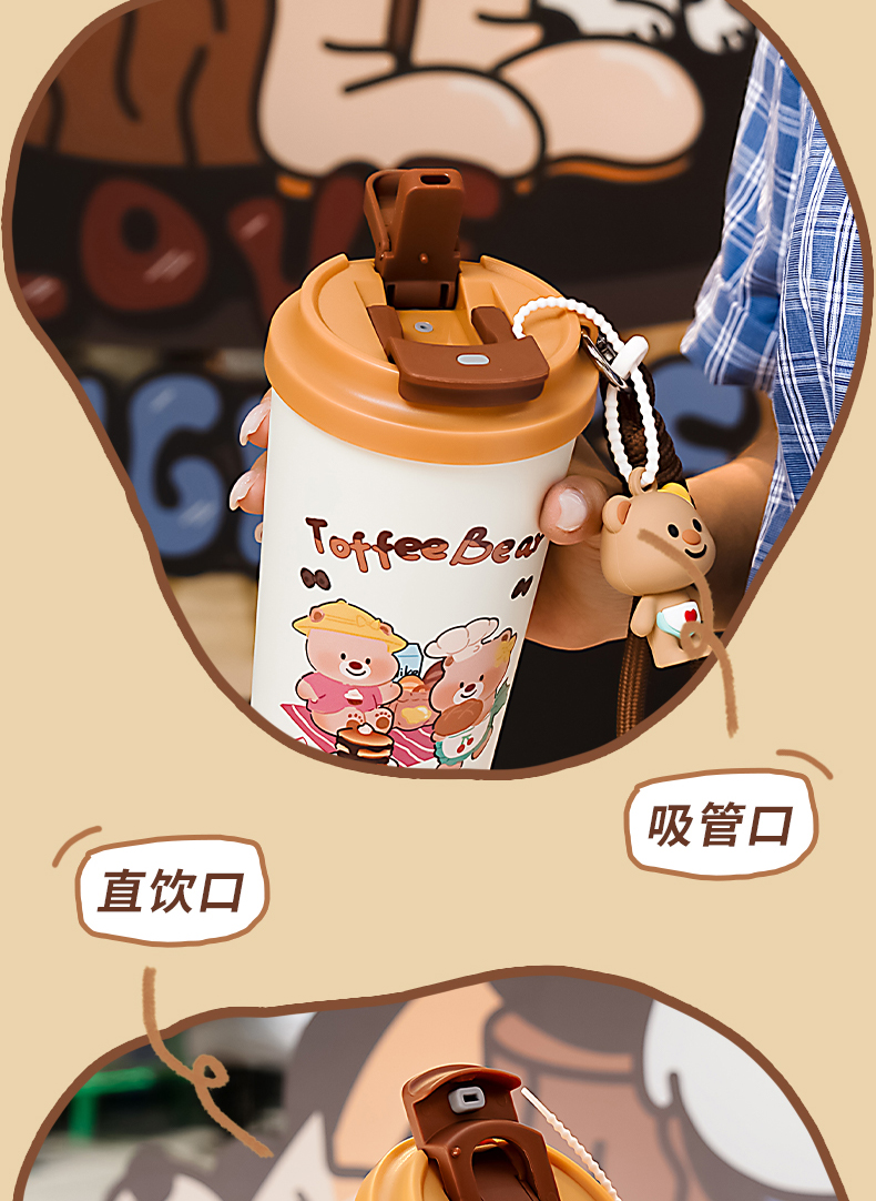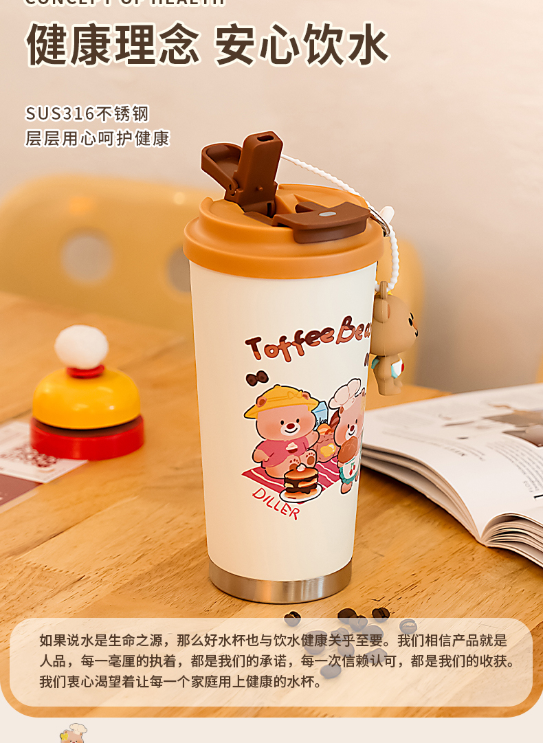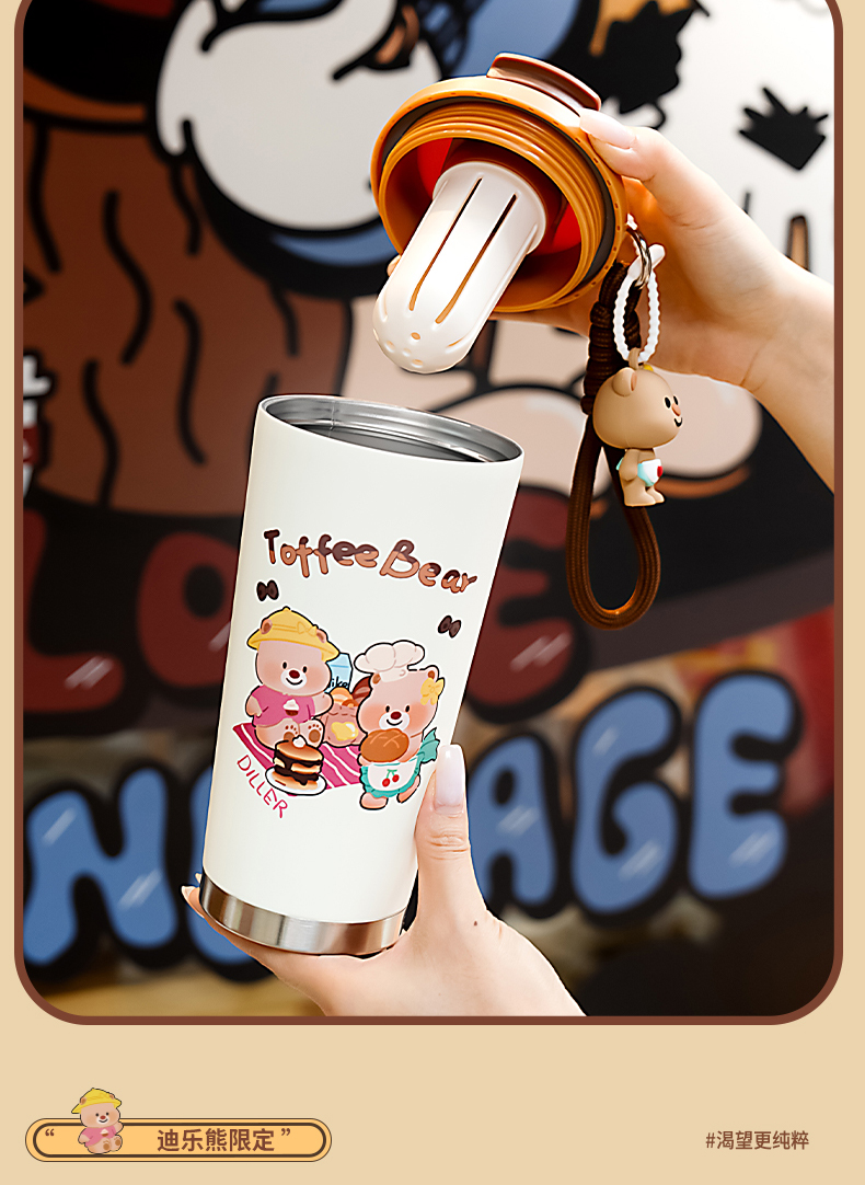 迪乐贝尔新品小熊系列水杯学生高颜值咖啡杯办公室吸管杯304不锈钢办公室女士花茶杯