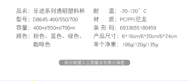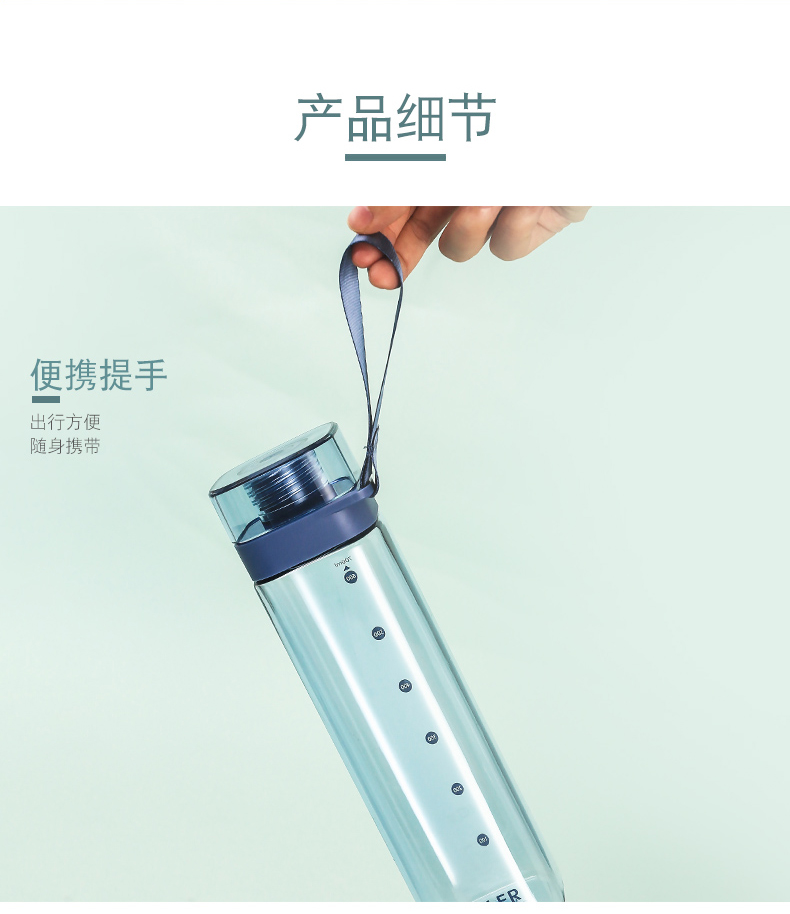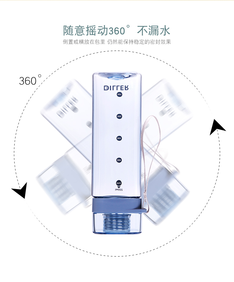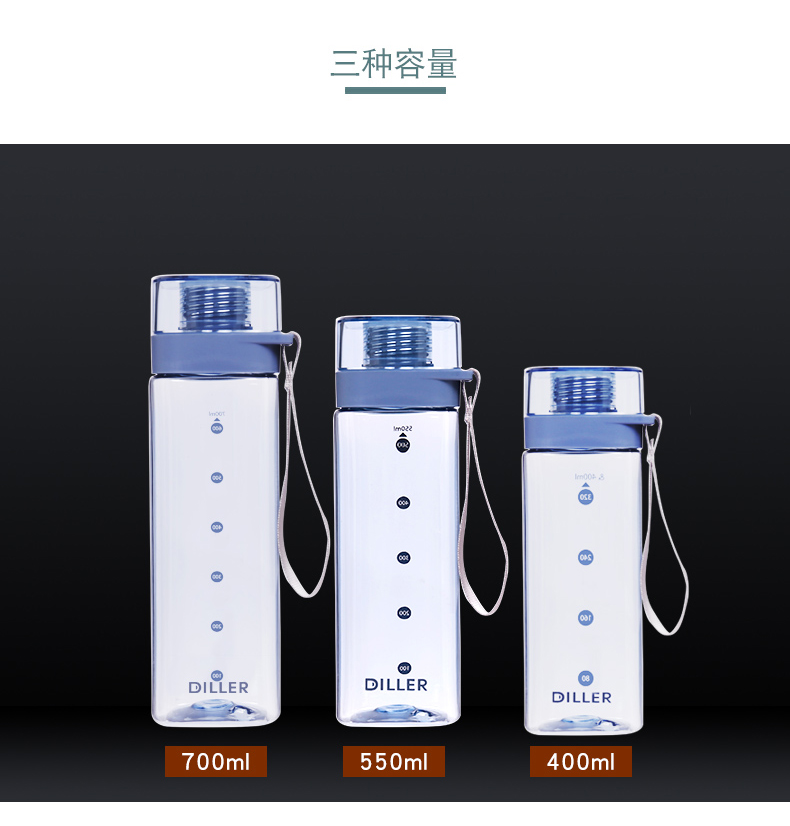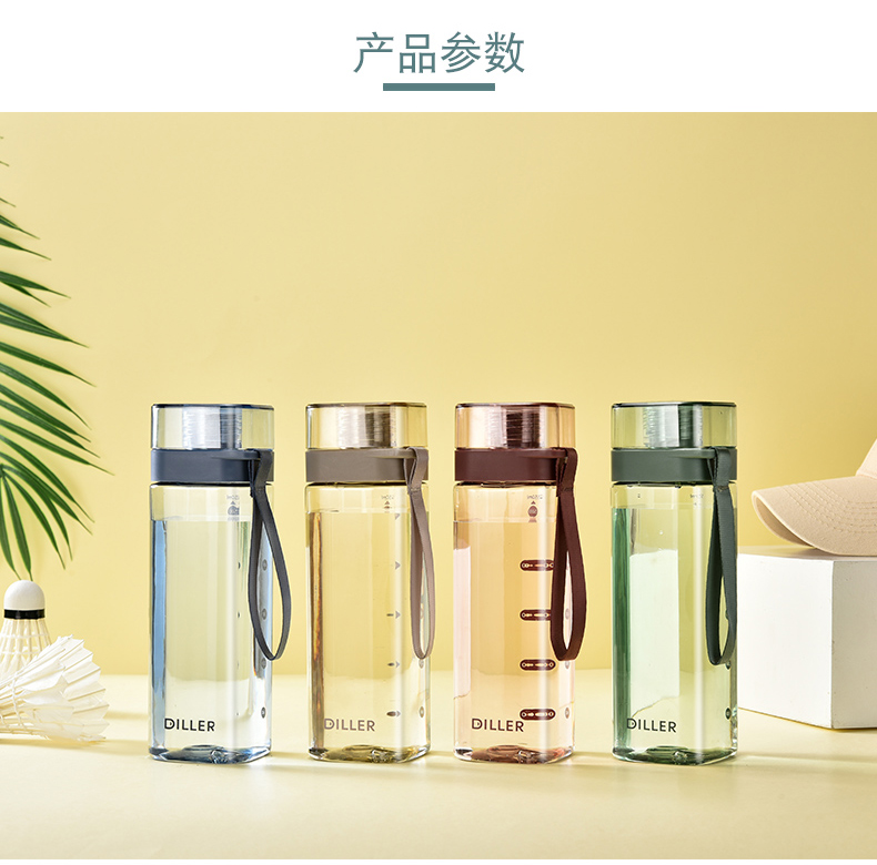 商品名称:迪乐贝尔/DILLER运动杯水杯方形瓶身塑料杯带刻度喝水杯健身户外学生便携水杯550ML