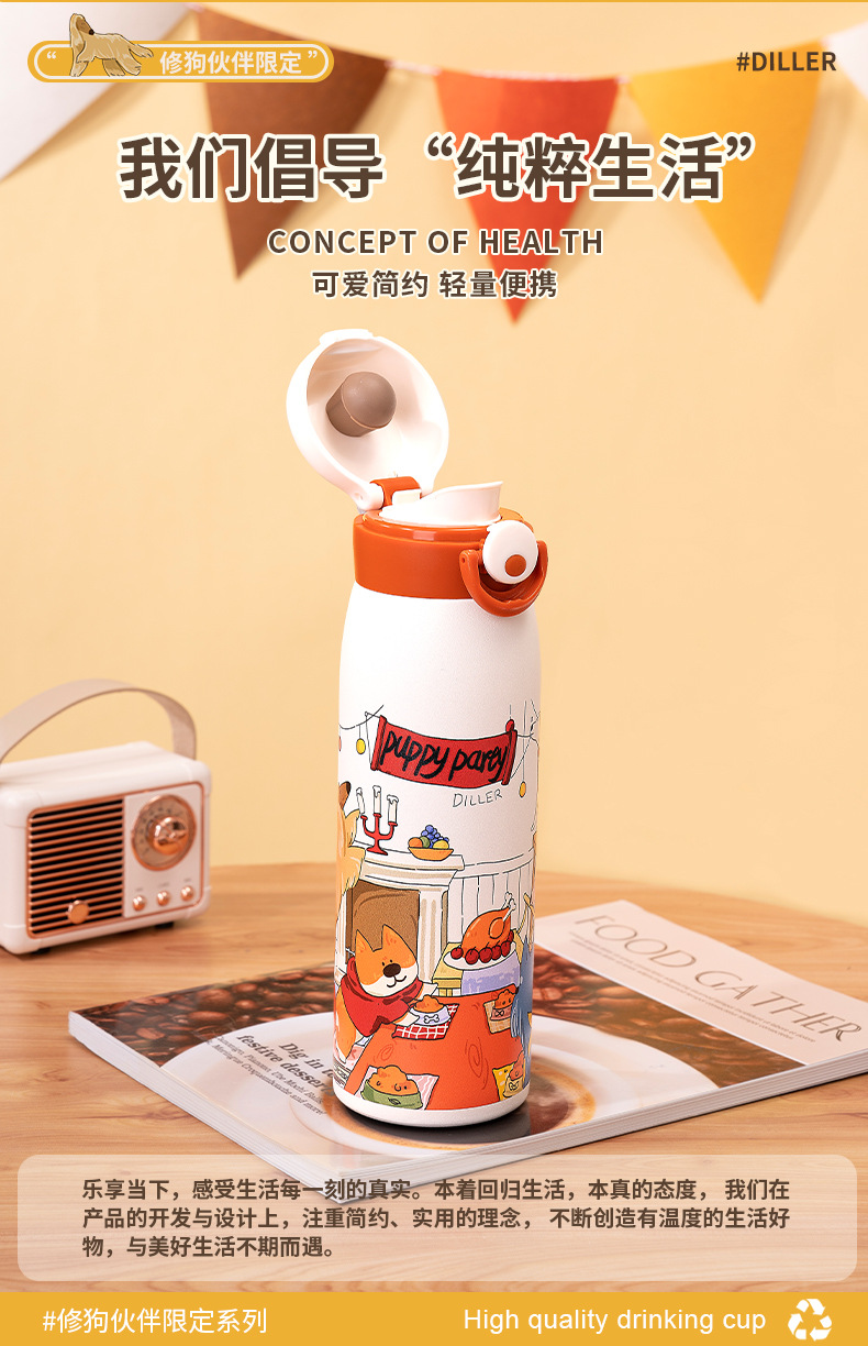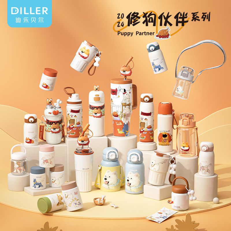迪乐贝尔新款修狗系列水杯女士保温杯学生水壶成人直饮杯便携喝水杯吸管杯大容量杯子