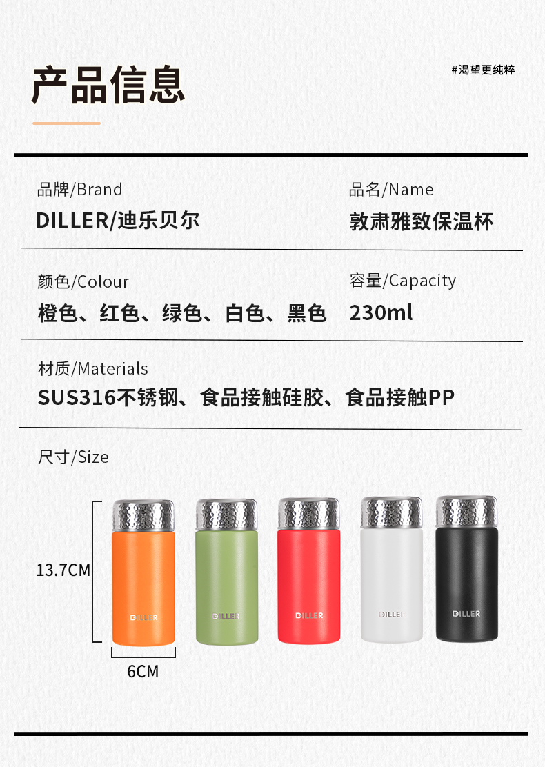 商品名称:迪乐贝尔新品锤纹口袋杯女士便携直饮杯茶隔迷你保温杯子学生316不锈钢成人小巧水杯