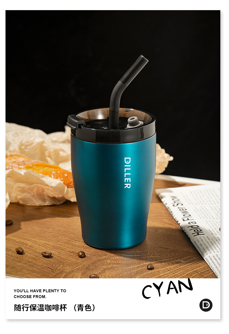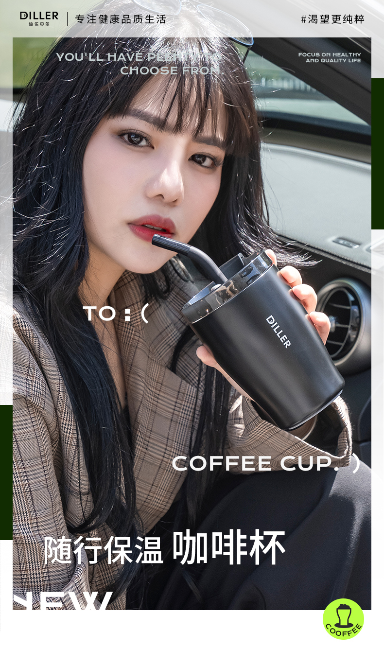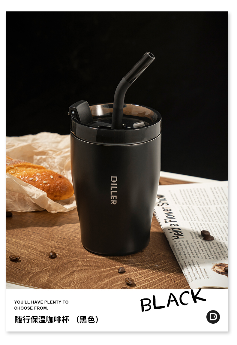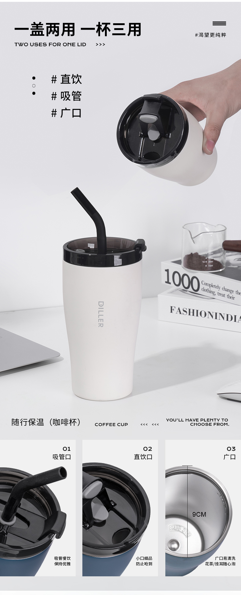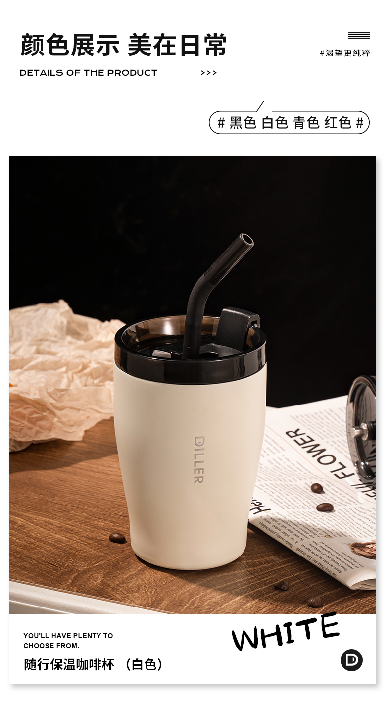 迪乐贝尔秋冬新款成人咖啡杯316不锈钢保温杯办公室双饮杯高颜值车载随行杯便携吸管杯