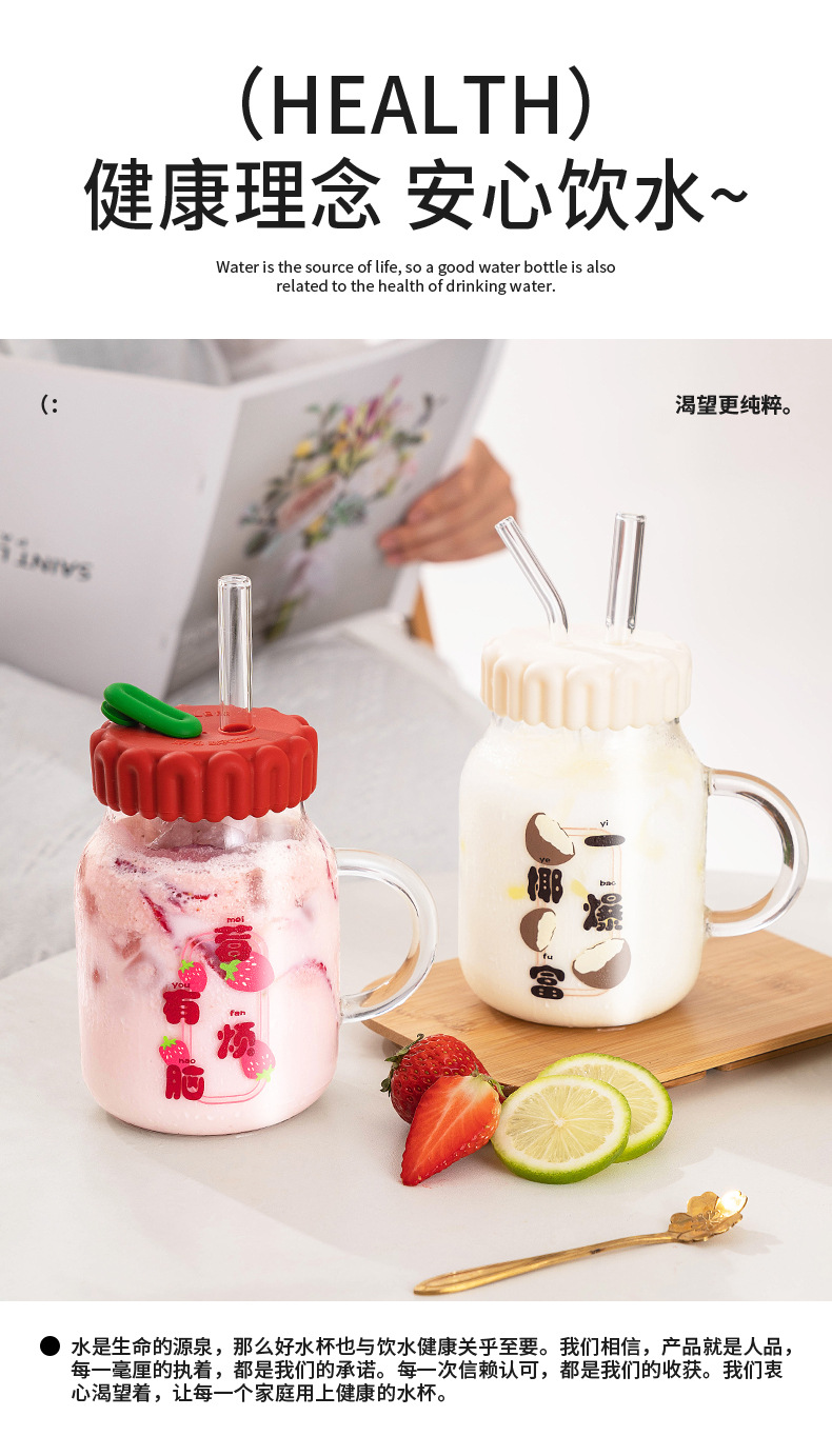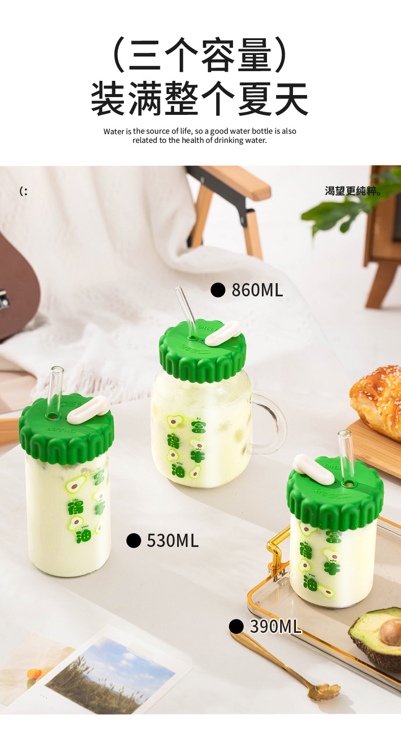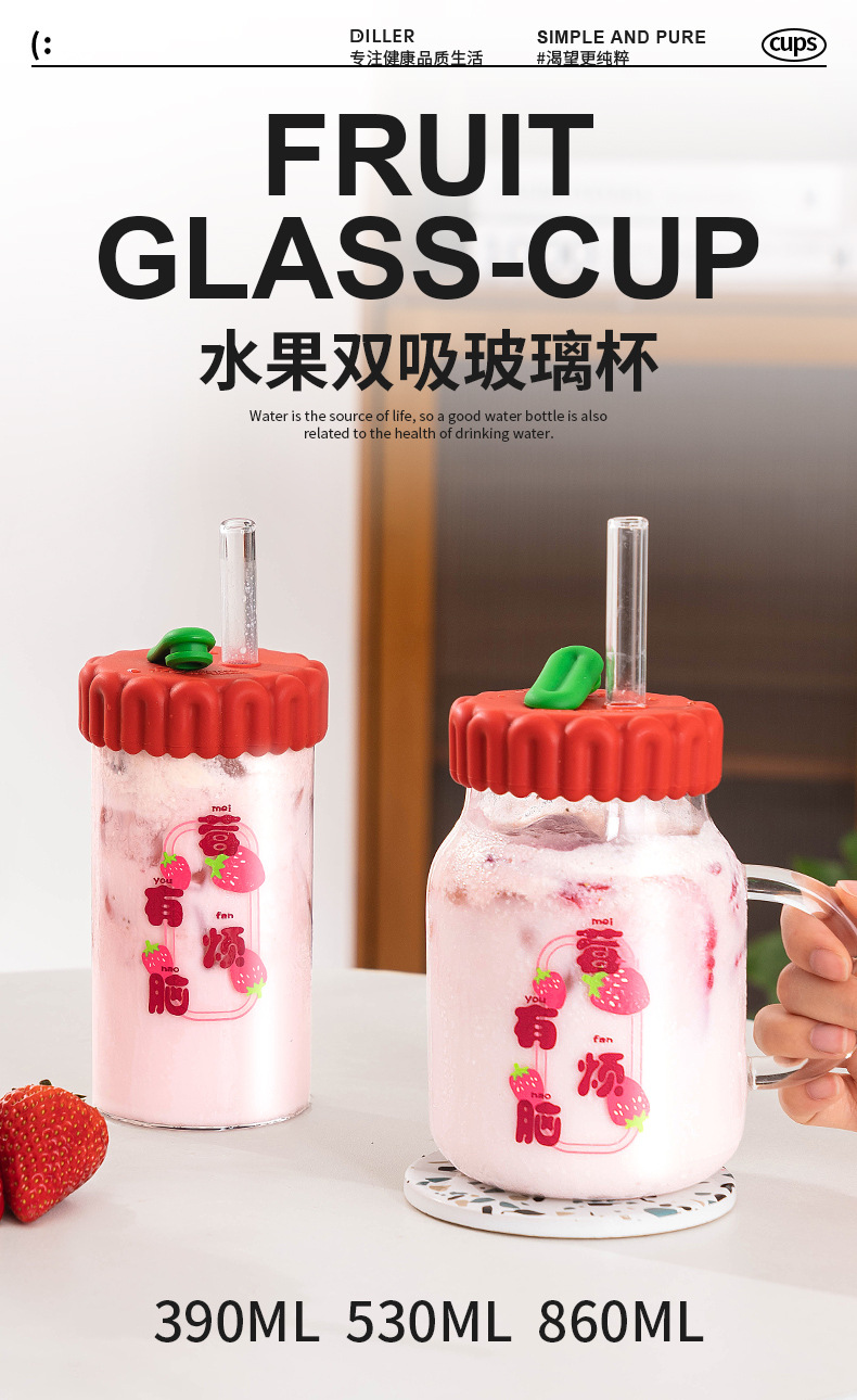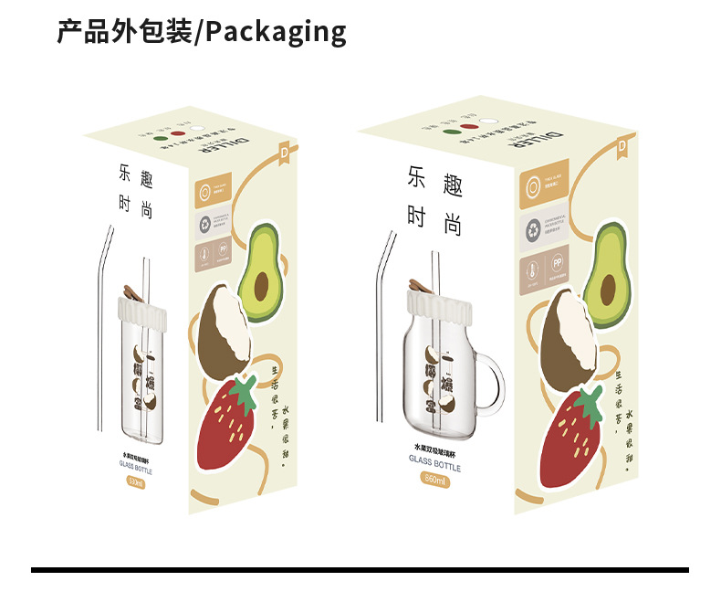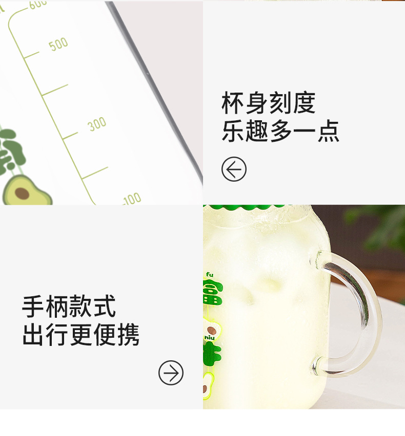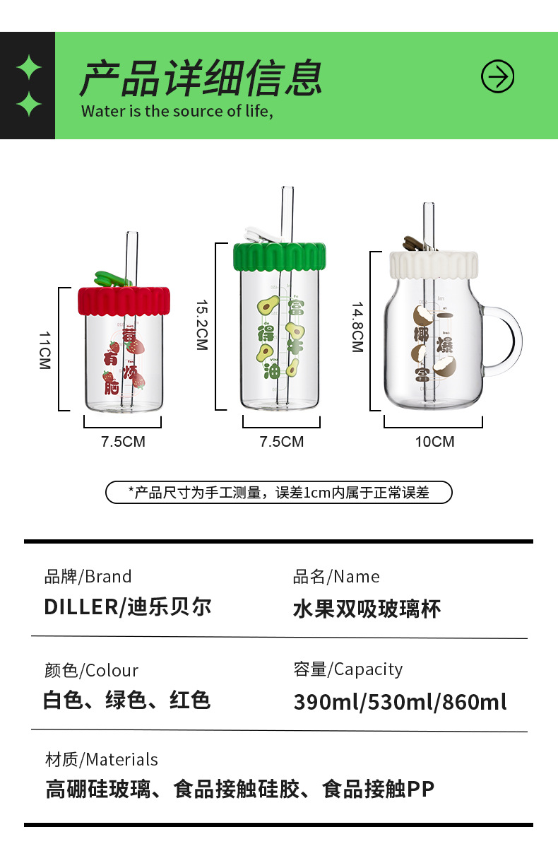 商品名称:迪乐贝尔潮语水果玻璃水杯带把手双饮刻度吸管杯大容量成人家用冷萃杯牛奶咖啡杯子