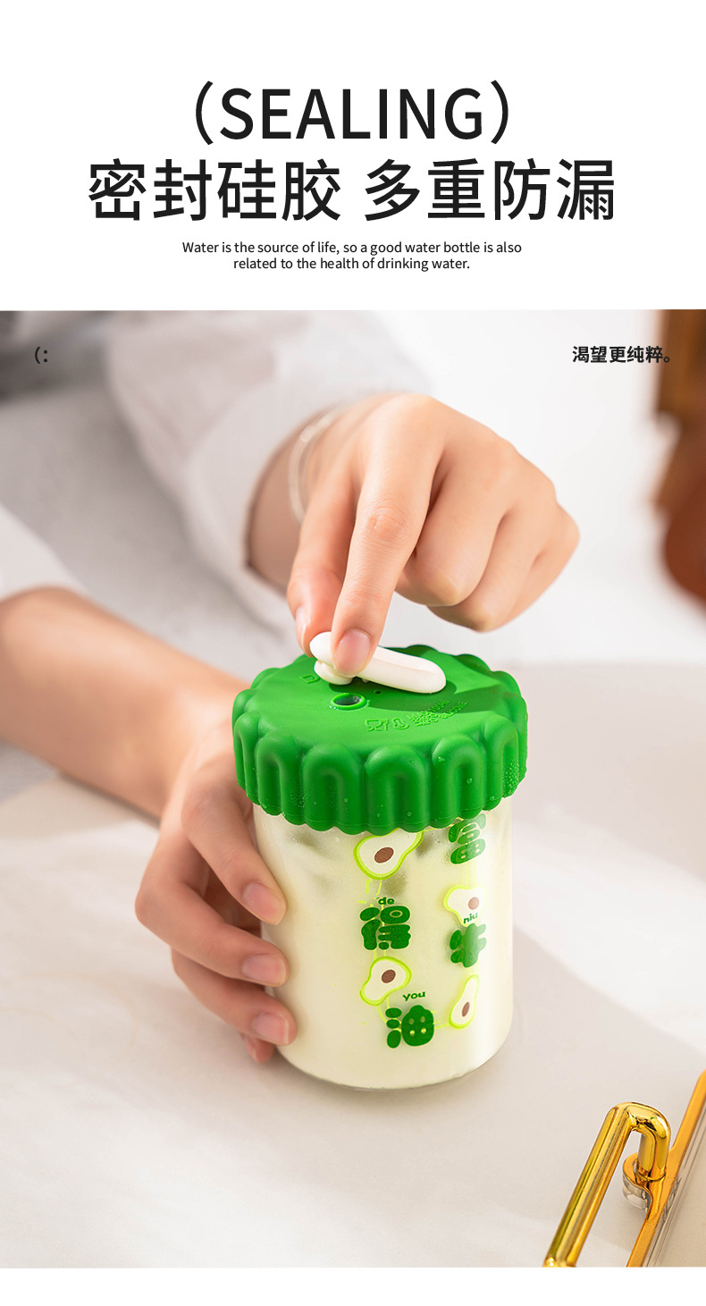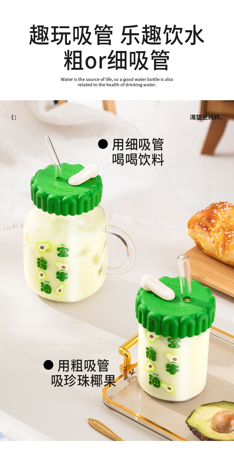 迪乐贝尔潮语水果玻璃水杯带把手双饮刻度吸管杯大容量成人家用冷萃杯牛奶咖啡杯子