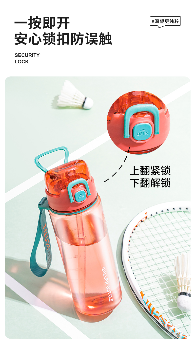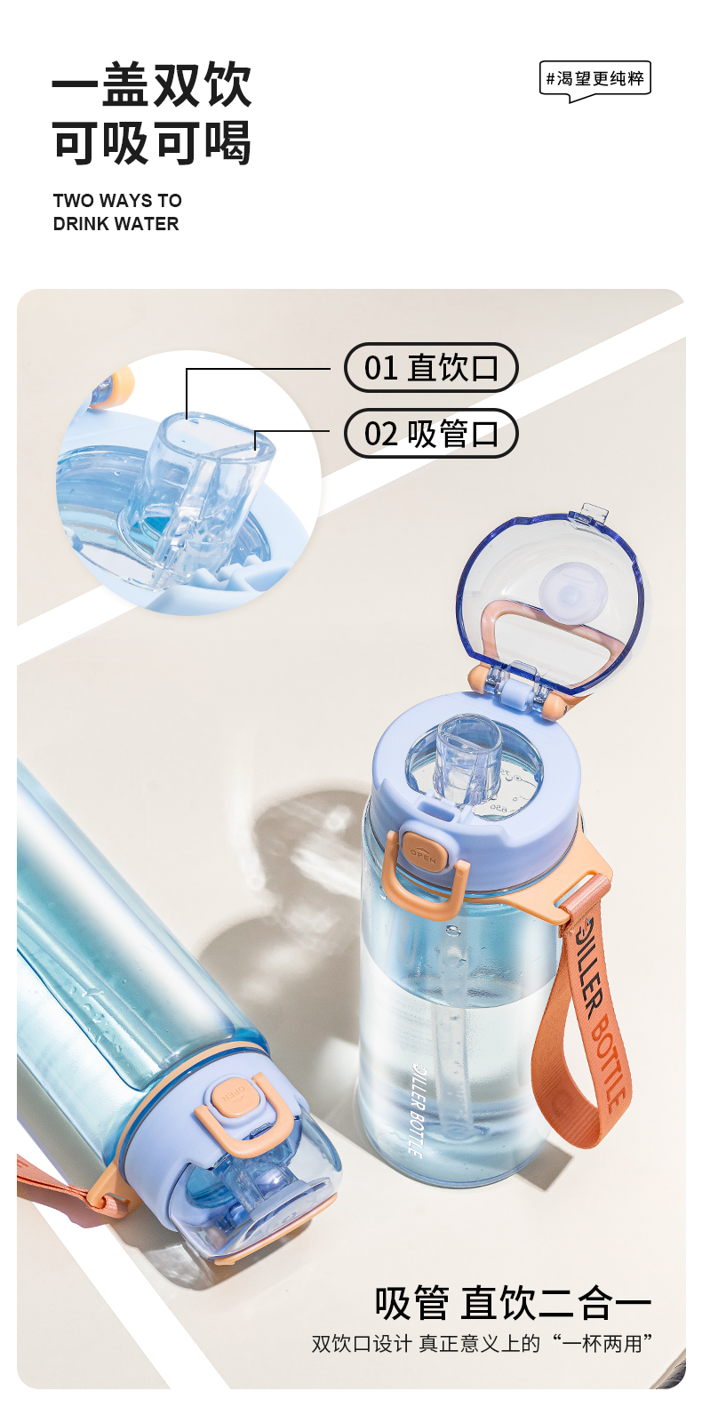 迪乐贝尔新品成人直饮杯水杯双饮杯口夏季tritan带提绳吸管杯大容量水壶户外运动杯子