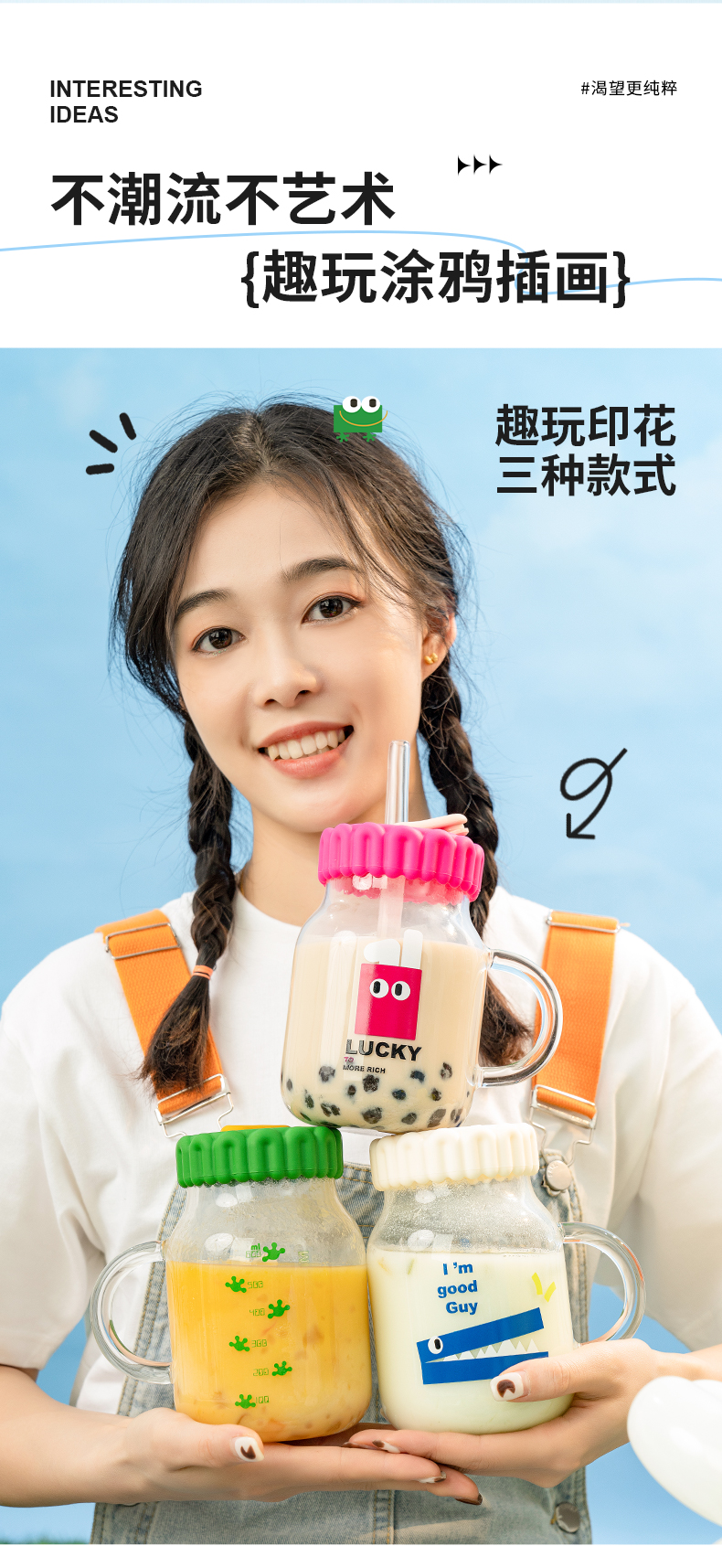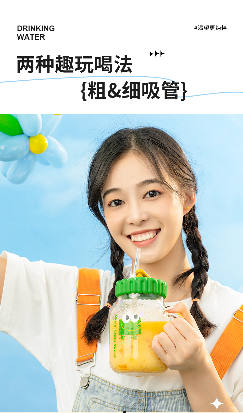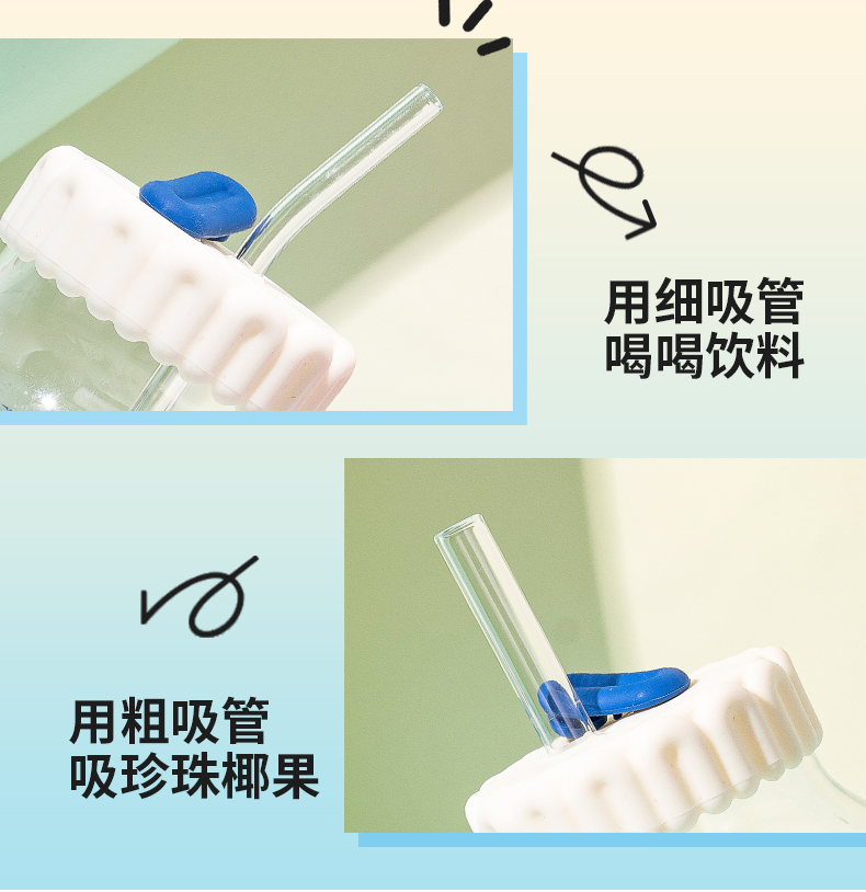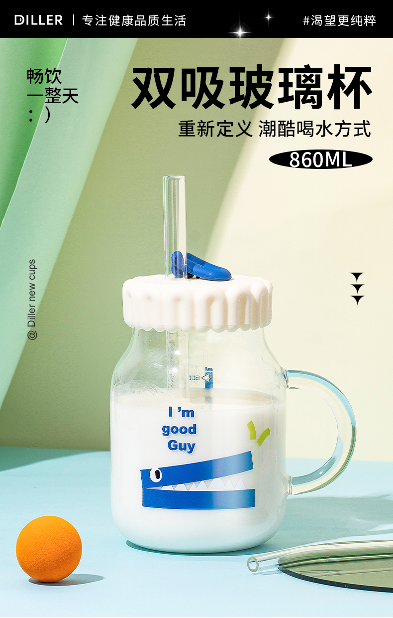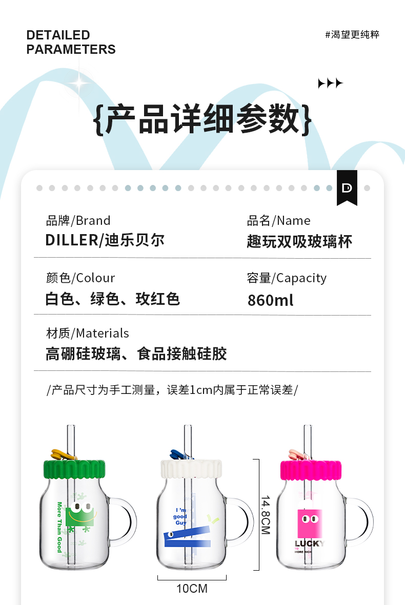 商品名称:【粗+细吸管】迪乐贝尔春夏新款学生喝水杯双吸管带手柄奶茶玻璃杯子高颜值咖啡杯860ML
