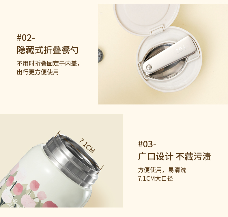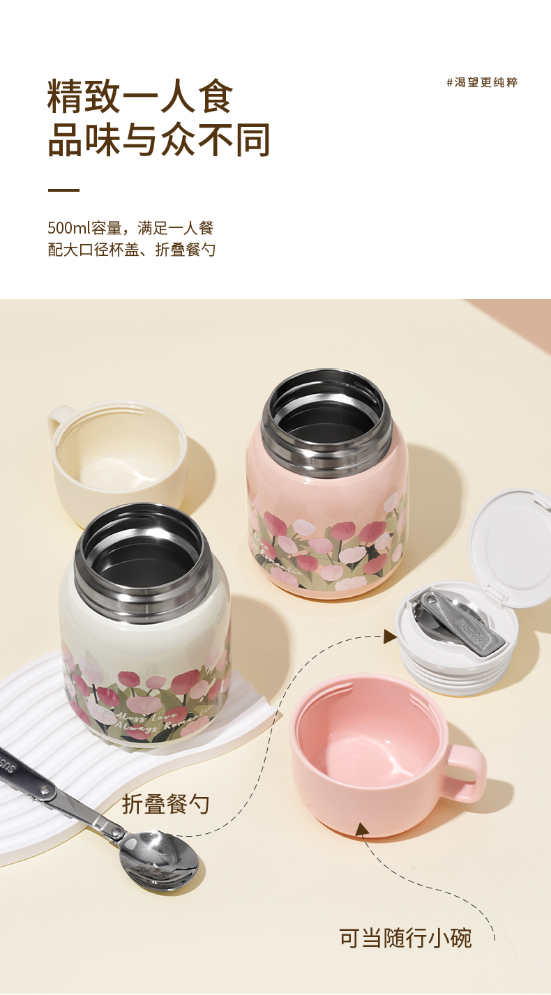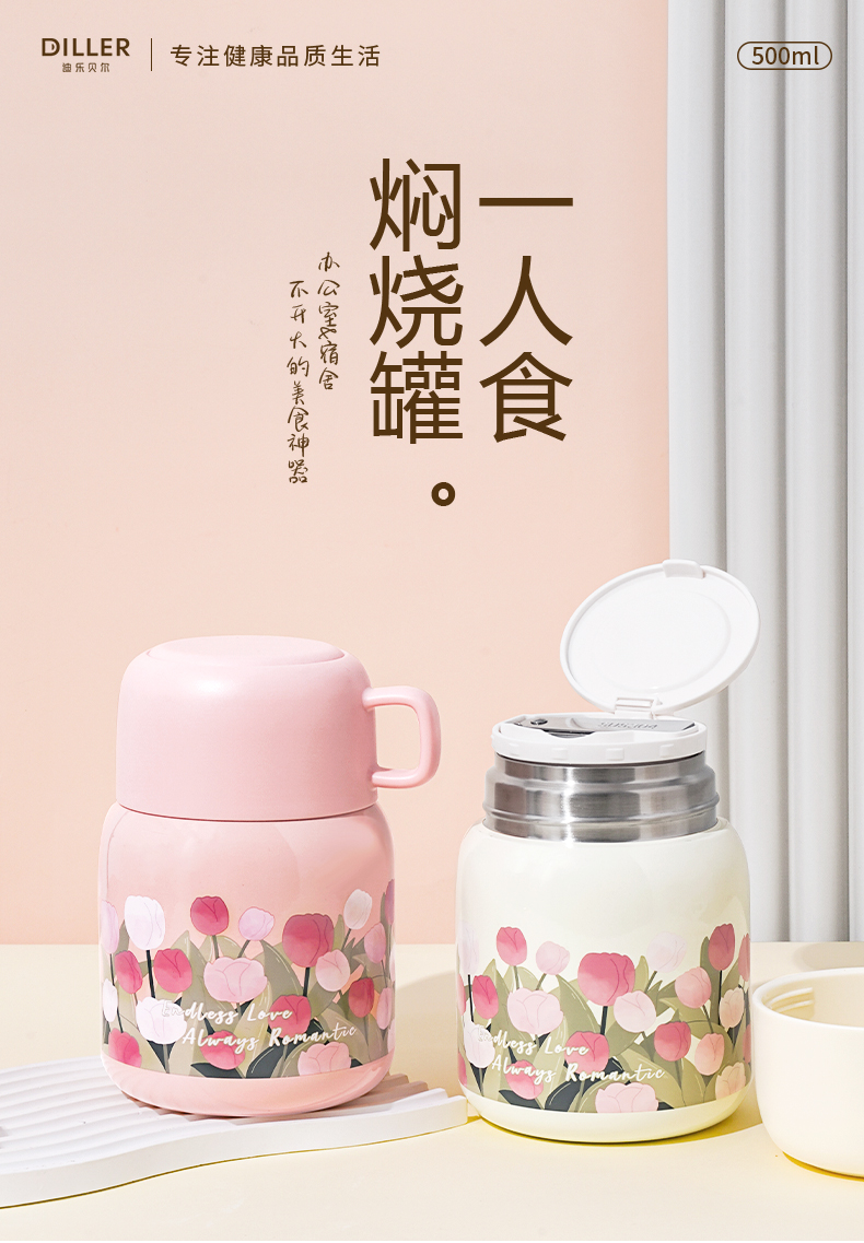 【带折叠餐勺】迪乐贝尔新品大肚杯郁金香焖烧壶银耳燕窝焖烧杯上班族便携保温杯500ML