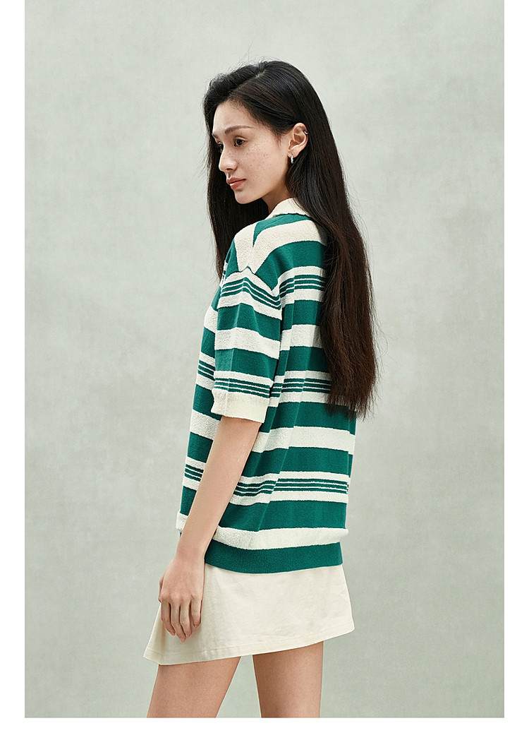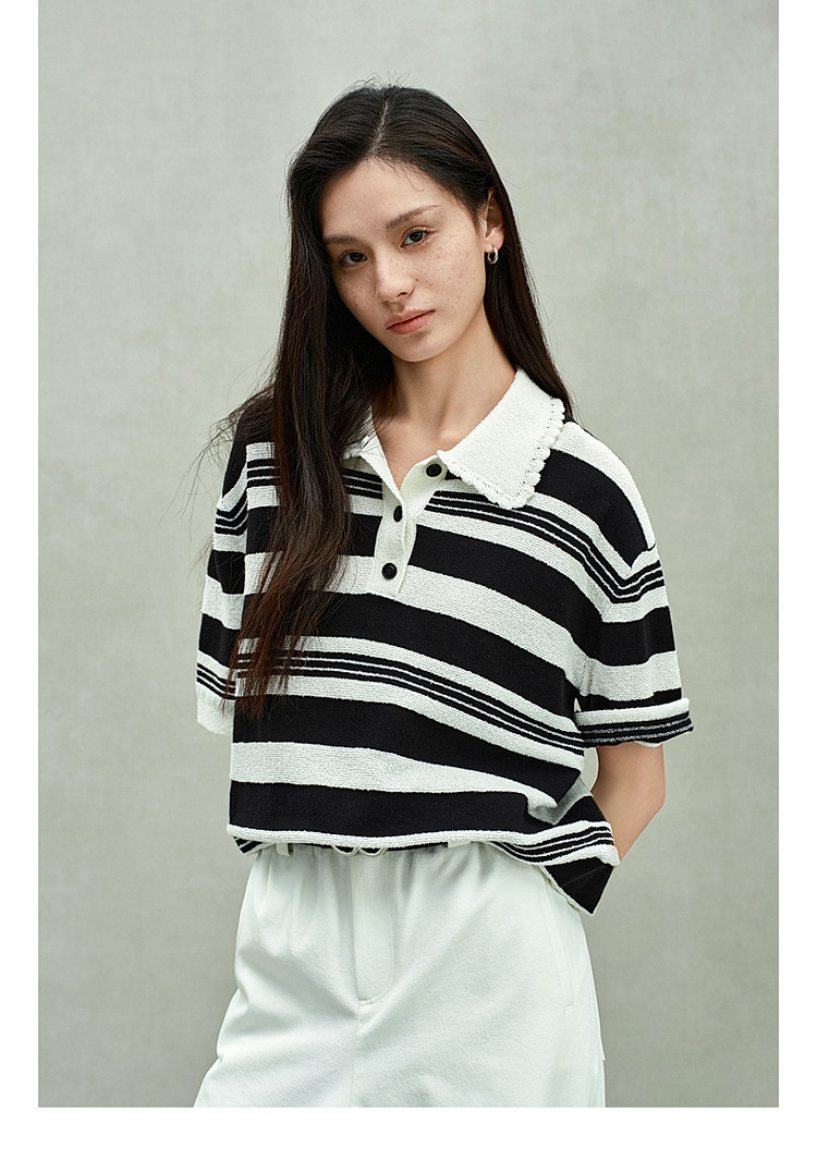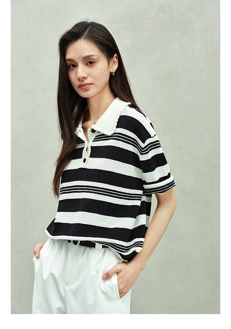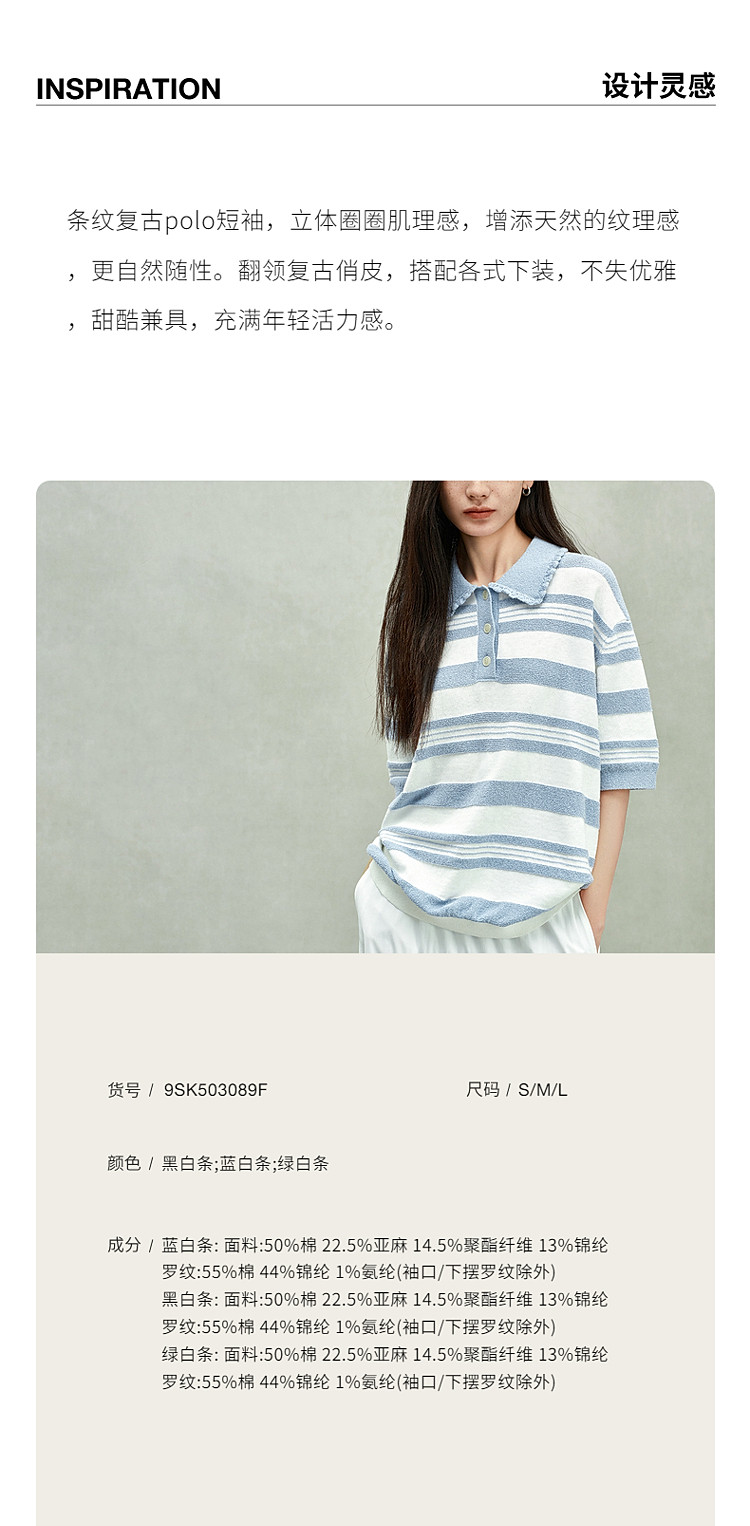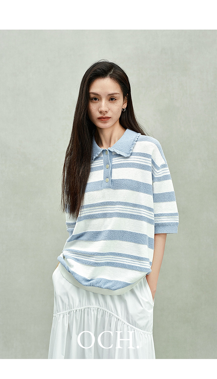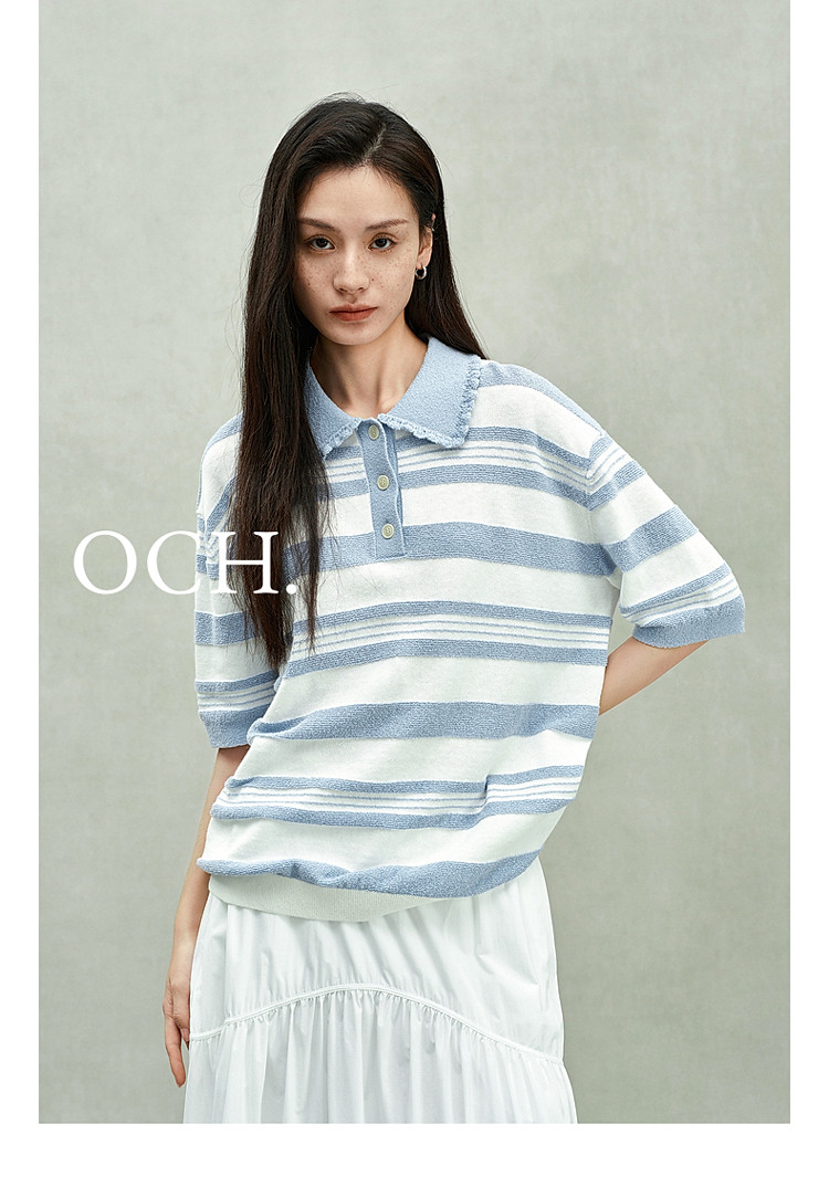 限定系列OCH.春装 亚麻棉polo领条纹上衣短袖针织衫女 811599