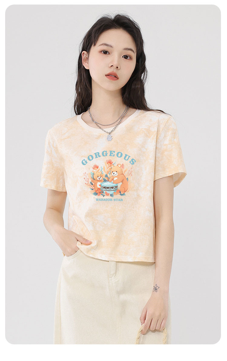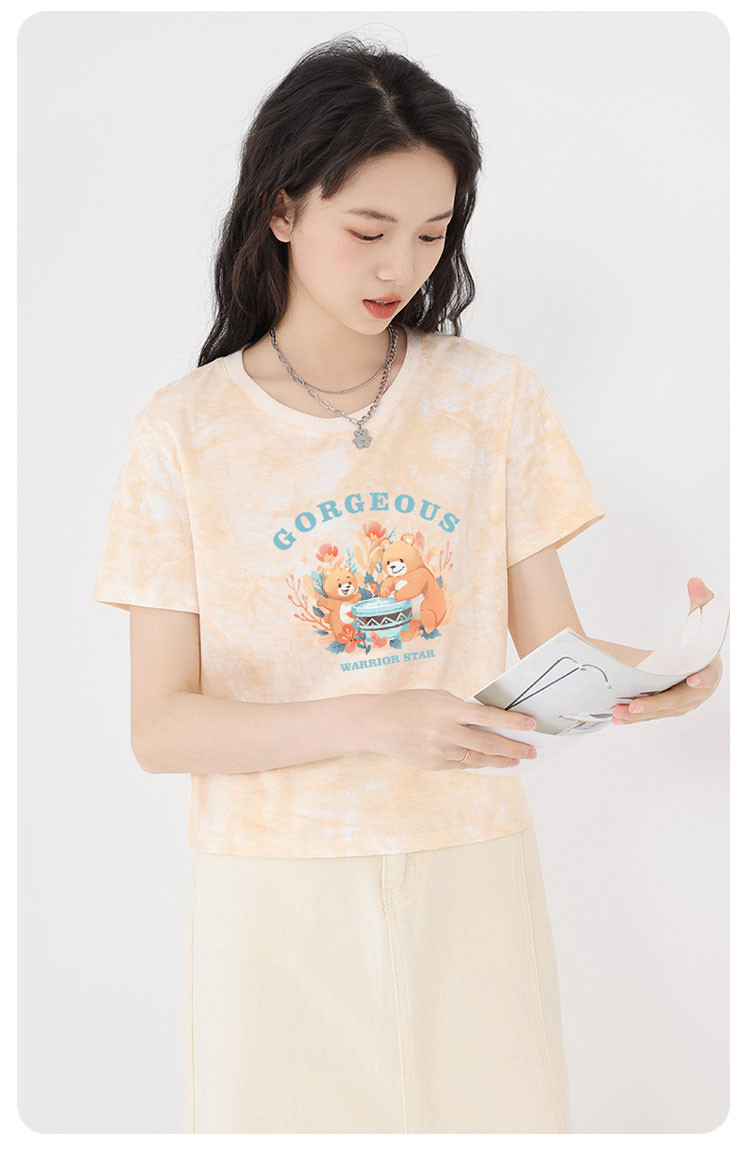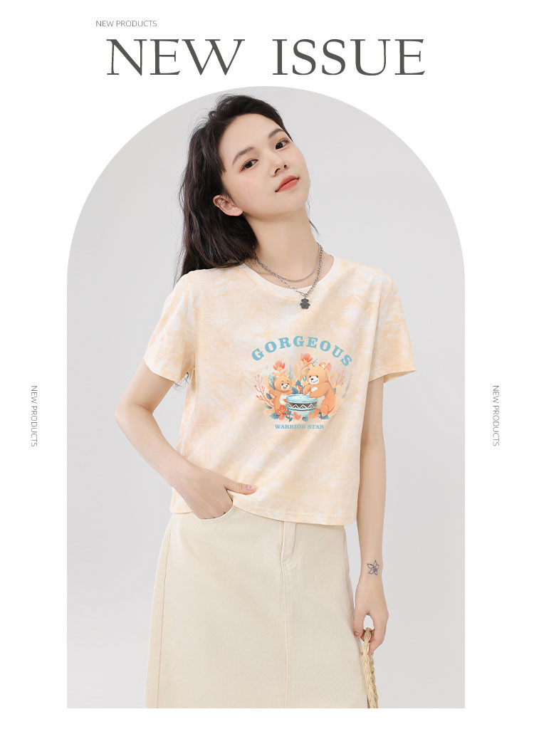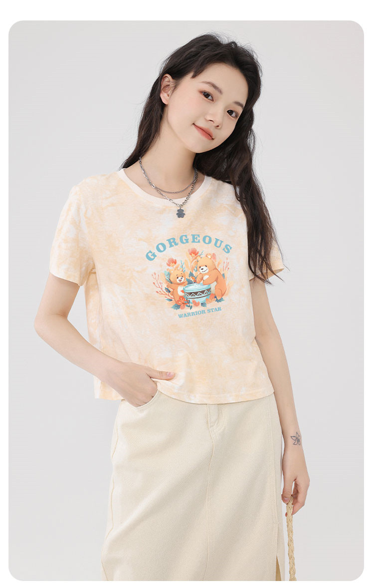 【女装100%棉】夏季扎染短袖纯棉女式T恤短款高腰显瘦设计感 114451