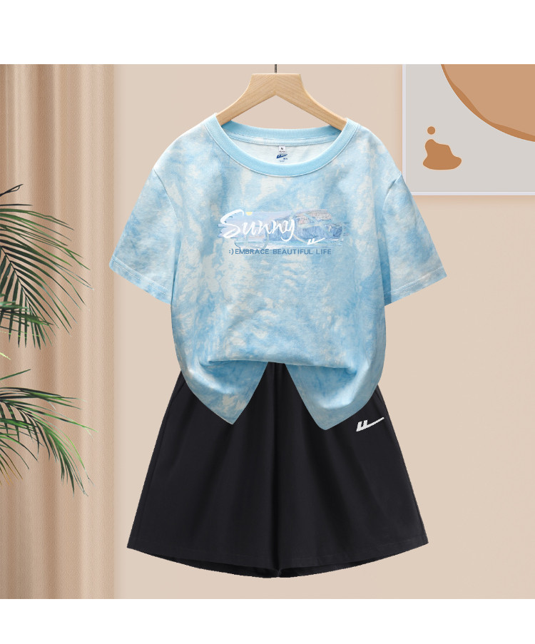 【女装】夏季运动套装女扎染短款T恤+斜纹棉三分裤纯棉两件套 930195