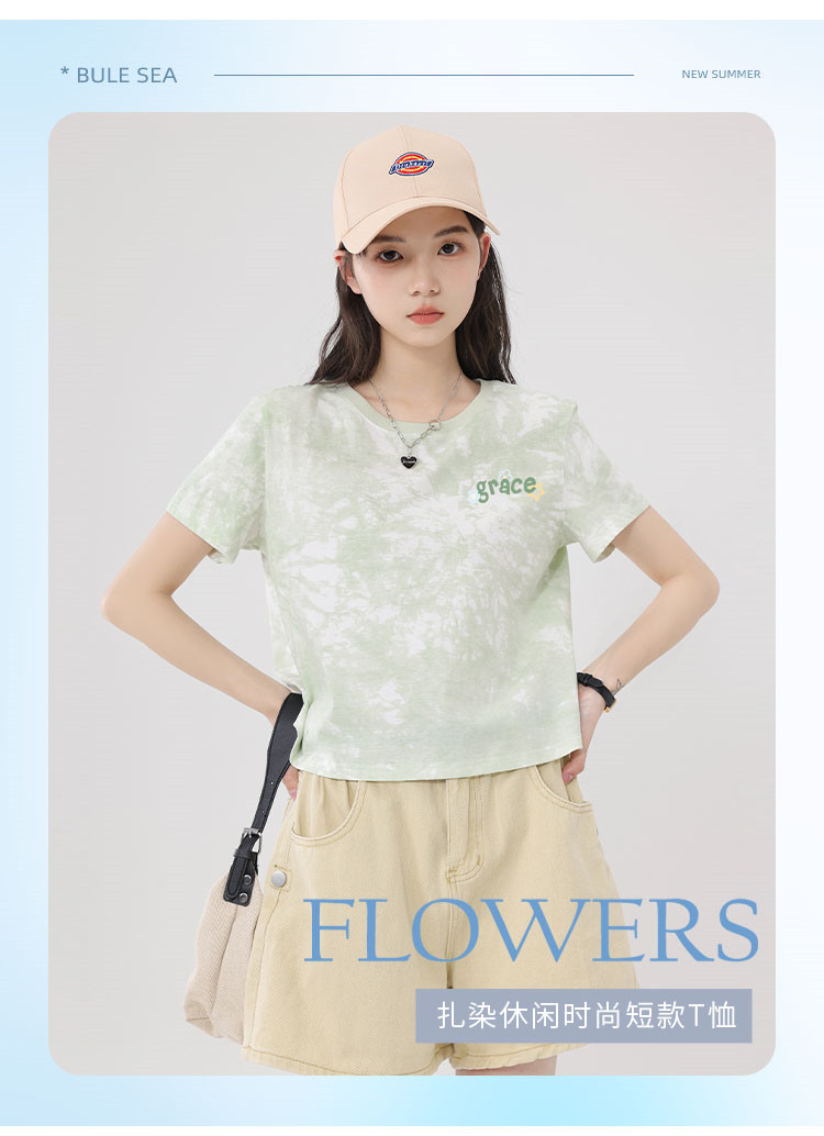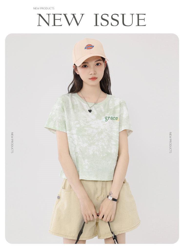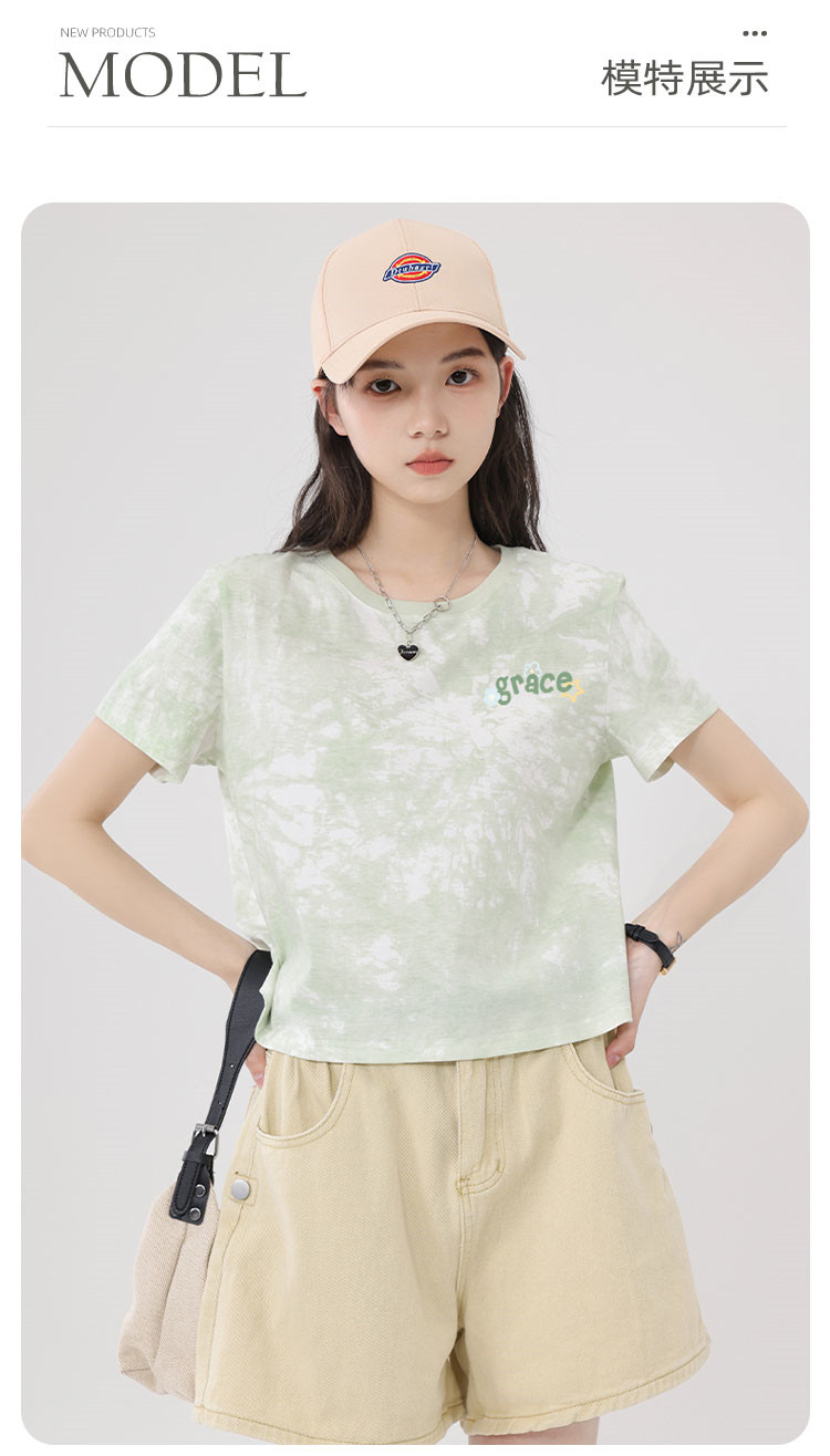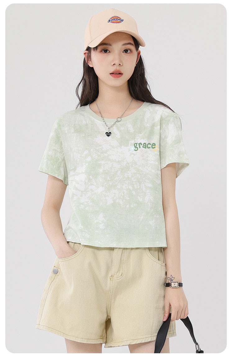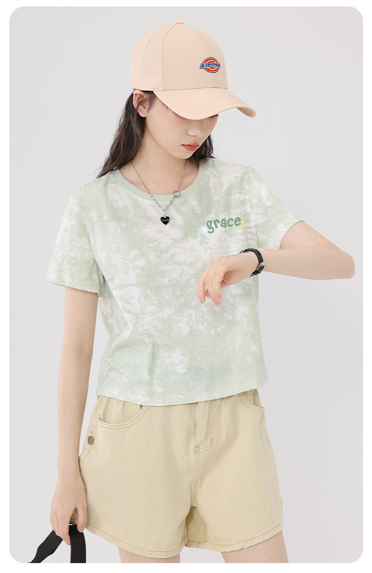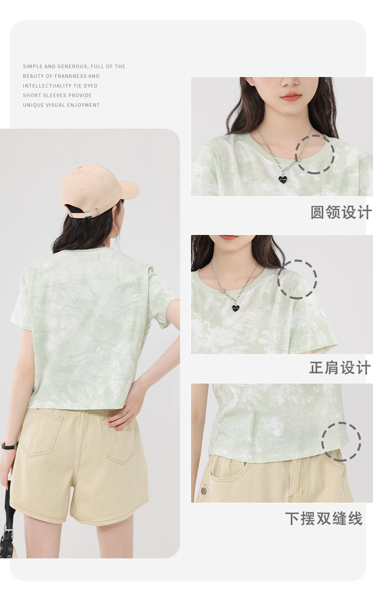 【女装100%棉】夏季扎染短袖纯棉女式T恤短款高腰显瘦设计感 487187