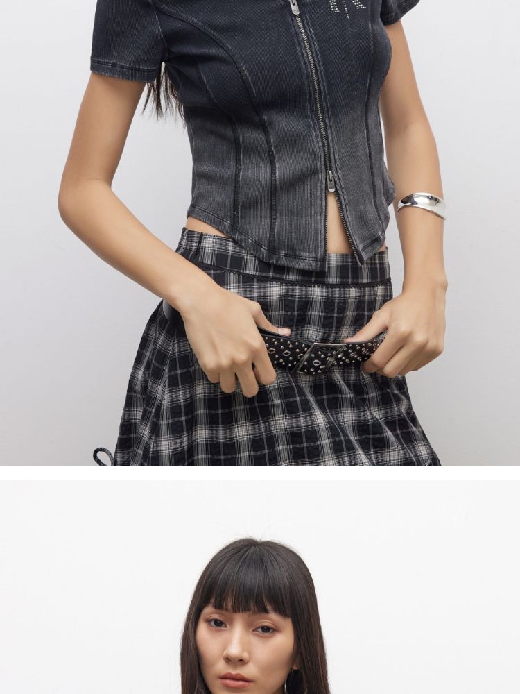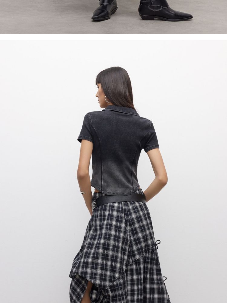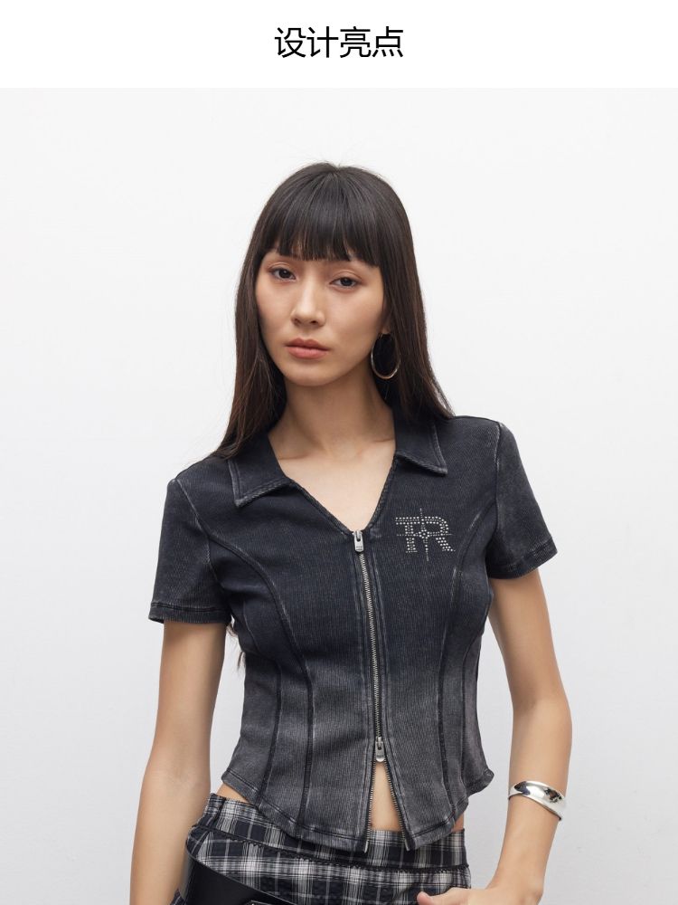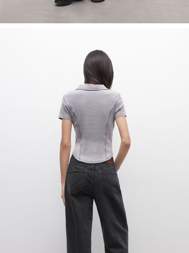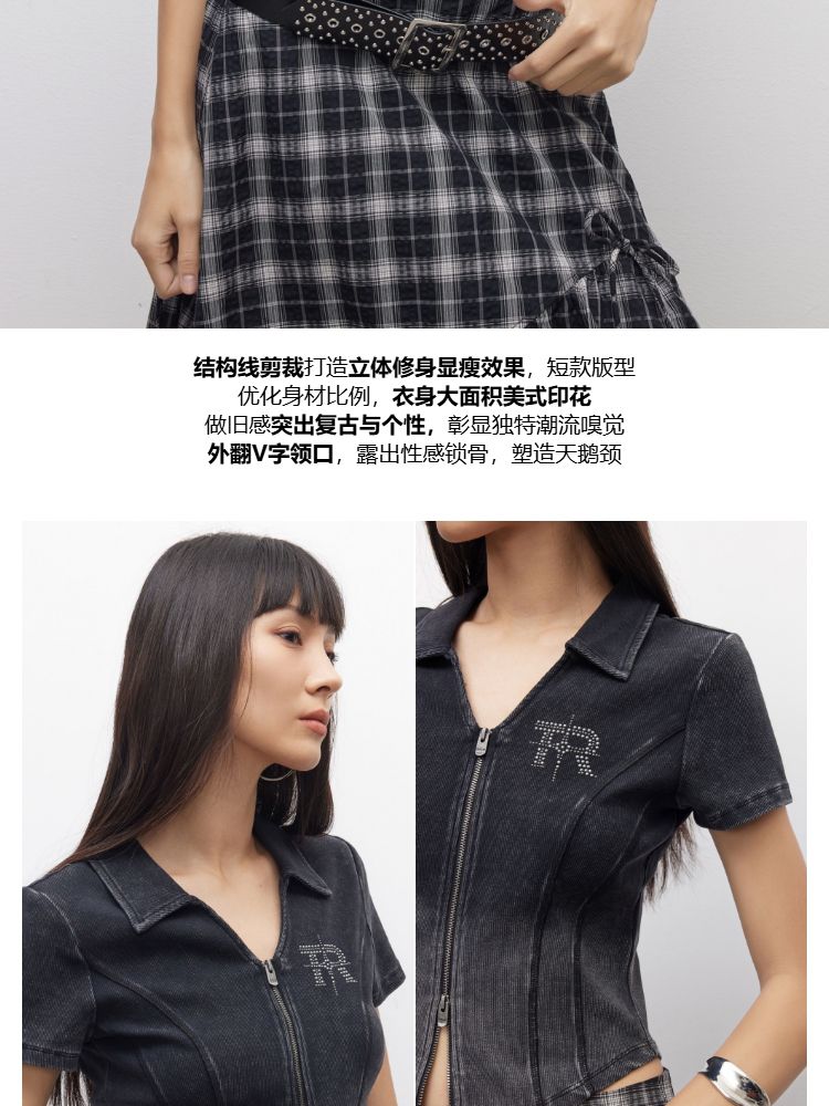 【做旧水洗】2025夏季V领显瘦正肩修身短款T恤女 071898