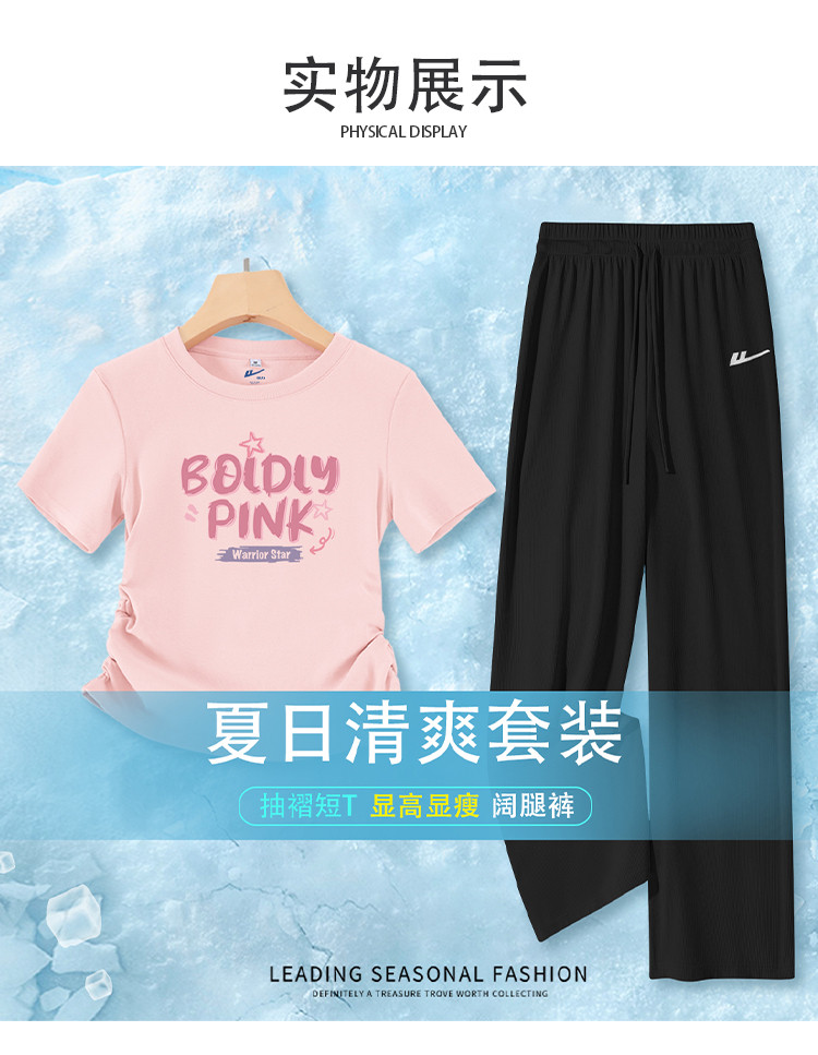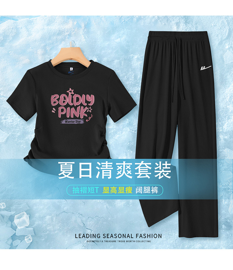 商品名称:【女装】夏季运动套装女抽褶短款T恤+薄款休闲阔腿裤清爽套装 872531