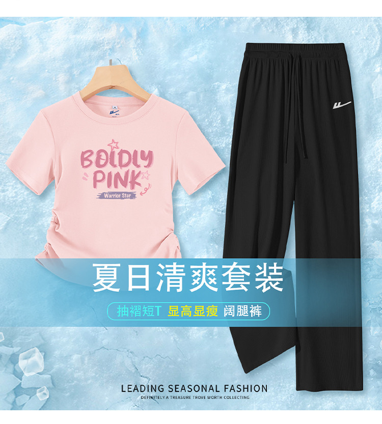 【女装】夏季运动套装女抽褶短款T恤+薄款休闲阔腿裤清爽套装 872531