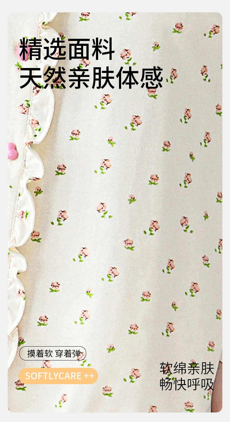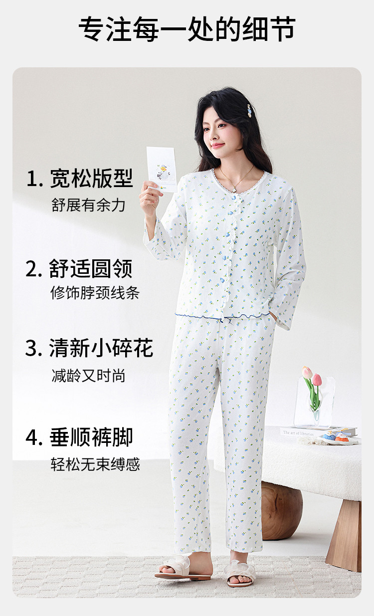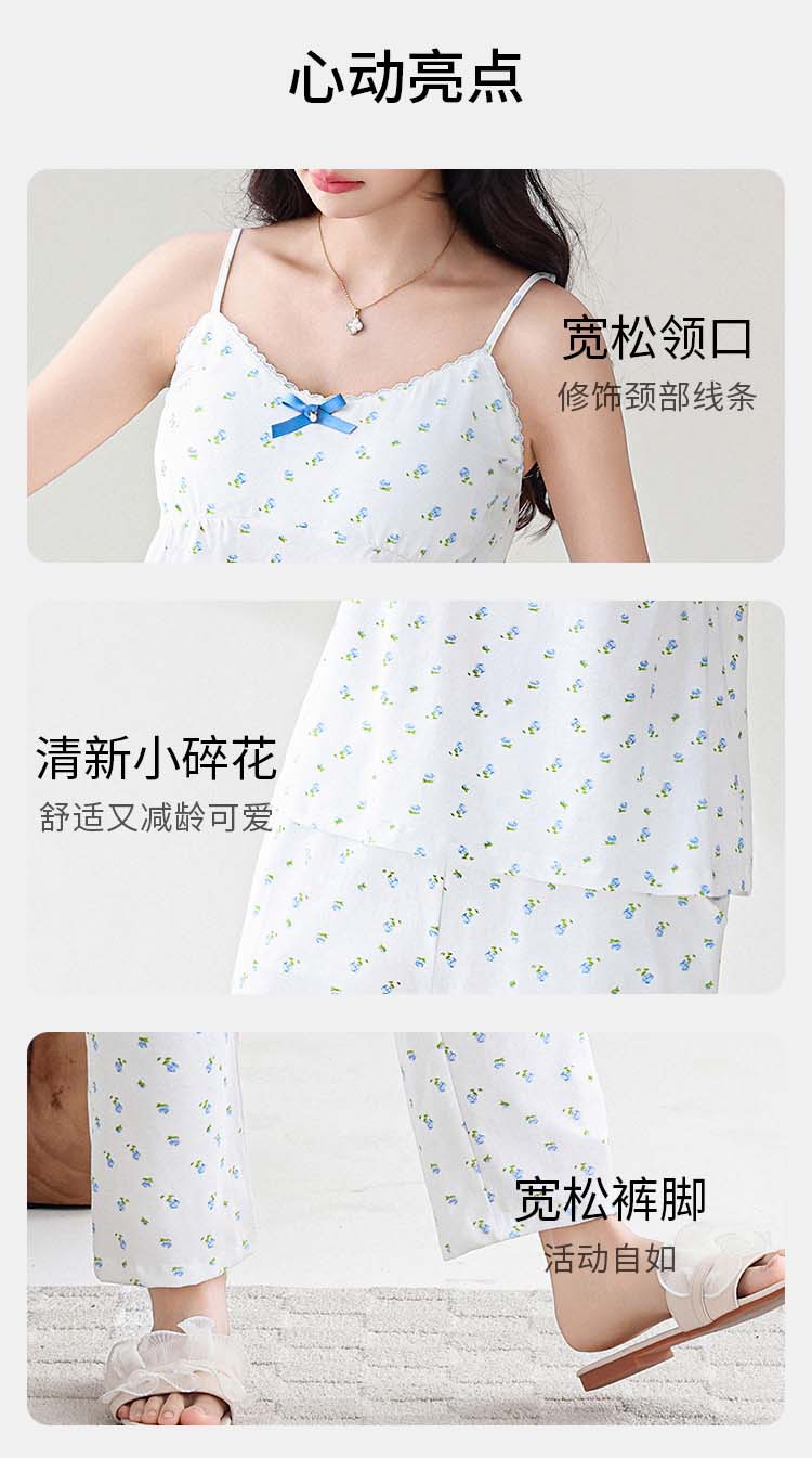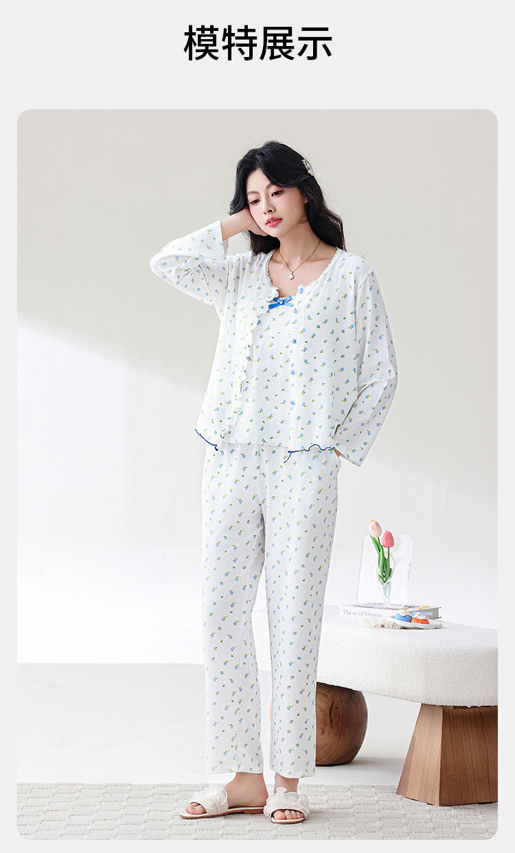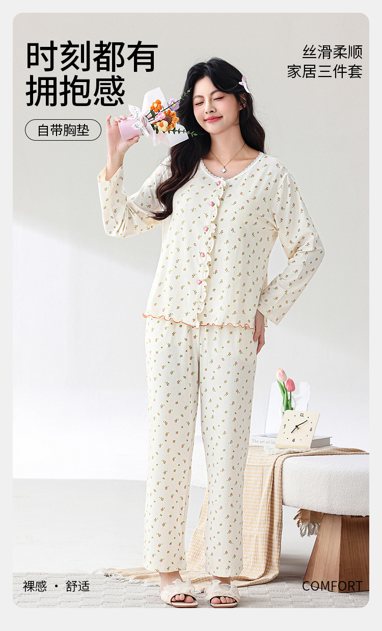 商品名称:【三件套系列】清新小碎花棉莫提花格带胸垫女士家居服睡衣 773067