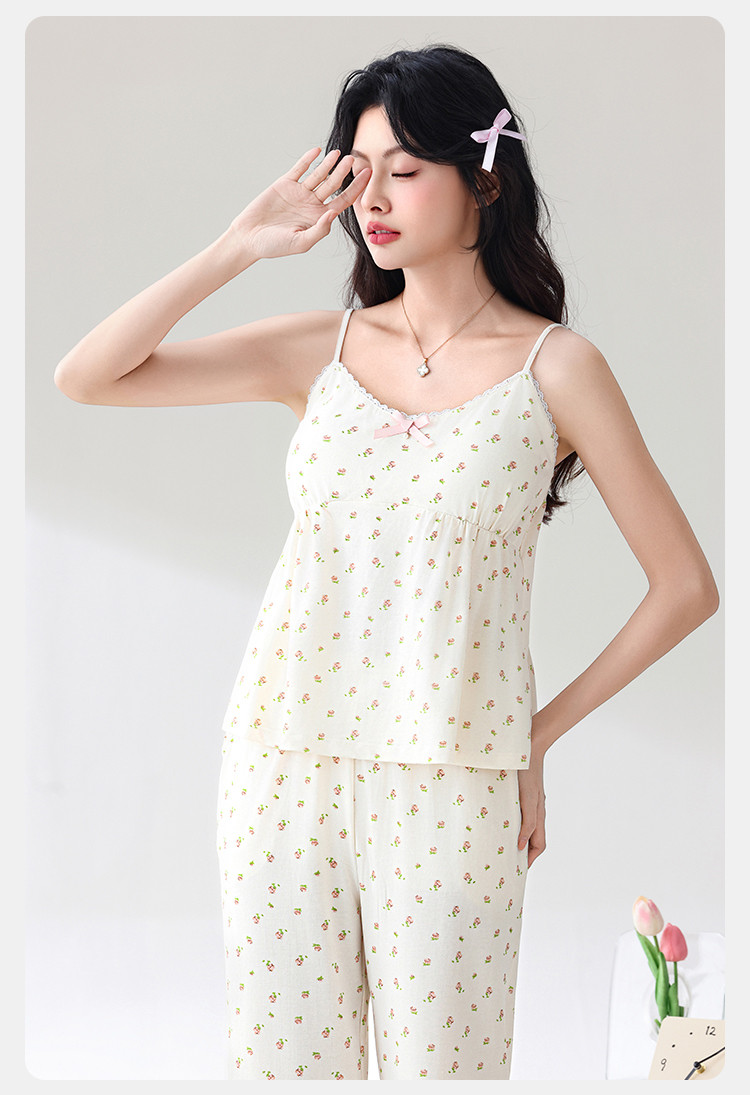 【三件套系列】清新小碎花棉莫提花格带胸垫女士家居服睡衣 773067