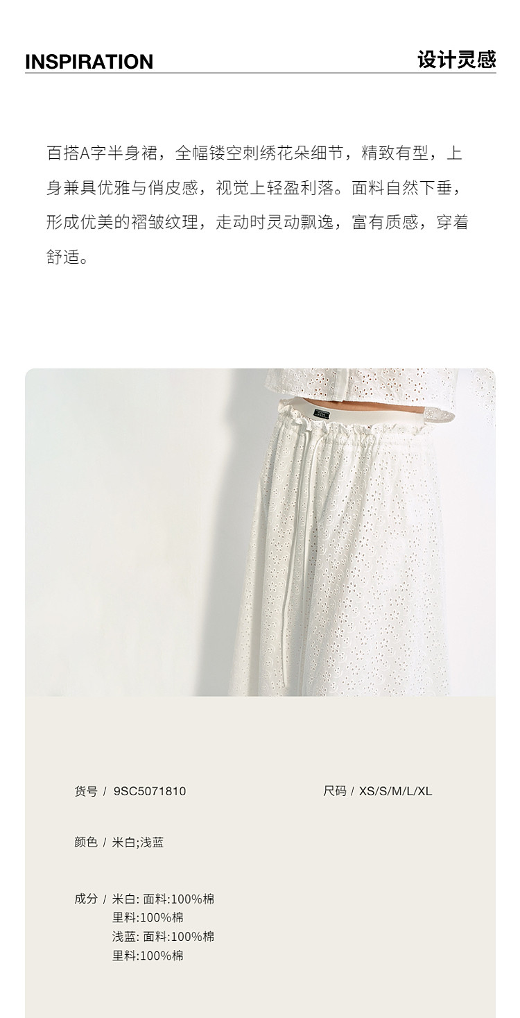 商品名称:限定系列OCH.夏装 中长镂空绣花A字100%棉高腰半身裙 677327