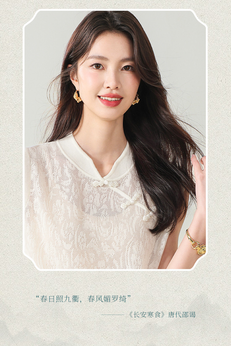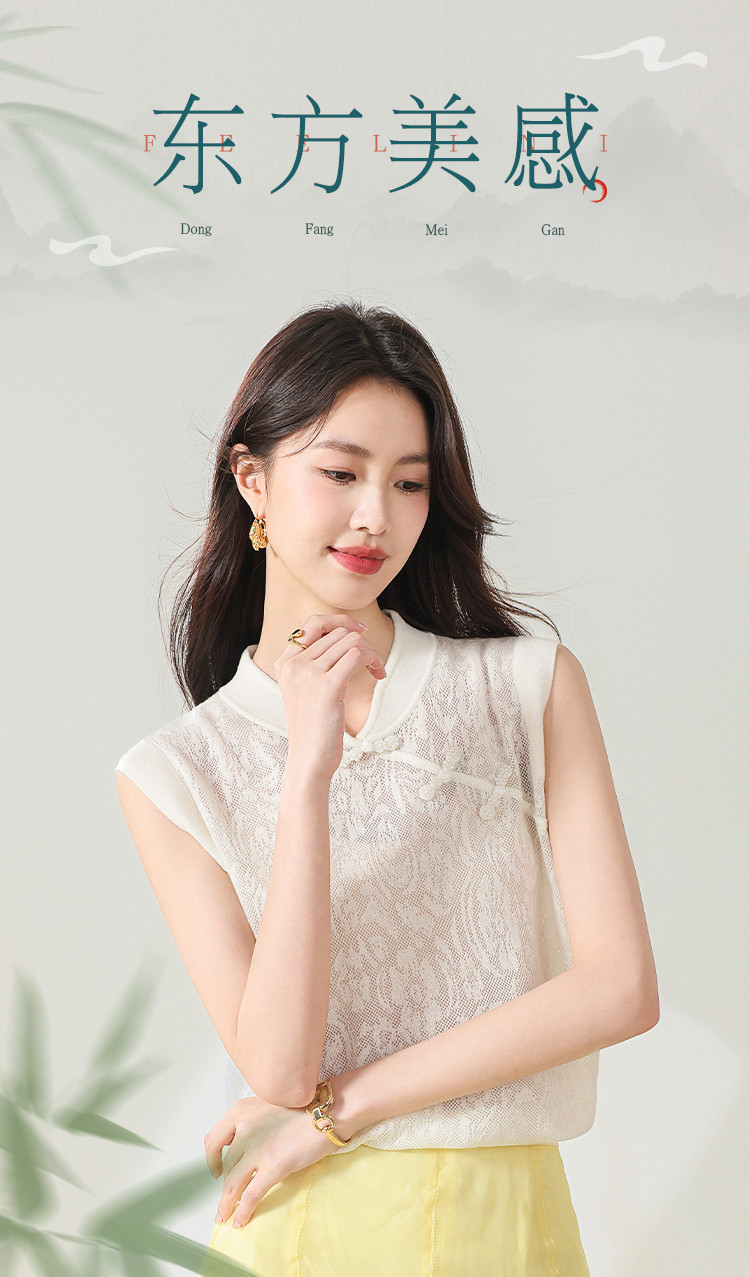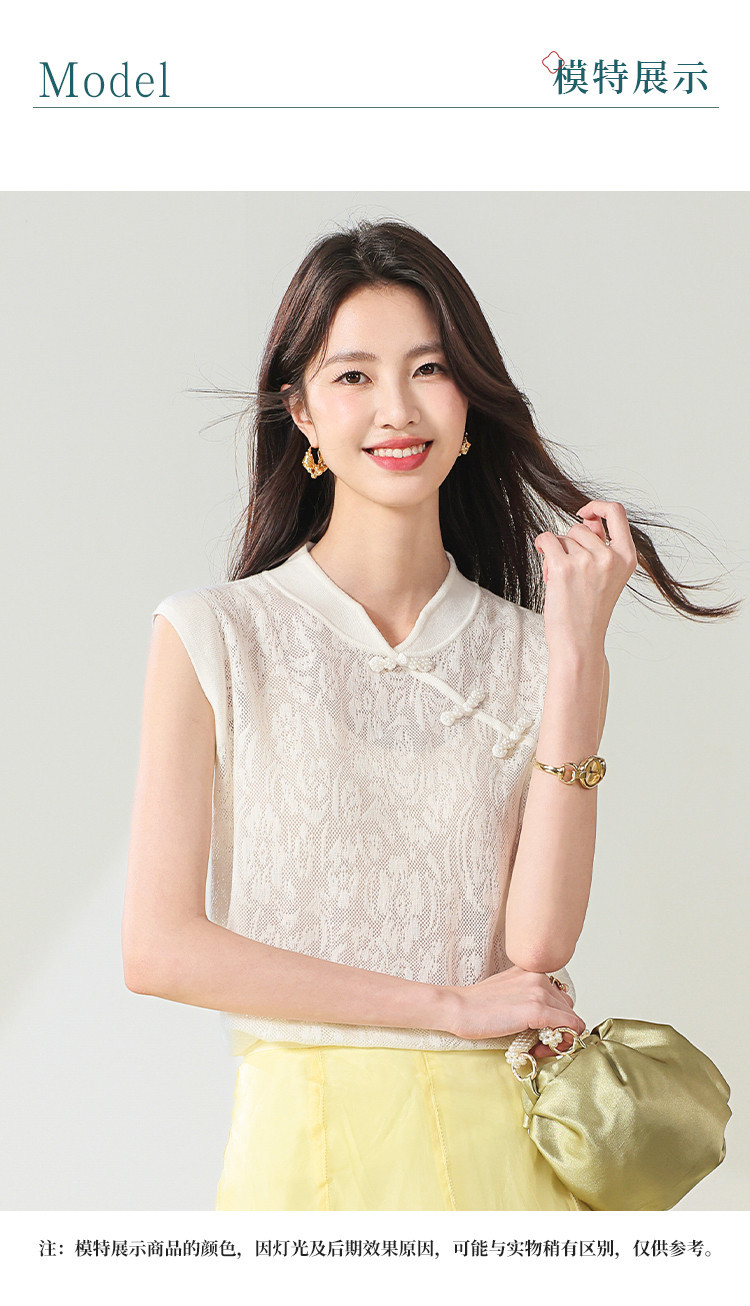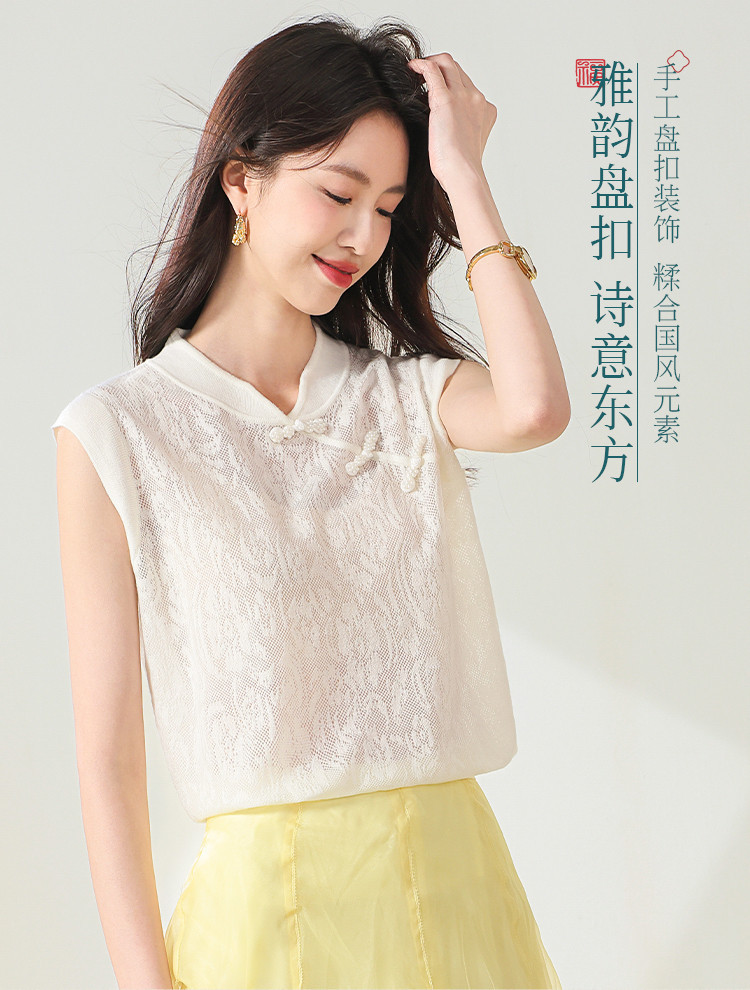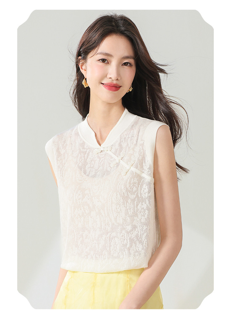 商品名称:【国风】新中式旗袍领精美镂空提花含绵羊毛针织打底背心无袖T恤 316691