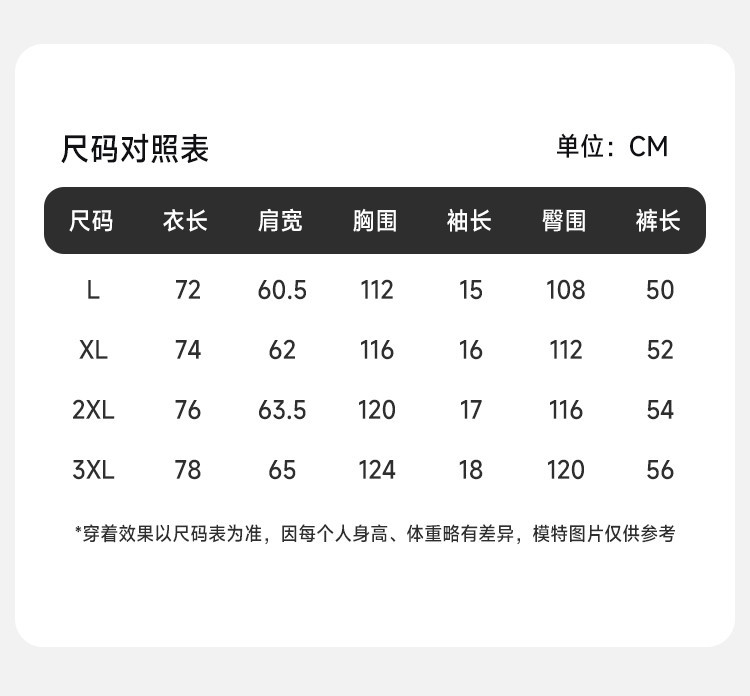 | 尺码 | 肩宽(cm) | 袖长(cm) | 上装号型 | 下装号型 | 衣长(cm) | 身高(cm) | 腰围(cm) | 裤长(cm) | 体重(kg) | 臀围(cm) | 胸围(cm) | 号型 |