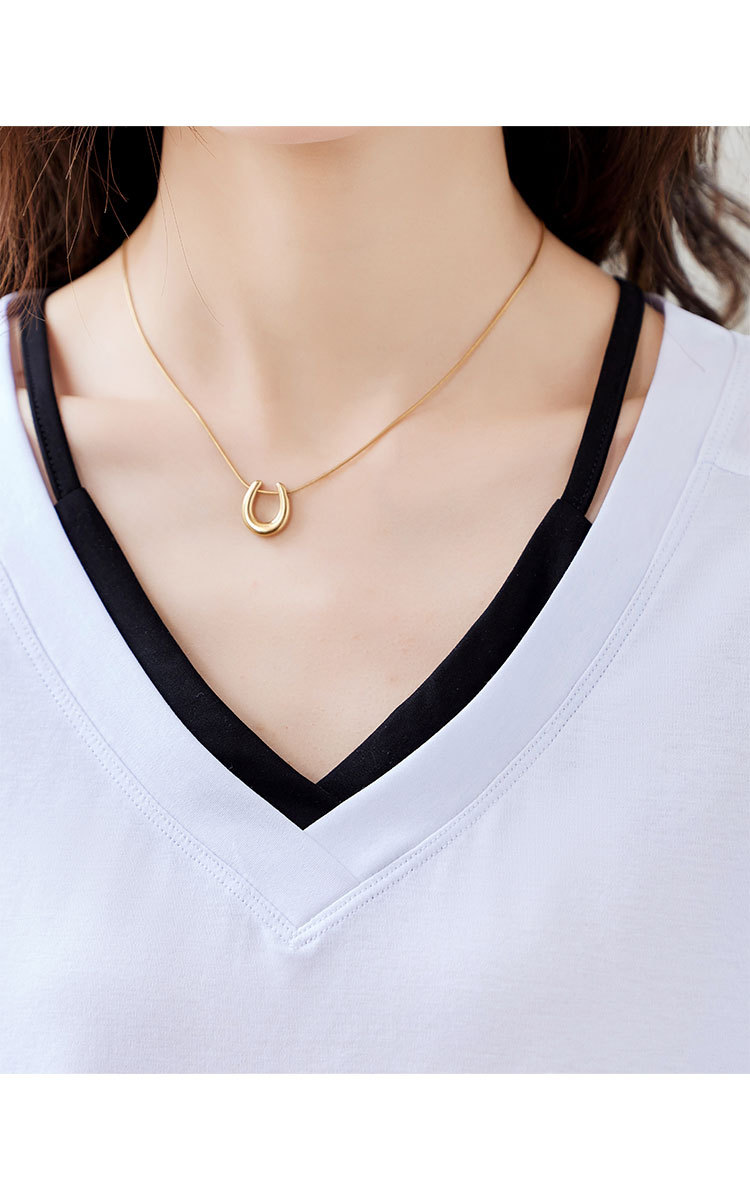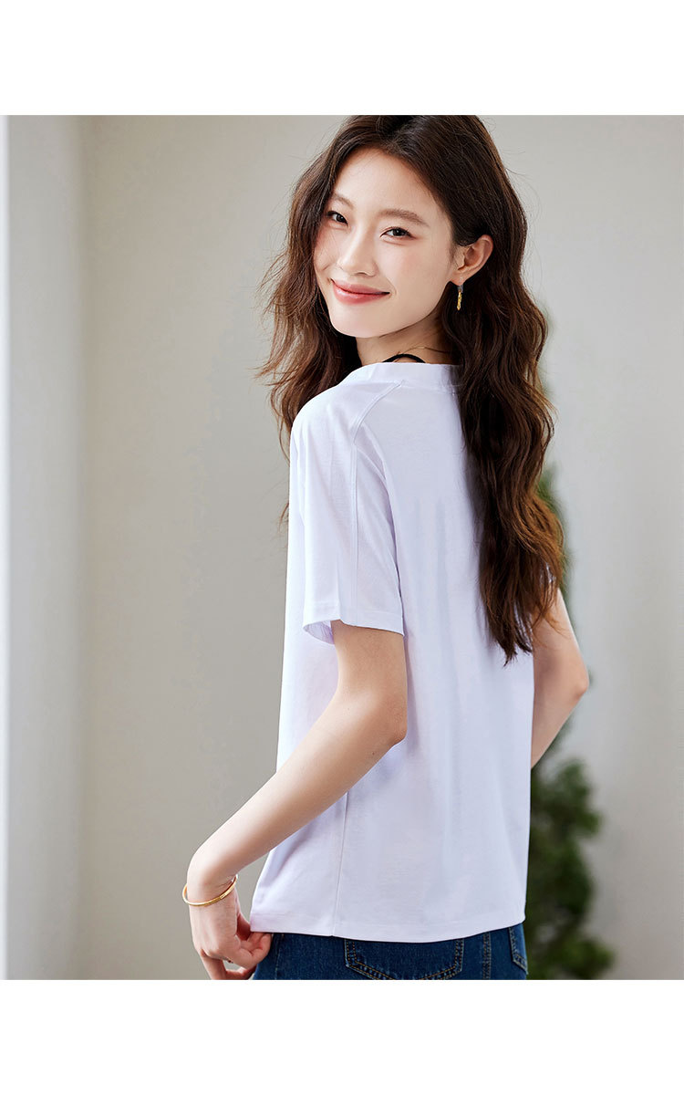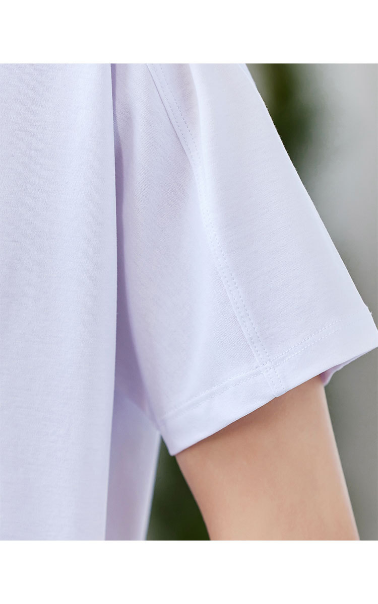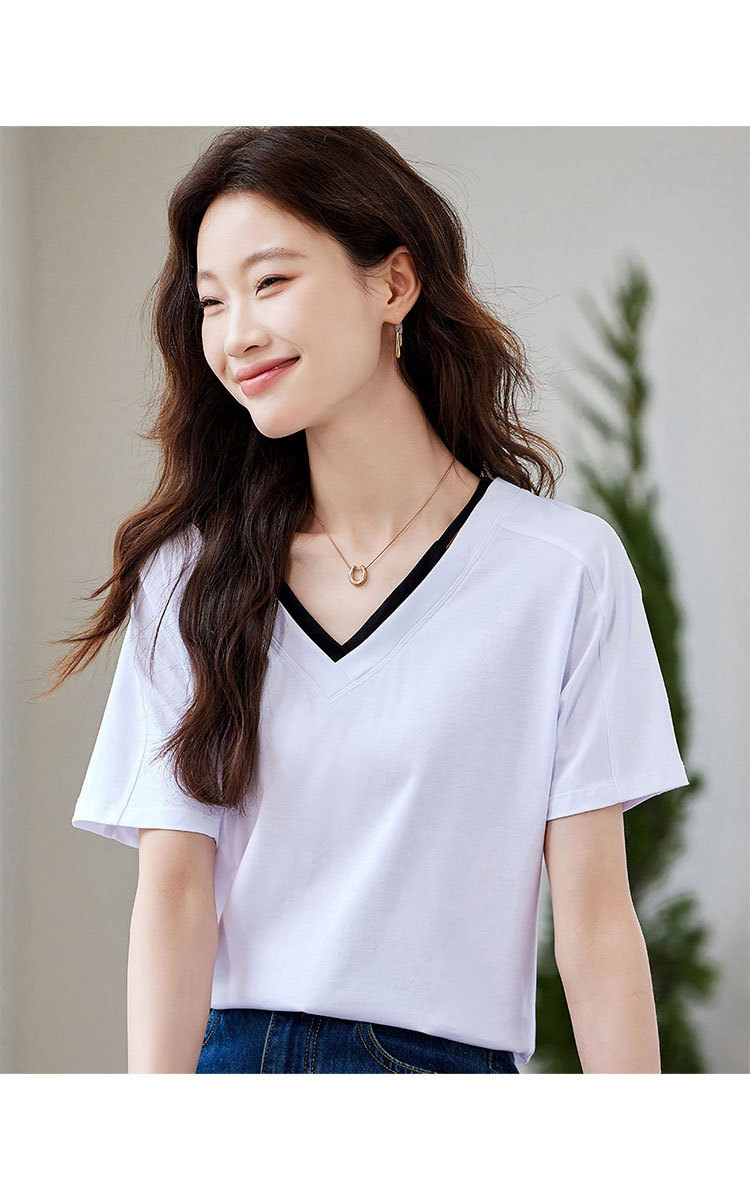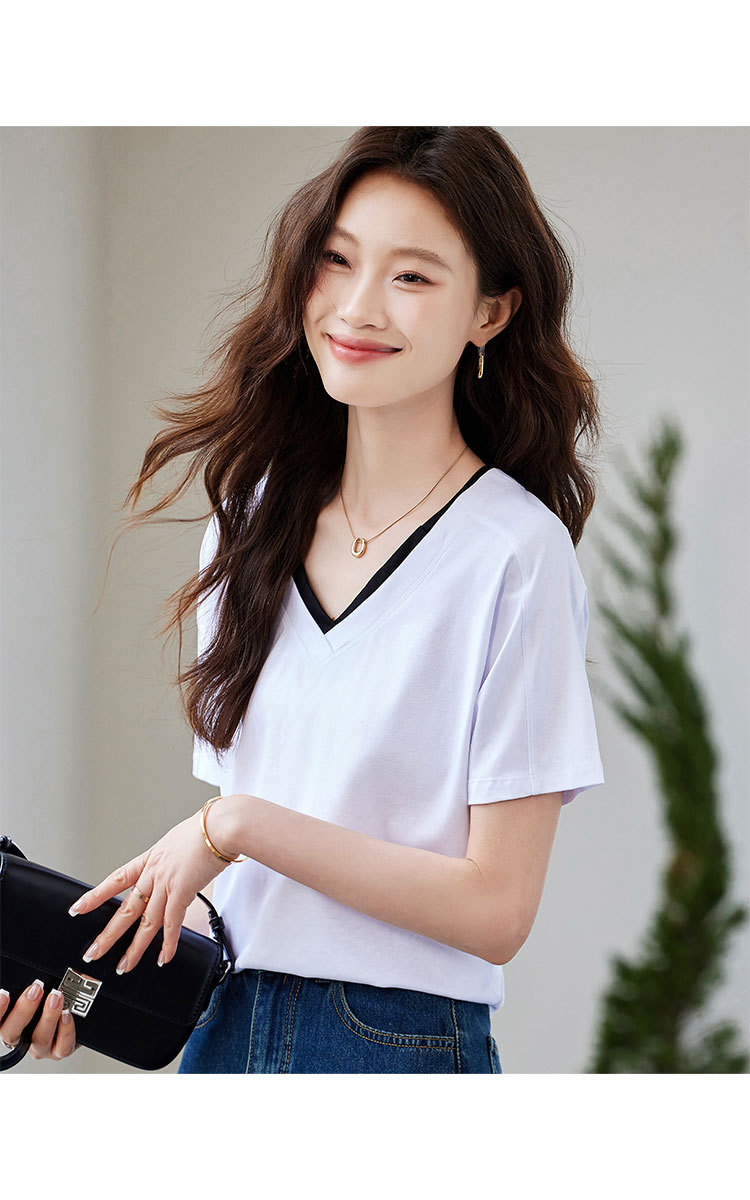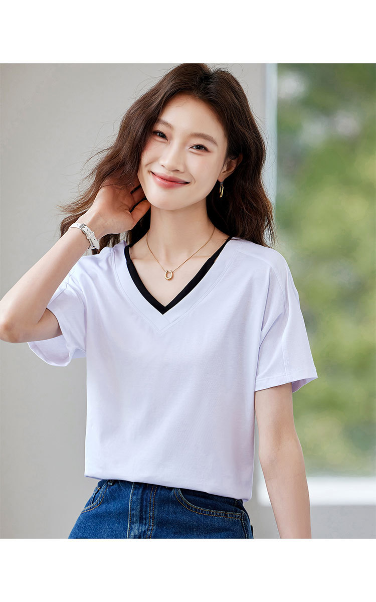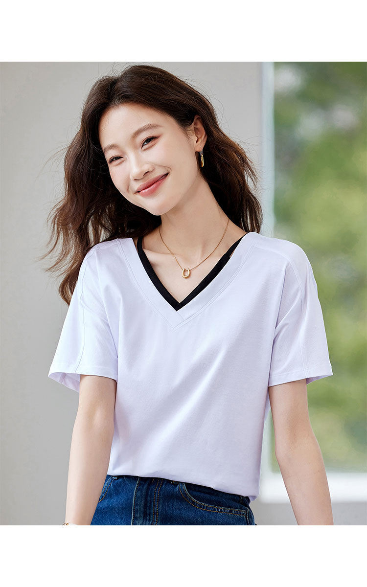 商品名称:【丝光棉】假两件拼色t恤夏季宽松遮肉女式短袖简约上衣女 204575