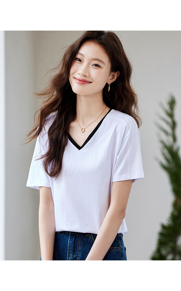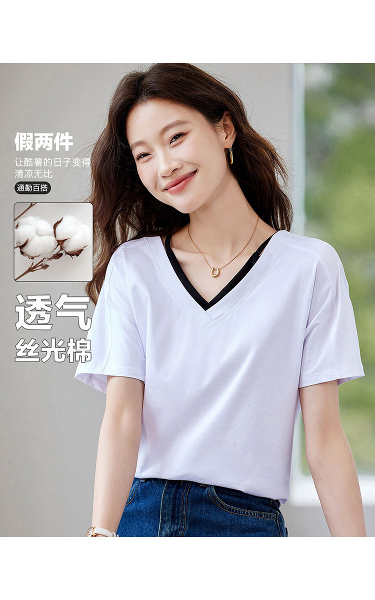 【丝光棉】假两件拼色t恤夏季宽松遮肉女式短袖简约上衣女 204575