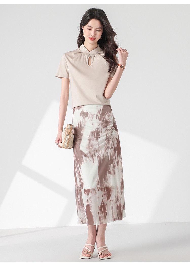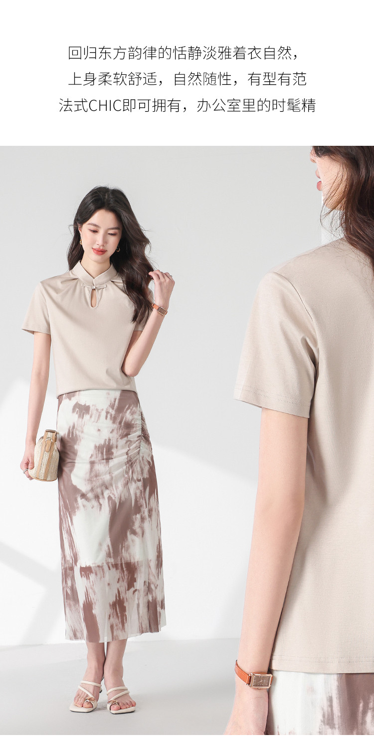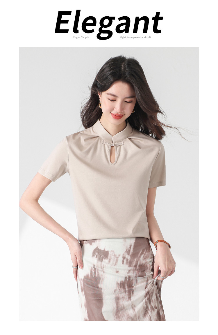 【新中式】旗袍领纯色短袖T恤含桑蚕丝上衣 306963