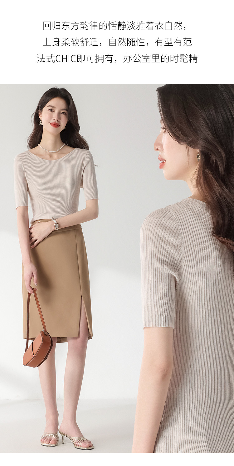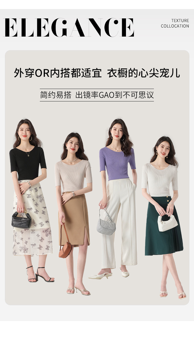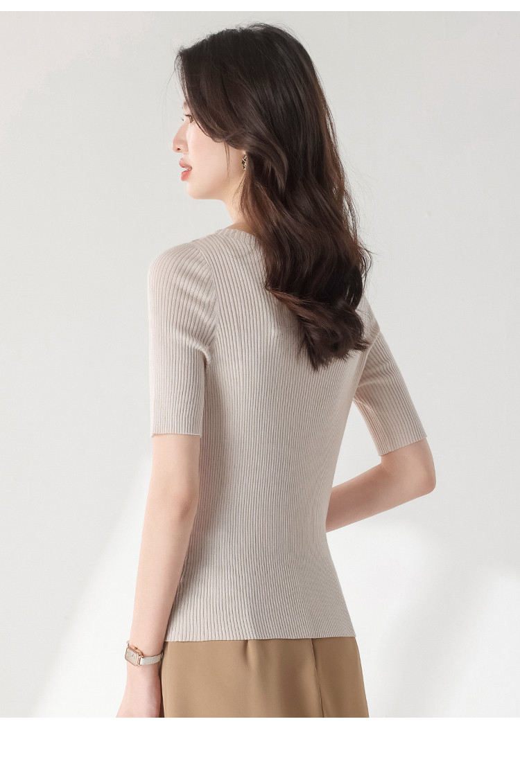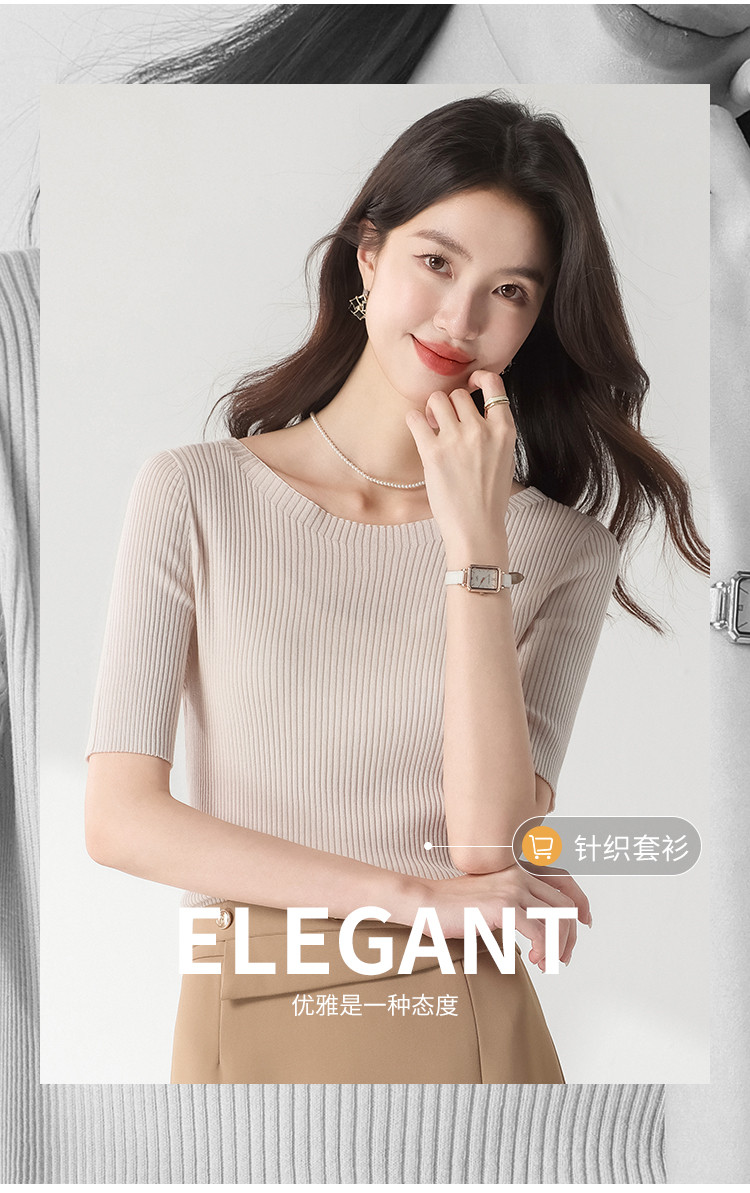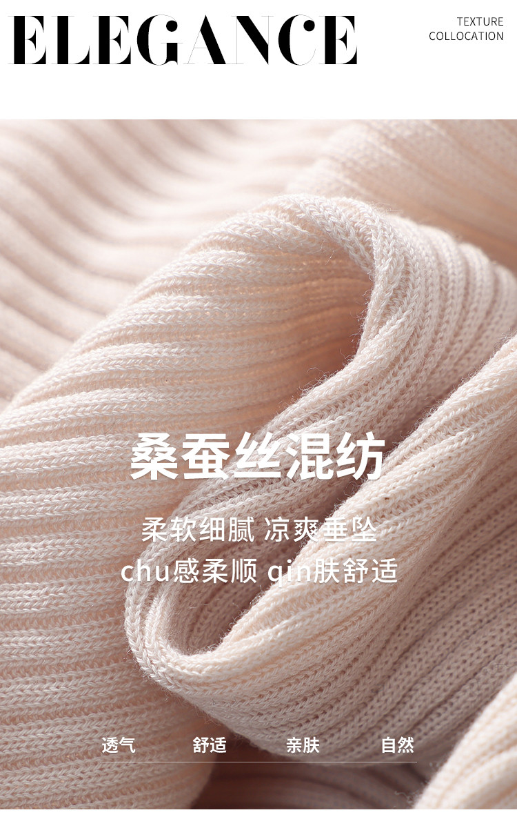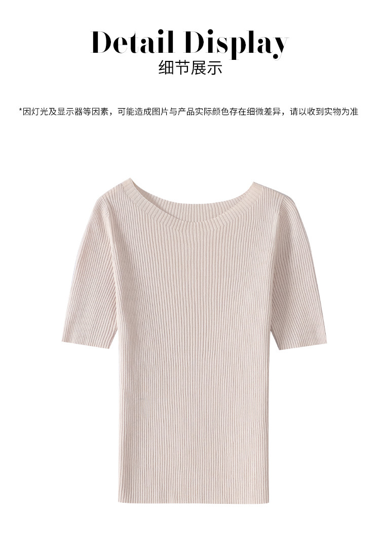 商品名称:【含桑蚕丝】圆领抽条针织衫纯色简约针织五分袖T恤打底衫 942035