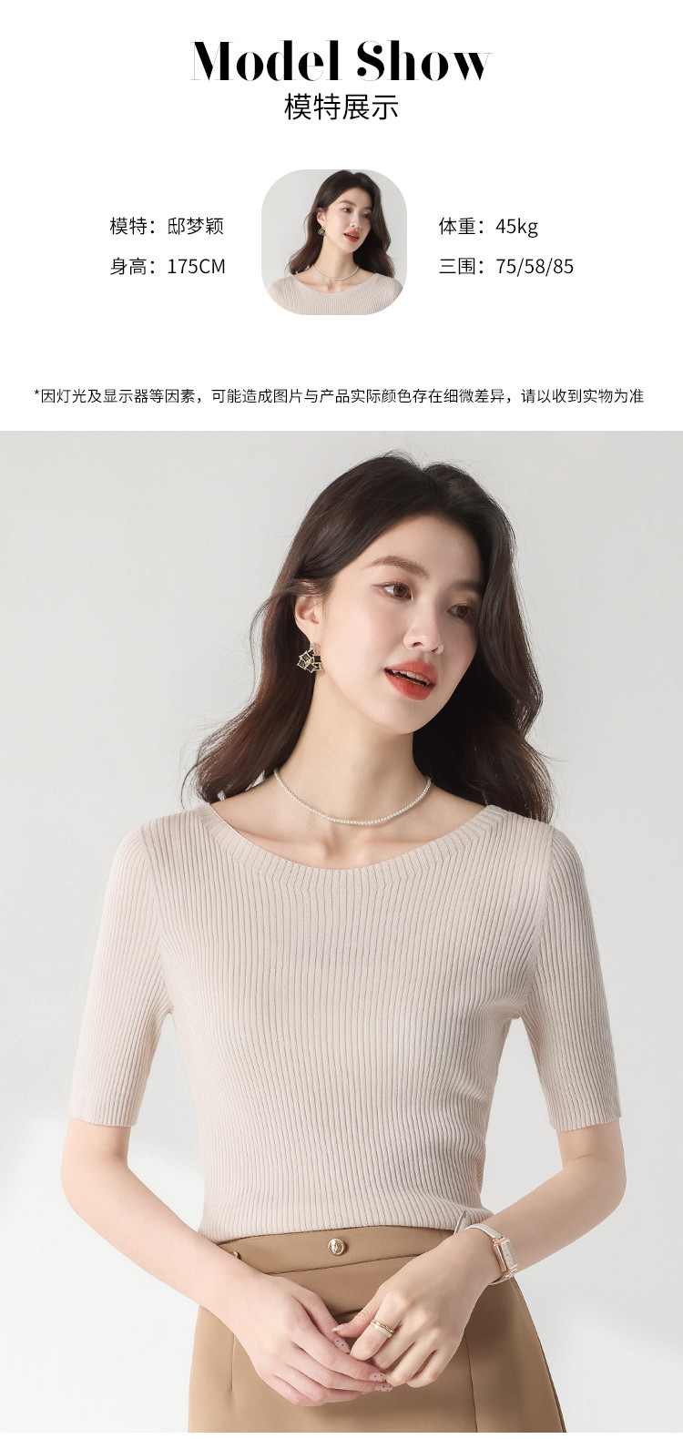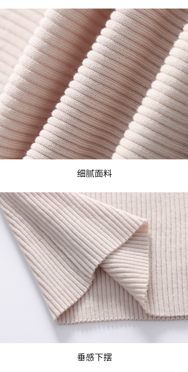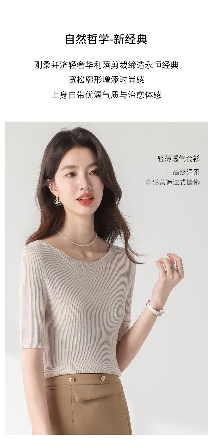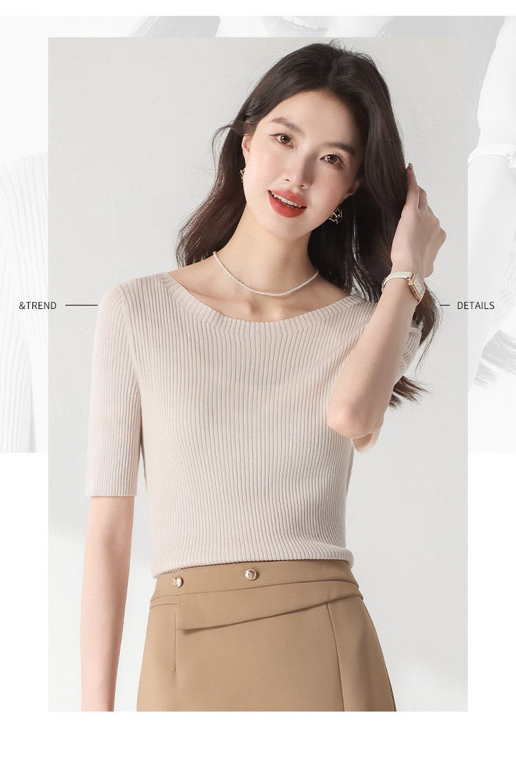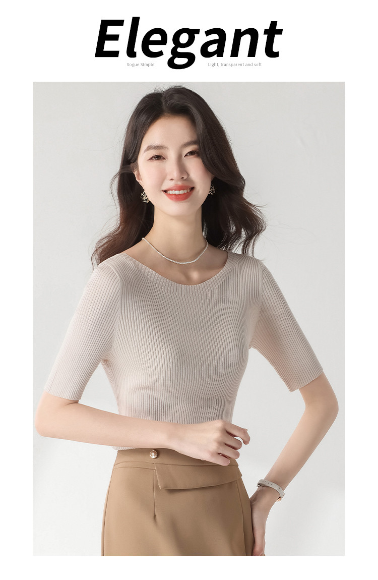 商品名称:【含桑蚕丝】圆领抽条针织衫纯色简约针织五分袖T恤打底衫 942035
