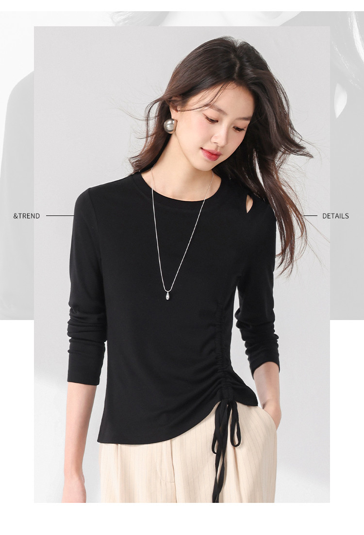 法式圆领纯色绳结针织衫女套头时尚休闲含桑蚕丝长袖T恤打底衫薄 346067