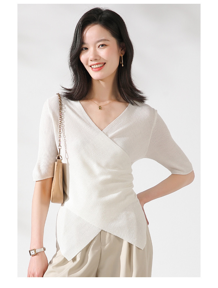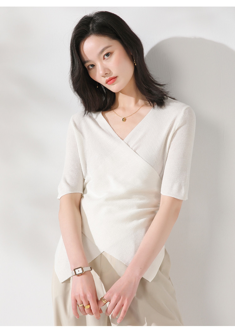 【含羊毛 纯色百搭】交叉领上衣短袖T恤针织衫打底衫毛衣 675411