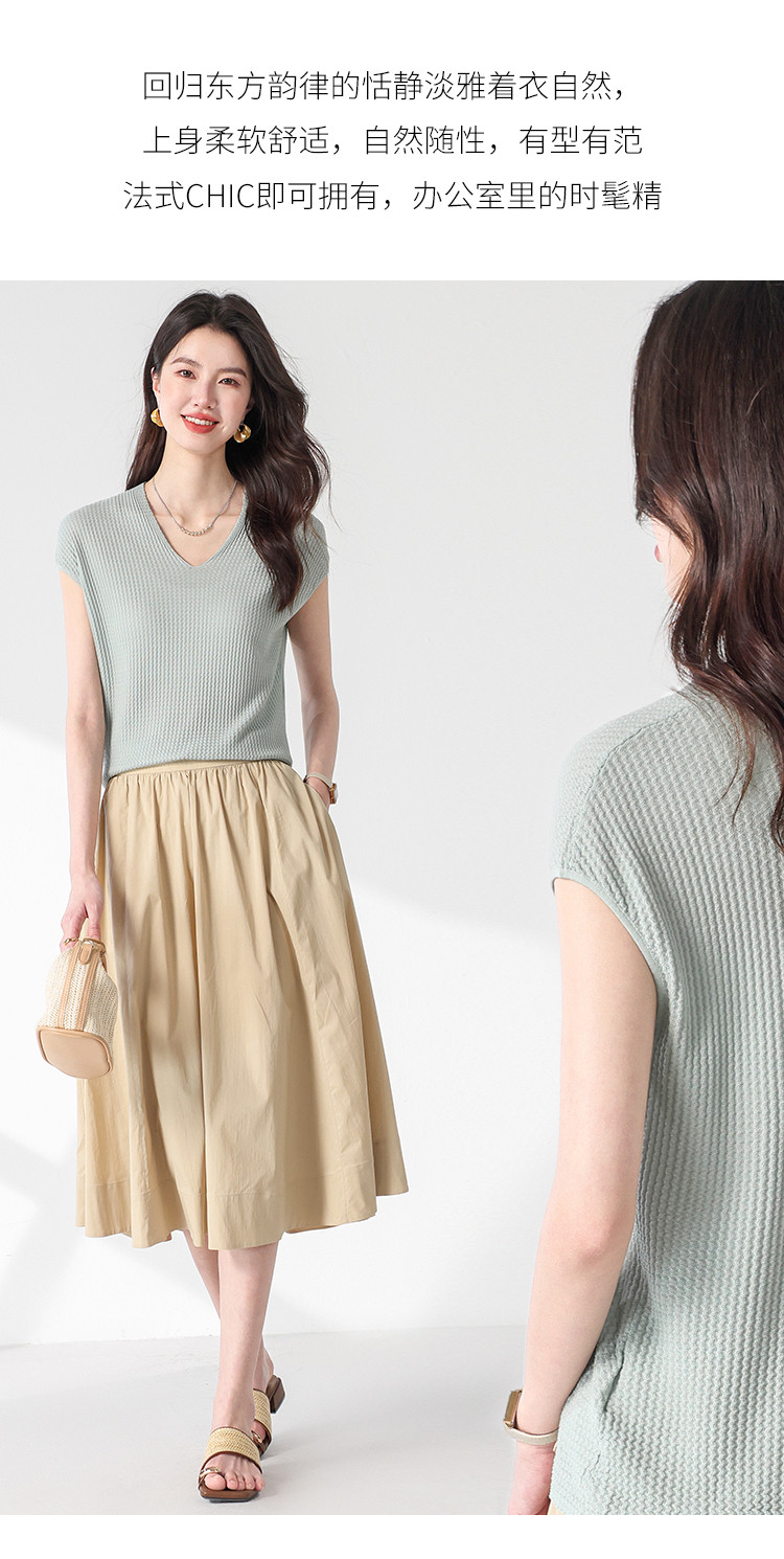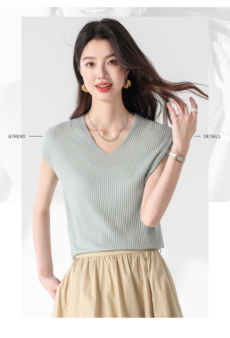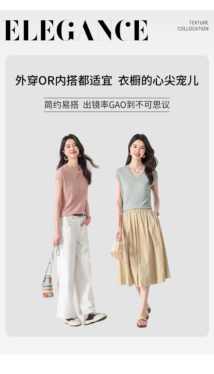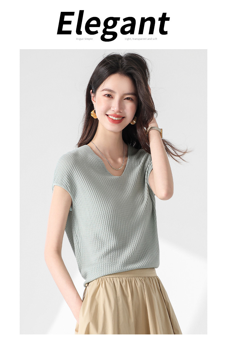 商品名称:V领纯色春夏薄款针织衫女含桑蚕丝休闲短袖T恤简约针织上衣 477971