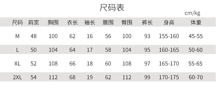 | 尺码 | 肩宽(cm) | 袖长(cm) | 上装号型 | 下装号型 | 衣长(cm) | 身高(cm) | 腰围(cm) | 裤长(cm) | 体重(kg) | 臀围(cm) | 胸围(cm) | 号型 |