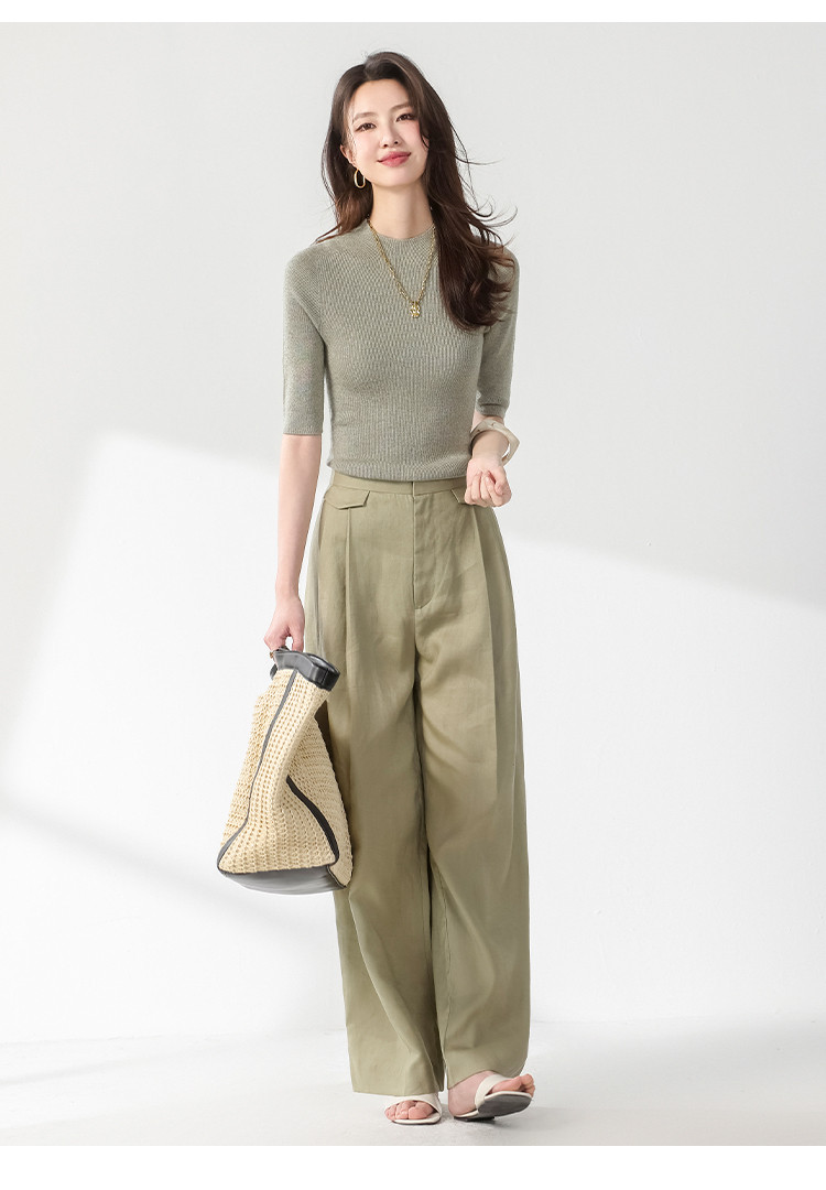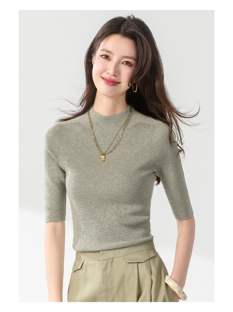 精纺85%羊毛~凉感圆领纯色羊毛衫女五分袖T恤针织衫打底衫薄 593683